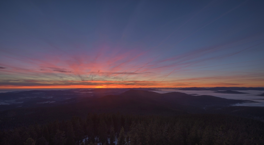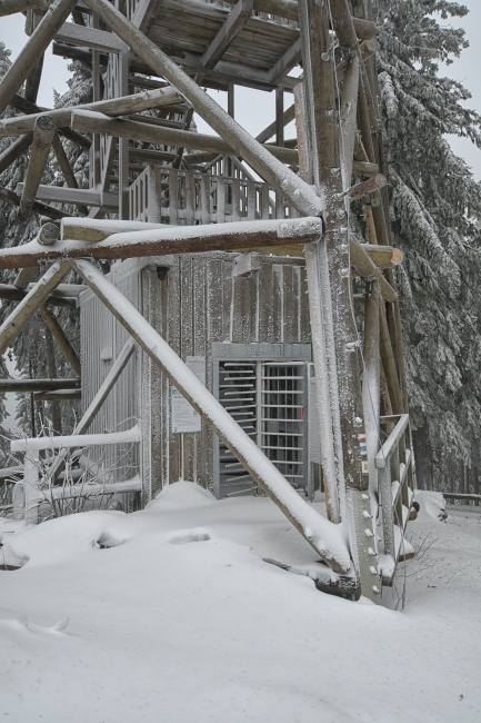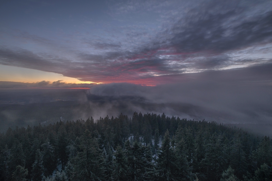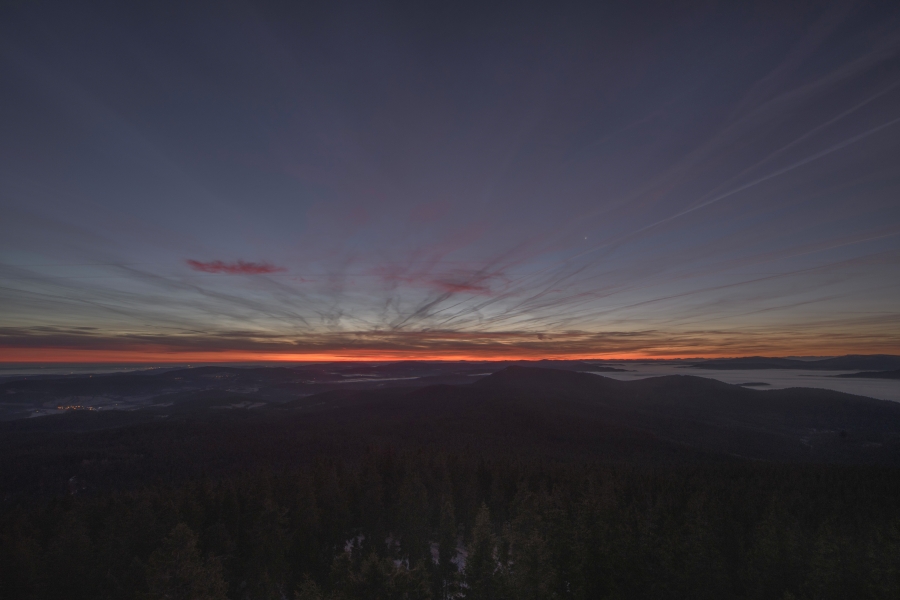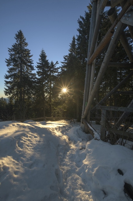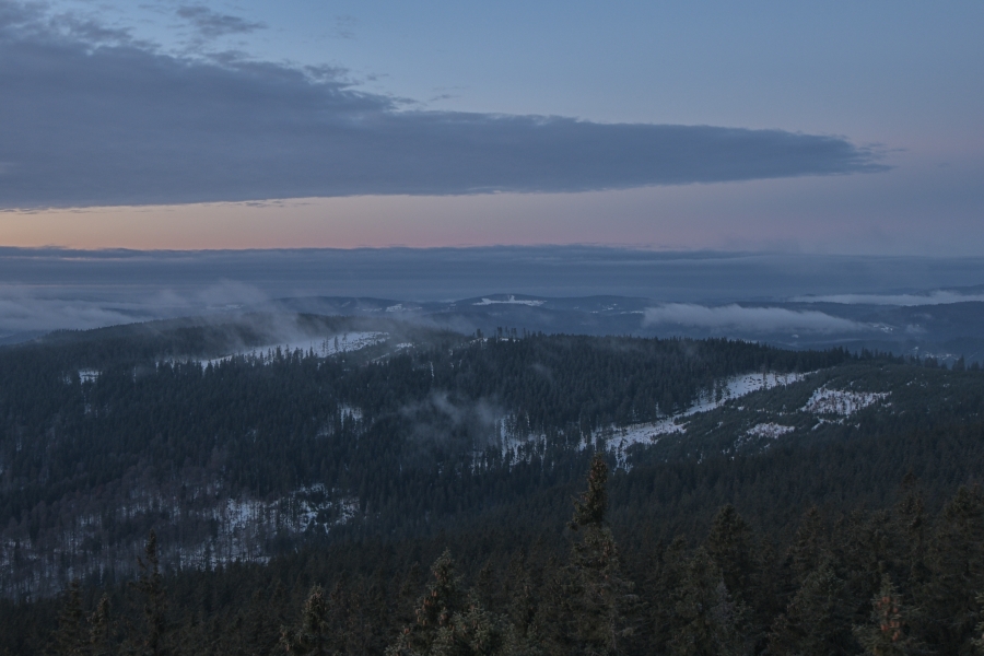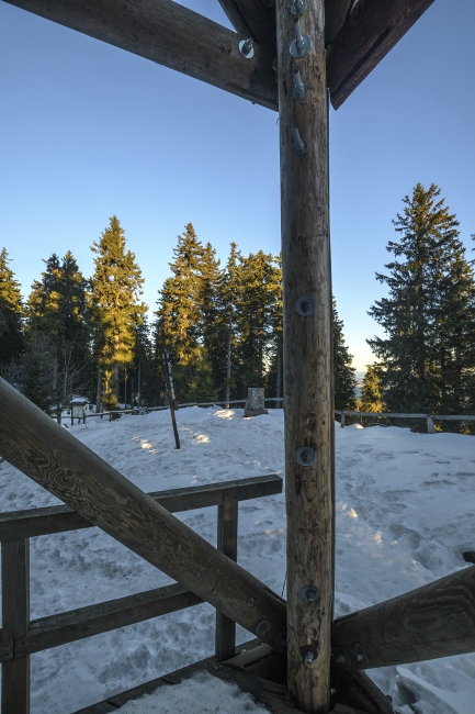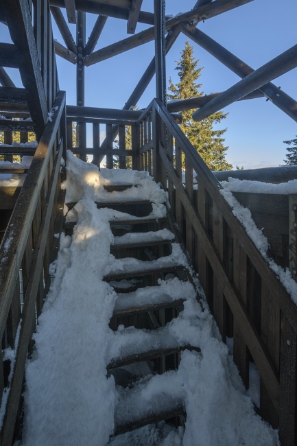 … přičemž všechna ta nádhera byla zcela bezproblémově zachytitelná zásluhou překvapivě nízké návštěvnosti rozhledny, již soustavně nerozechvívalo nepřetržité dupání po schodech – úhlavní to nepřítel dlouhých fotografických expozičních časů. Těžko říci, jestli většina skalních příznivců silvestrovských výstupů zlenivěla, případně v minulosti svou účast vázala na zvláštní silvestrovské vlaky, jejichž éra, jak se zdá, skončila vlivem covidových let, ale příznivcům fotografování tu někdejší přívaly turistů rozhodně nechyběly.