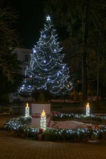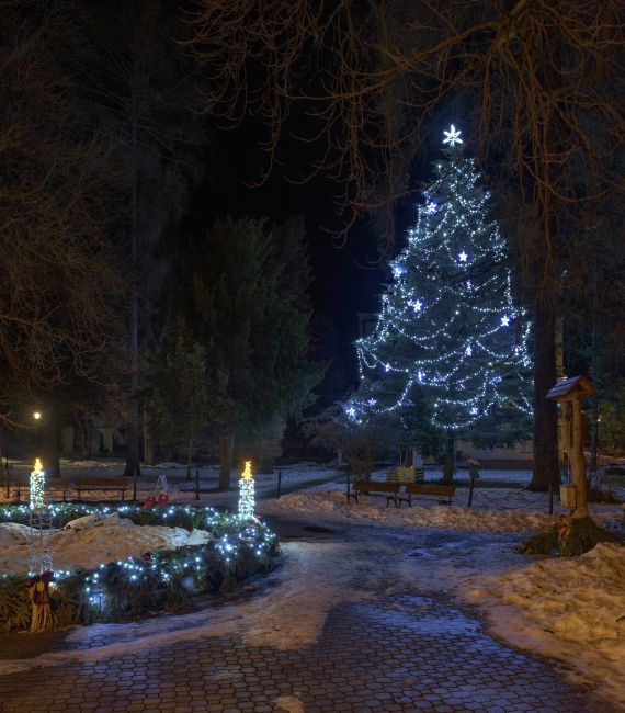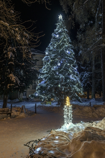 Vánoční strom se bude rozsvěcet – a ke všemu namísto náměstí opět v městském parku – až zítra, ale jeden už tu s nemalým půvabem, za nějž vděčí právě sněhu, přece září.