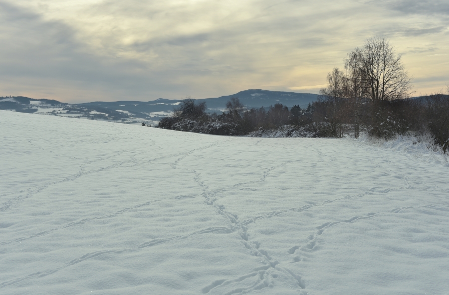 Zajímavějšími, ba výtvarnou fantazii podněcujícími jsou ovšem viditelné pozůstatky čilého dění, které se zjevně odehrávalo na polích a lukách, dokud ještě odpočívaly pod souvislými hlubokými bělostnými peřinami.