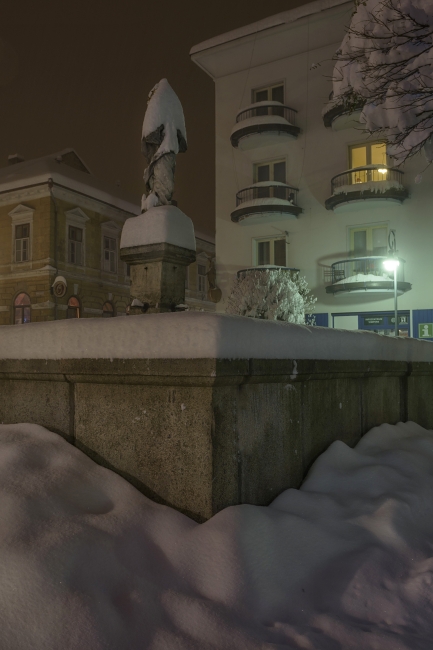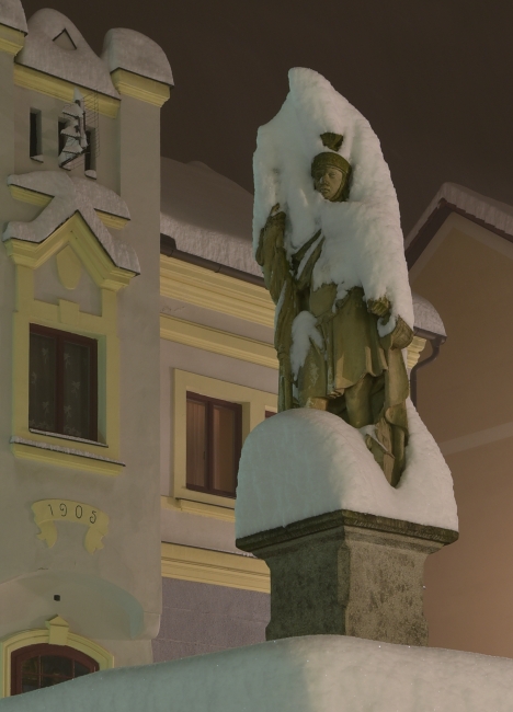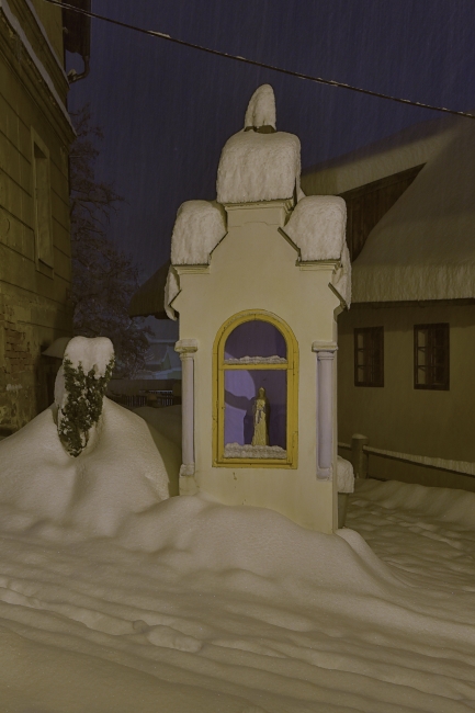 Kdo nezná kašny vimperského náměstí, sotva by v této sněhem upravené skulptuře hledal Pannu Marii .