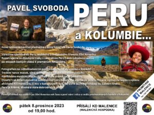 Pozvánka na promítání: PERU a Kolumbie, Pavel Svoboda PERU A KOLUMBIE – PAVEL SVOBODA v pátek 8.PROSINCE 2023 od 19,00 hod v přísálí KD Malenice (Malenická Hospůdka). Nová latinskoamerická přednáška