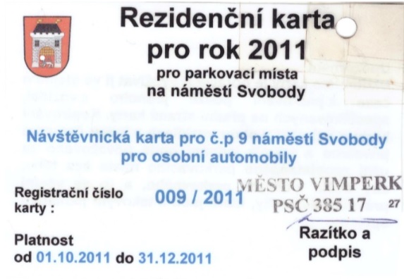 Podívejme se zpět do historie. Již v roce 1996, tedy za starostování Ing. Kvasničky, vzniklo Občanské sdružení, které sepsalo petici čítající 94 podpisů občanů žijících na náměstí Svobody, kteří nesouhlasili se stávajícími stavem na náměstí Svobody. Za starostování Ing. Petráška vydalo město Nařízení č. 2/2011 na základě, kterého začalo vybírat peníze za parkování ve výše zmíněných lokalitách. Pro obyvatele, kteří měli trvalý pobyt v uvedených zónách vydalo město Vimperk, prostřednictvím Odboru investic a údržby, parkovací kartu označenou jako „Rezident“. Jednomu zájemci mohly být vydány maximálně dvě parkovací karty. Současně odbor vydal jednu parkovací kartu s označením „Domovní parkovací karta“, která byla vydána k čp. budovy. Oba typy karet byly v ceně 300 Kč/rok. Dále byla k dispozici předplacená parkovací karta za 5 000 Kč/rok. To vše pro automobily, které nepřesahují nejvyšší přípustnou hmotnost 2,5 tuny.