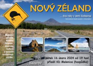 Pozvánka na promítání NOVÝ ZÉLAND – PETR NAZAROV V pátek 16. února 2024 od 19:00 hod v přísálí KD Malenice (Malenická Hospůdka). NOVÝ ZÉLAND – tři cesty a dva roky života