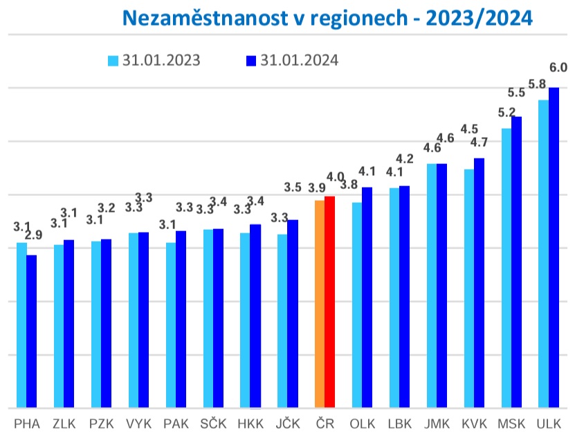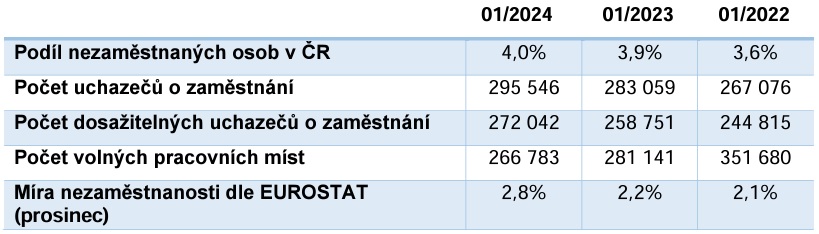 V evidenci Úřadu práce ČR bylo v lednu 2024 nově registrováno 52 975 lidí. V rámci krajského srovnání vzrostl podíl nezaměstnaných osob ve všech regionech, nejvíce v Jihočeském a v Ústeckém kraji. V absolutní hodnotě přibylo nejvíce uchazečů o zaměstnání v Moravskoslezském a ve Středočeském kraji. Oproti předchozímu měsíci mírně klesl počet volných pracovních míst.