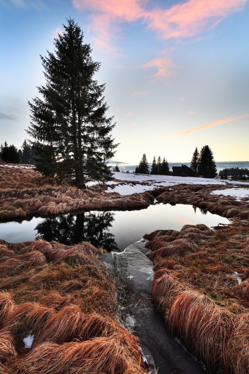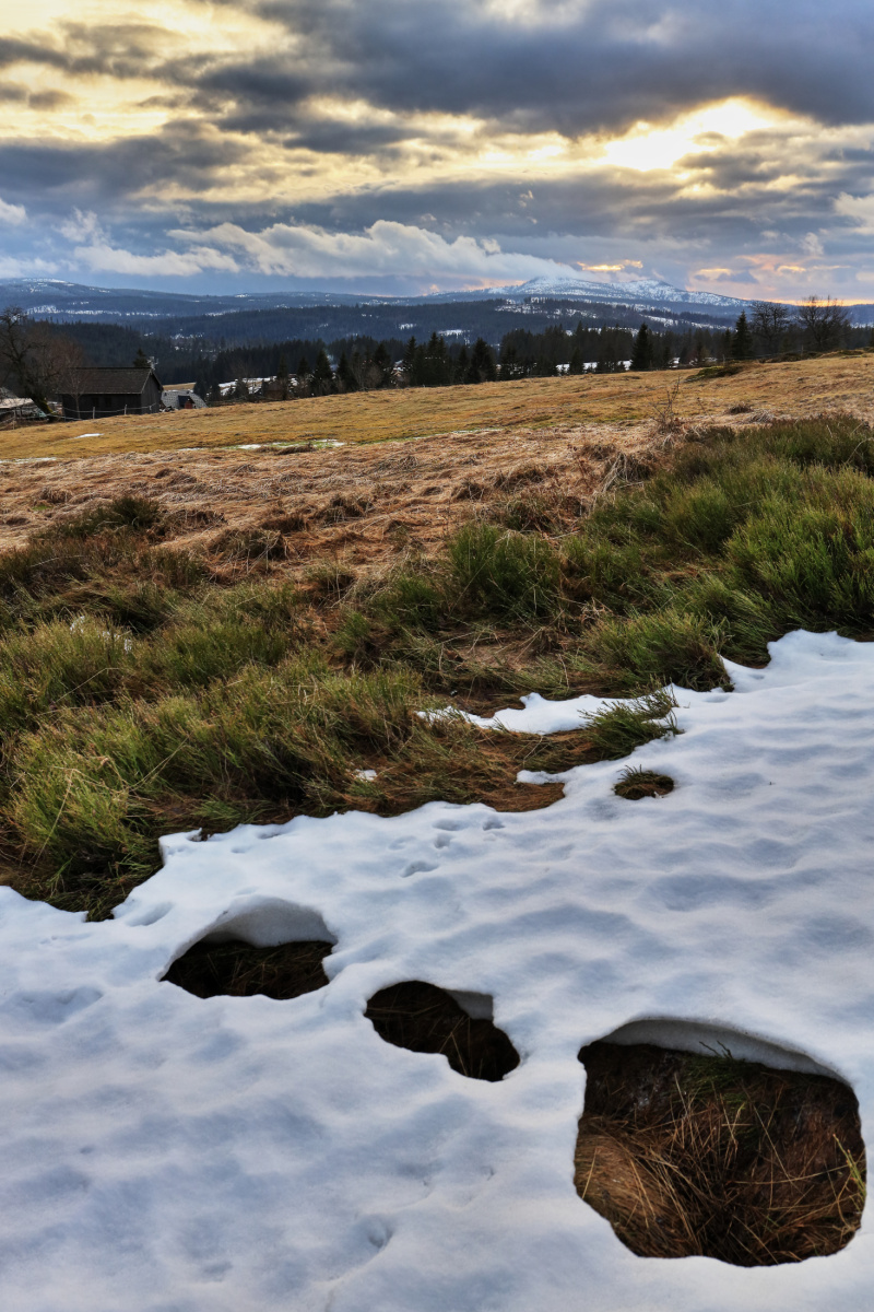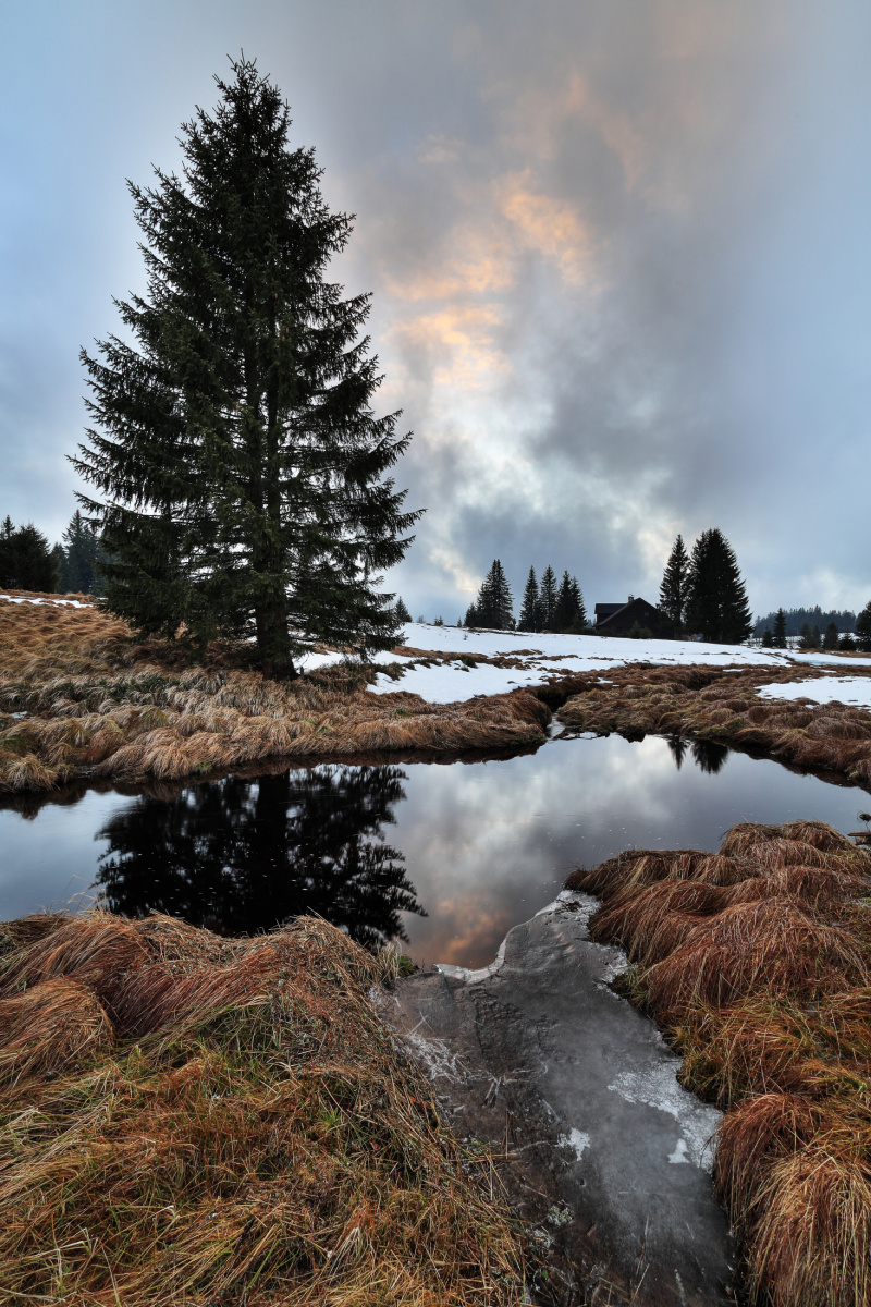 Počasí na Šumavě bohudík neovlivníme, takže si s námi dělá co chce. Byl jsem několikrát na Filipově Huti fotografovat západ slunce nad Roklanem, ale bohužel snímky vypadají jako v dubnu. Místo běžné metrové vrstvy sněhu tam tento týden začínají kvést blatouchy. I když na hřebenu mezi Luzným a Roklanem, je nyní 157 cm sněhu. Zaměřuji se nyní na vodní toky, které mají dostatek vody.