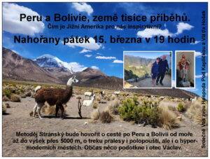Peru a Bolívie, země tisíce příběhů Srdečně vás zvou Hospoda Pod kapličkou a Vláďa Hošek na promítání v Nahořanech v pátek 15.03.2024 od 19:00 hodin.