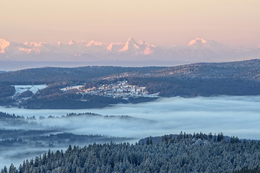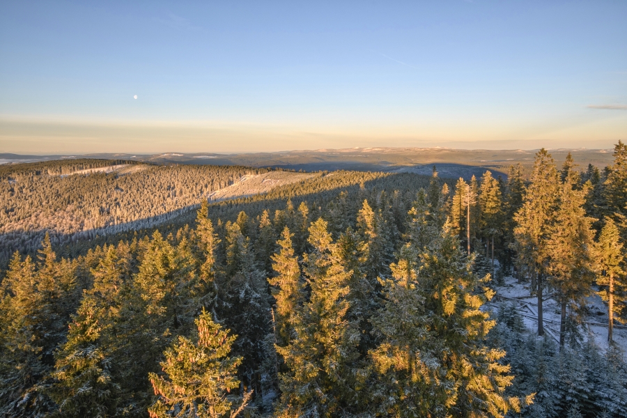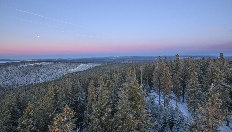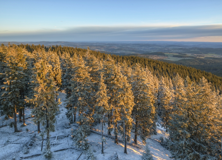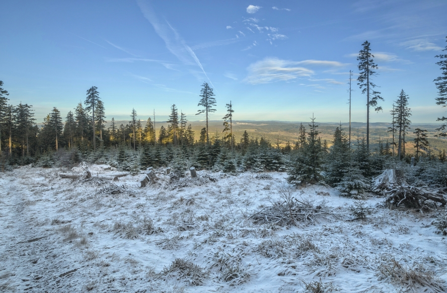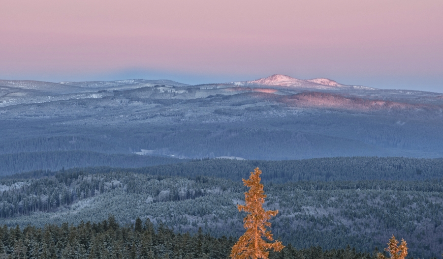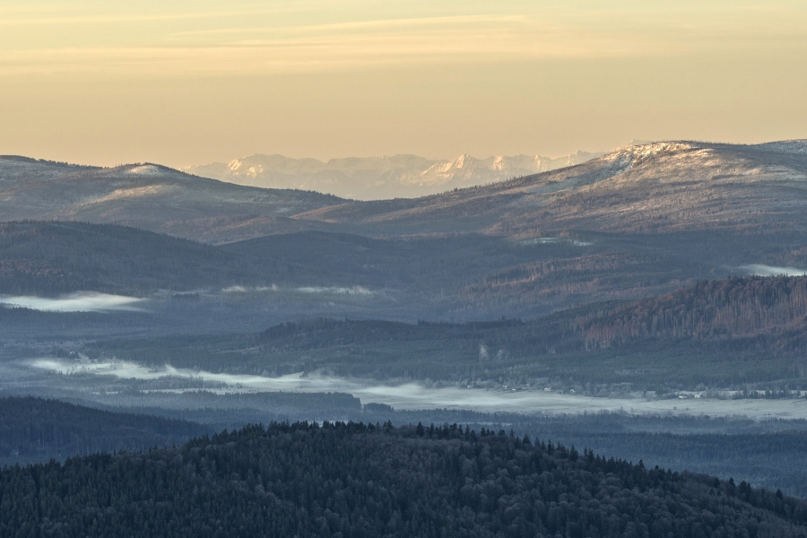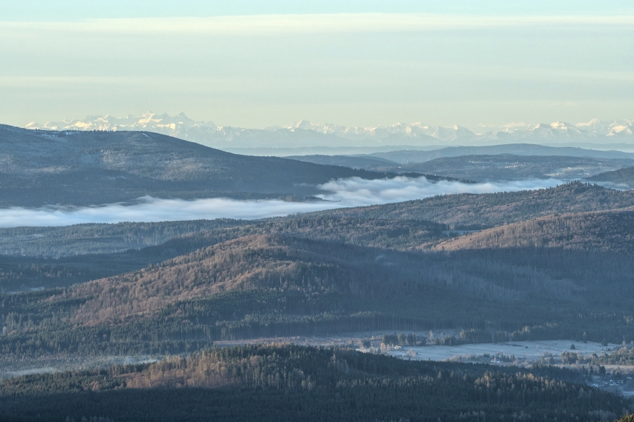 … zatímco pohled k Vimperku a do vnitrozemí nabídl konfrontaci čerstvého boubínského sněhu pod rovněž pocukrovanými osluněnými smrky s jarním vybarvením vzdálené krajiny.