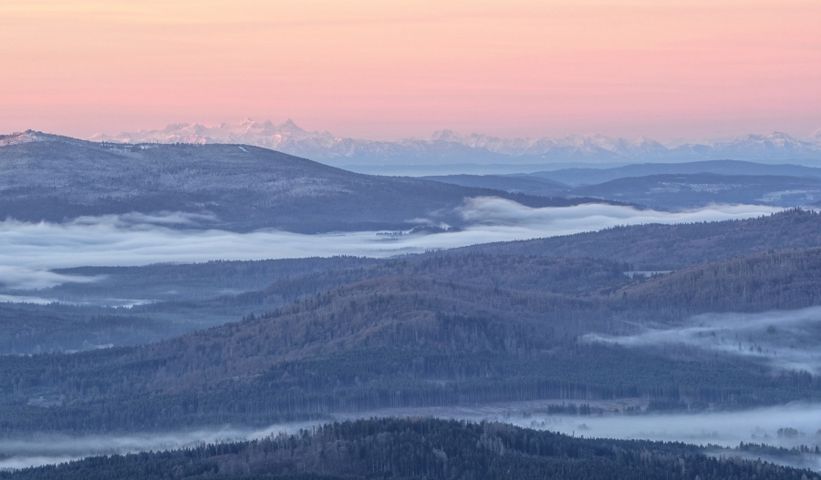 Berchtesgadenské Alpy v čele s nepřehlédnutelným Watzmannem se zjevně vyspaly dorůžova, …
