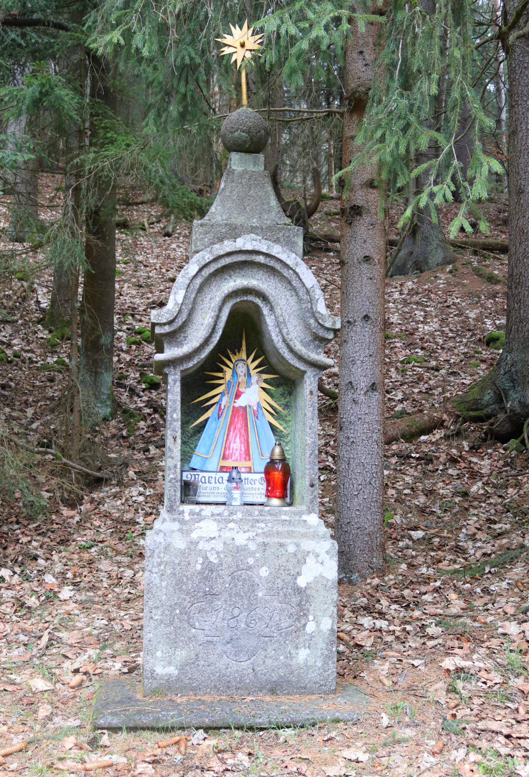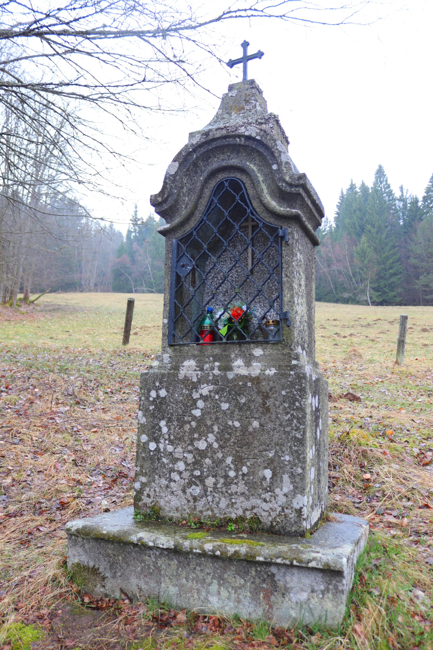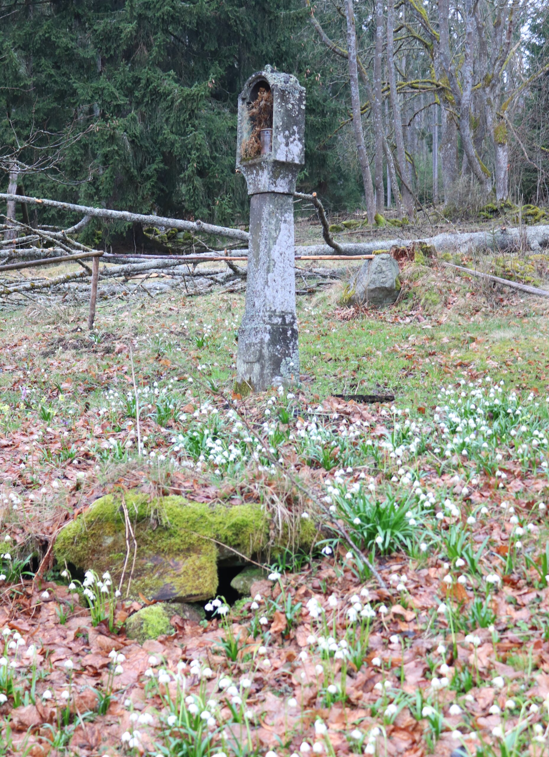 Sestupuju do Dolní Sněžné. Stojí tu kaplička, samozřejmě zamčená. Na obraze uvnitř sedí žena v hnědém hábitu, patrně nějaká karmelitka, pod dveřmi leží střepy džbánu. Opodál se pase hnědý koník. I když schovává hlavu v kotouči sena, déšť mu nevadí. Blížím se k hranicím rezervace Prameniště Blanice. Po pravé straně stojí výklenková kaplička Panny Marie Matky Boží s pramínkem. Na pozadí černé oblohy září zlaté paprsky vyletující zpoza Mariiny hlavy. A někde odtud začínám bloudit. Scházím cestou níž a níž, motám se mezi loukami. Když už mám pocit, že jsem se dostal příliš dolů, vracím se zpět. Vydávám se vlevo, cestu pozvolna zaplavuje bahno. Telefonuju Ríšovi, který tu před pár dny někde putoval za stejnými bledulemi jako já dnes.