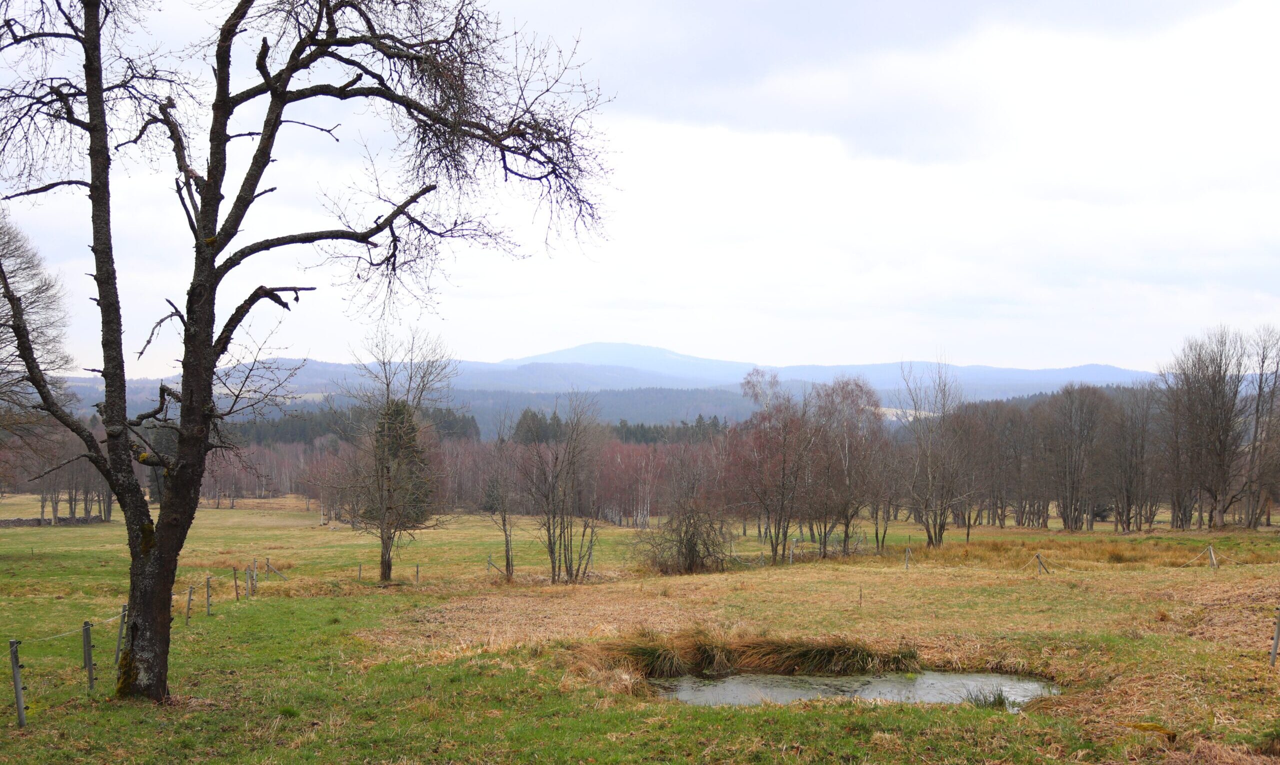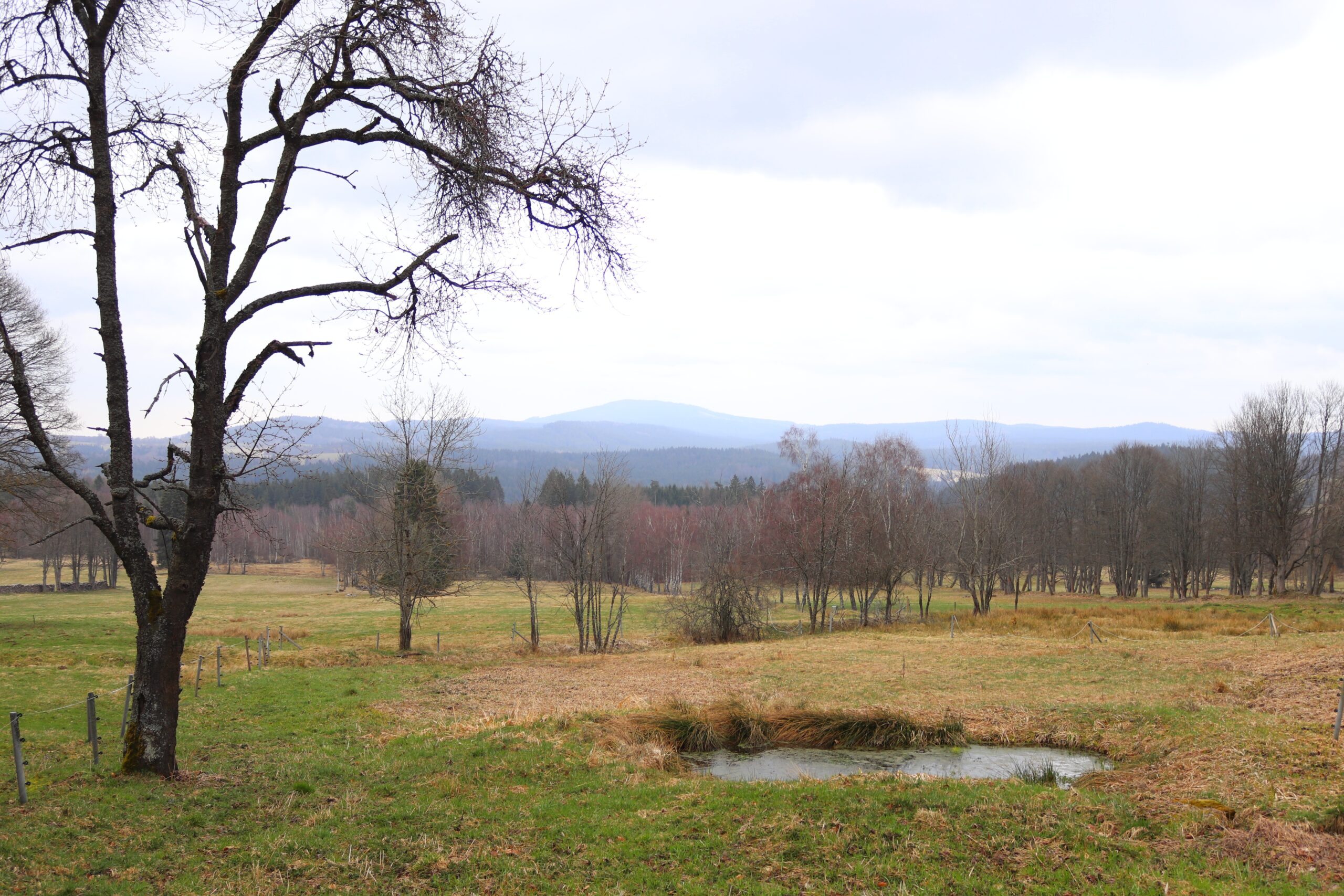 Vyrážím z Volar potěšit se pohledem na kvetoucí bledule u Čtyř Domů. Přecházím Volarský potok, stojí tu omšelá chalupa s blankytnými ostrůvky oprýskané omítky, za temnými okny svítí odřezky staré slámy. A pak cesta lemuje železniční trať. Na dně louží jsou vidět stopy žížal či jiných bytostí. Sluneční paprsky hřejí až moc, rozepnul jsem si bundu, na zádech se potím. Ale to už se blíží od západu mraky. Těším se na stín, který mi přinese les, předejde ho však nejspíš oblačný pás, pod nímž závoj deště halí kopce jeden za druhým. Zesiluje vítr, hučí v korunách smrků. Nejdu rychle, ale přece mám pocit, jako by mě nadnášely Boží dlaně. Nechápu, že mi prvních šest kilometrů na hřeben trvá tak krátce.