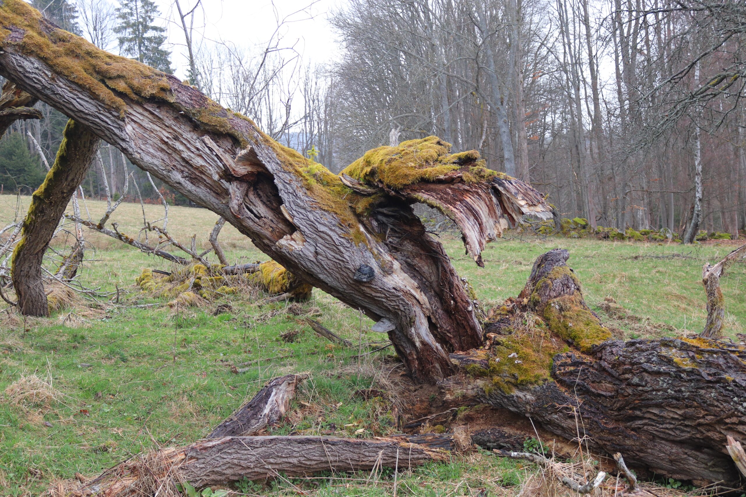 Louka mě vede okolo polámaných, pokroucených, místy se plazících jív. Celé drny tu rozryli a překlopili nenechaví divočáci. Obletí mě rozčílený čmelák, možná teď ve změti hlíny a trsů nenápadné jarní travičky hledá vchod do svého hnízda. Déšť houstne, promáčel mi bundu, chladná voda mi stéká po ramenou a zádech. Objevuju uříznutou větev jívy, řez je rudý jak zapadající slunce. A zase mě čeká stoupání podél rezervace Prameniště Blanice ke kapli u Dolní Sněžné a pak vzhůru Na Rozvodí. Tam déšť konečně ustává. Opírám se ve stoupání dlaněmi o stehna a pak dlouze sestupuju k Volarům. Po cestě mě doprovázejí stružky vody. V příkopech roste mokrýš střídavolistý a devětsil bílý.