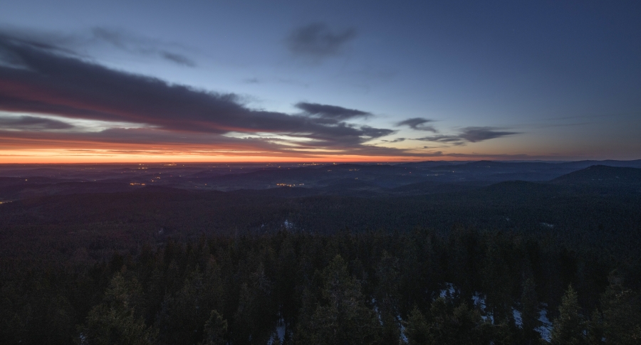 Zatímco boubínský vrchol tentokrát zůstal zcela čistým, Smrčina a Trojmezenská hornatina počínaje Plechým skončily svými vrcholy pod horizontálním pásem souvislé oblačnosti.