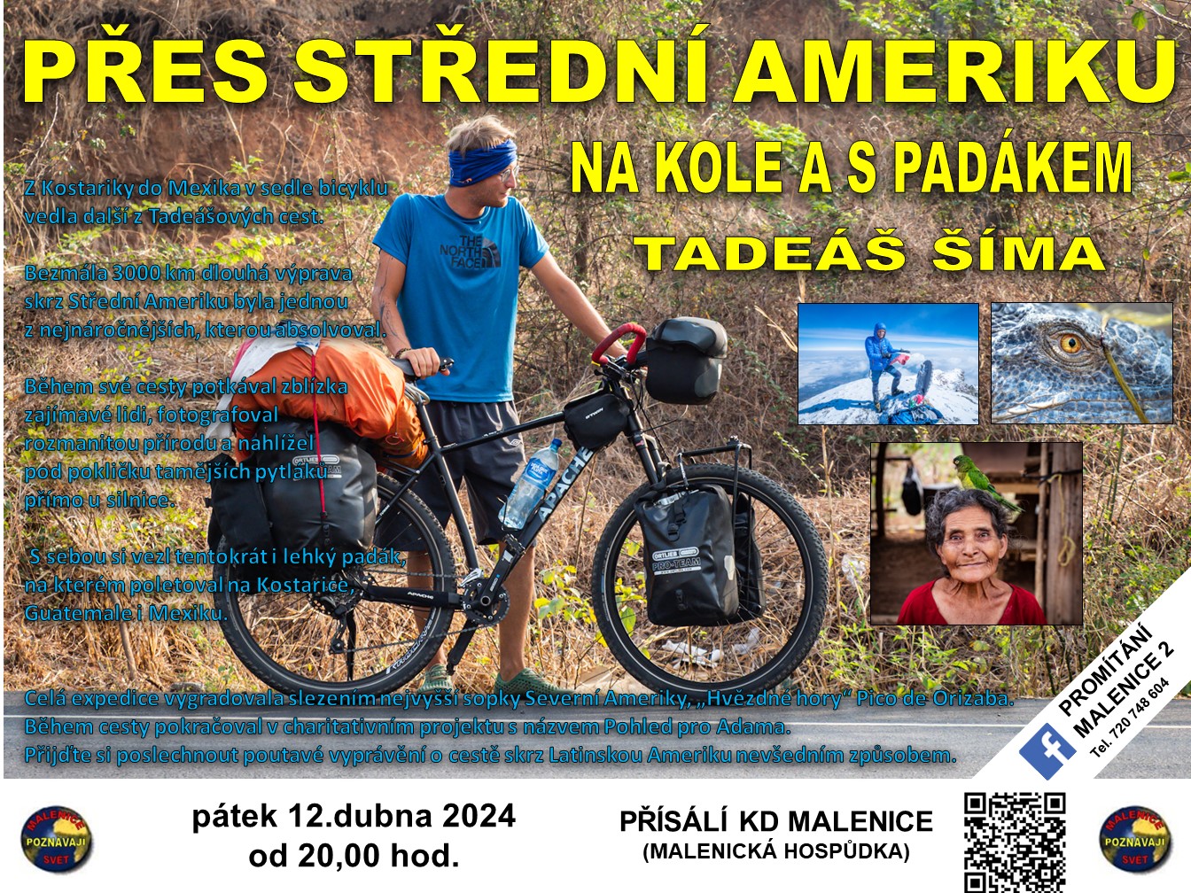 Z Kostariky do Mexika v sedle bicyklu vedla další z Tadeášových cest. Bezmála 3000 km dlouhá výprava skrz Střední Ameriku byla jednou z nejnáročnějších, kterou absolvoval. Během své cesty potkával zblízka zajímavé lidi, fotografoval rozmanitou přírodu a nahlížel pod pokličku tamějších pytláků přímo u silnice. S sebou si vezl tentokrát i lehký padák, na kterém poletoval na Kostarice, Guatemale i Mexiku. Celá expedice vygradovala slezením nejvyšší sopky Severní Ameriky, „Hvězdné hory“ Pico de Orizaba. Během cesty pokračoval v charitativním projektu s názvem Pohled pro Adama. Přijďte si poslechnout poutavé vyprávění o cestě skrz Latinskou Ameriku nevšedním způsobem.