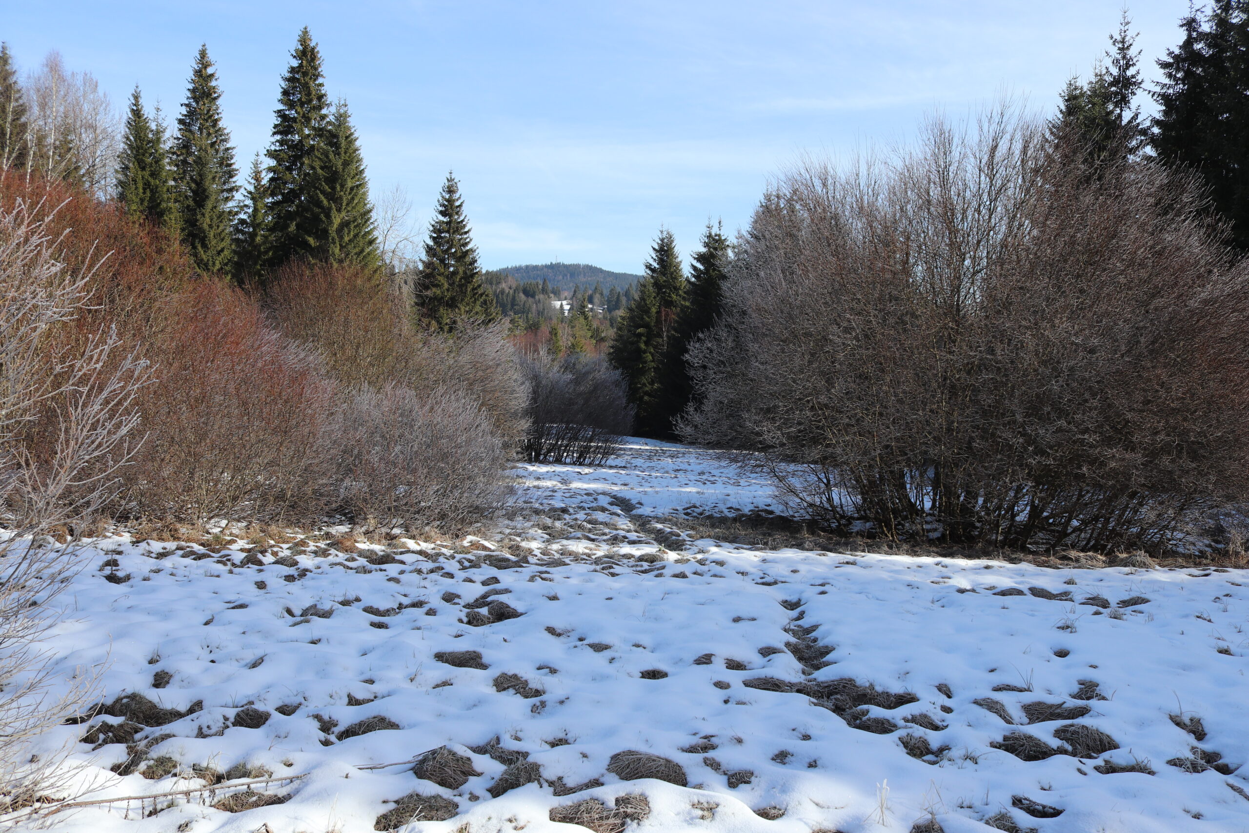 Tak jsem ani já svého sněžného levharta nespatřil. Zůstal kdesi pod sněhem a tam prožívá svoji samotu. Sestupuju loukou k potůčku Častá. Rychle se otepluje, jinovatka opadává, taje, místo ní visí na větvích krůpěje pohazující si s mnoha barvami. Čím níž sestupuju, tím méně sněhu tam je. Dostávám se na mokřady. Nohy se mi boří mezi vysoké trsy, stojí tam voda, během chvíle mám boty plné. Ale jsem rád, že vůbec nohy zvednu a dostanu se odtamtud.