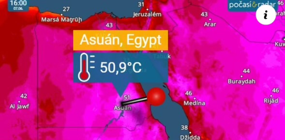Takové teplo v Egyptě ještě nikdy nebylo. V pátek 07.06. zaznamenalo jihoegyptské město Asuán extrémní teplotu 50,9 °C. Jedná se o nejvyšší teplotu pro africký kontinent zaznamenanou z kraje měsíce června.