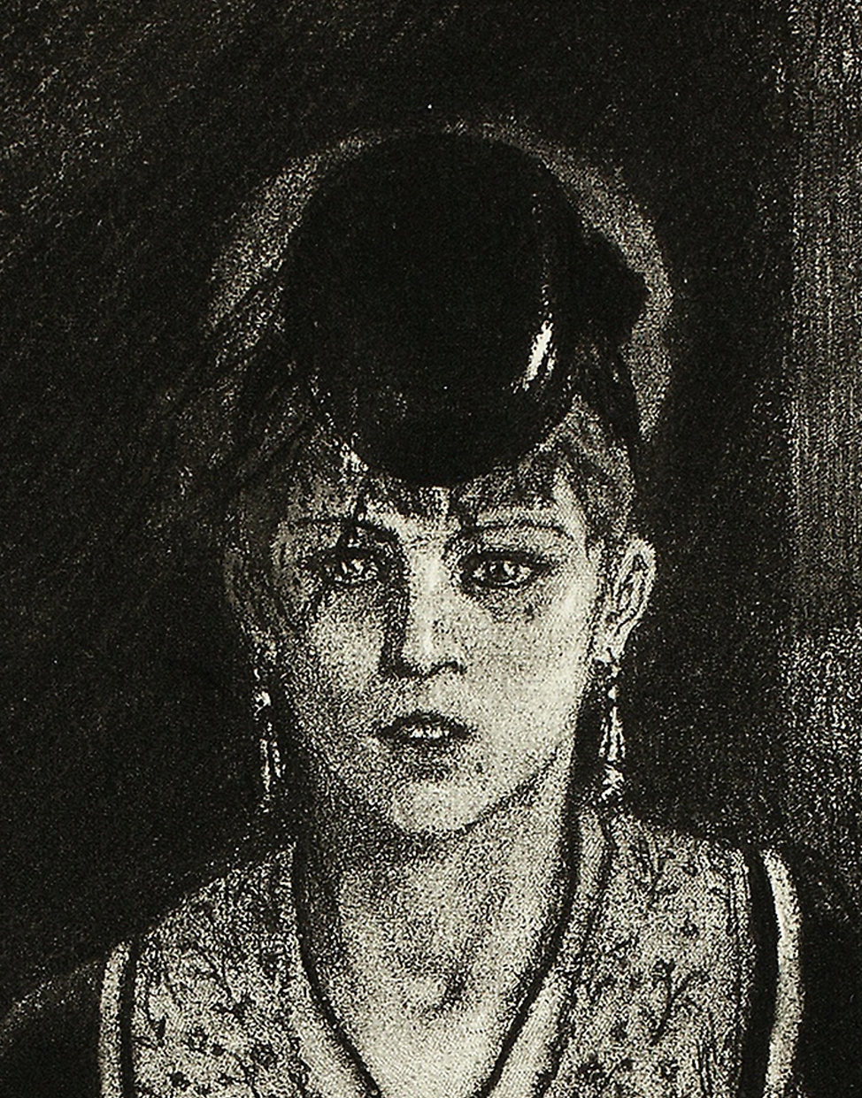Dvě ženy se míjejí, jistě mají na sobě šaty s dlouhou vlečkou, každá jde svojí cestou, ale jak se od sebe navzájem vzdalují, otevírá se a stává se zřetelnější cesta k obzoru středem obrazu. Říká se tomu středová kompozice, že? Moc se mi líbí kresba těch šatů, připomíná to secesi, Gustava Klimta. Ale co to je na tom obzoru? Silueta hájku, stromů? Může to být i srocení mnichů s velmi temnými představami. Zda touží ten, kdo stojí ve středu obrazu, dojít až k nim? Třeba jej chtěly ty dvě ženy zachránit, svést od špatné cesty, nenabídnout novou, jen svést, ostatně, jsou obě nachýleny dopředu a cosi stéká z jejich siluet, po smrti se prý začne náš svět roztékat, na důvěrně známých věcech se začnou vytvářet mokvavé skvrny, proto se domnívám, že nejsou z tohoto světa, ač nemají křídla, mohou to být andělky, jistě ženy.