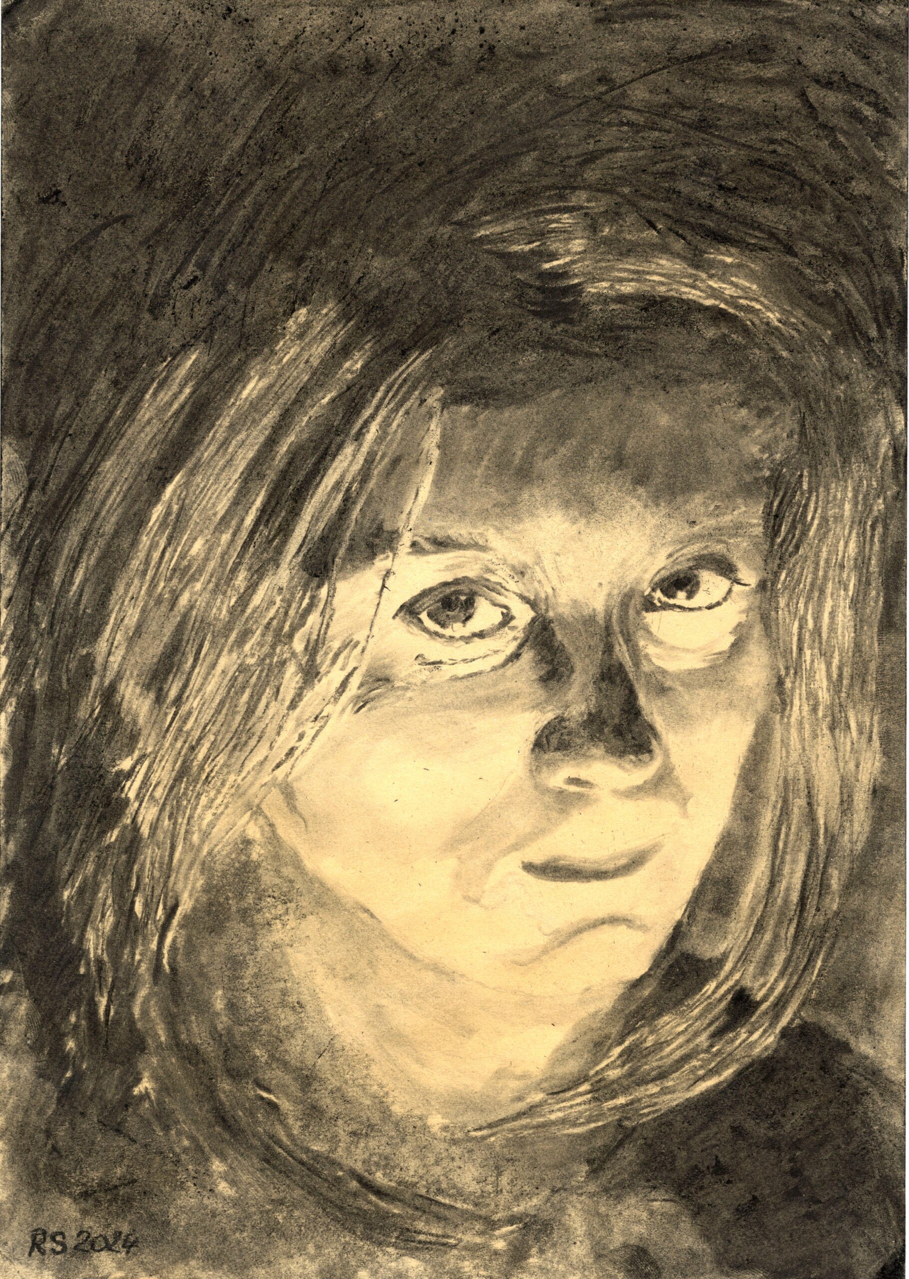 Dvě ženy se míjejí, jistě mají na sobě šaty s dlouhou vlečkou, každá jde svojí cestou, ale jak se od sebe navzájem vzdalují, otevírá se a stává se zřetelnější cesta k obzoru středem obrazu. Říká se tomu středová kompozice, že? Moc se mi líbí kresba těch šatů, připomíná to secesi, Gustava Klimta. Ale co to je na tom obzoru? Silueta hájku, stromů? Může to být i srocení mnichů s velmi temnými představami. Zda touží ten, kdo stojí ve středu obrazu, dojít až k nim? Třeba jej chtěly ty dvě ženy zachránit, svést od špatné cesty, nenabídnout novou, jen svést, ostatně, jsou obě nachýleny dopředu a cosi stéká z jejich siluet, po smrti se prý začne náš svět roztékat, na důvěrně známých věcech se začnou vytvářet mokvavé skvrny, proto se domnívám, že nejsou z tohoto světa, ač nemají křídla, mohou to být andělky, jistě ženy.