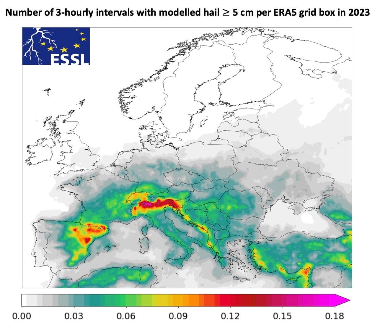 Dnes si připomínáme první výročí Evropského rekordu v úhrnu krupobití o velikosti 19 cm! Severní Itálie byla v tomto roce nejvíce postiženým regionem, což potvrdila analýza ARCHaMo aplikovaná na reanalýzu ERA5. Modelovaná četnost krup o velikosti ≥ 5 cm pro rok 2023 byla o 93,5 % vyšší než průměr z let 1979-2023.