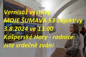 Jste srdečně zváni na vernisáž výstavy Moje Šumava 53 objektivy. V sobotu 03.08.2024 v Kašperských Horách. Marie Bubeníková