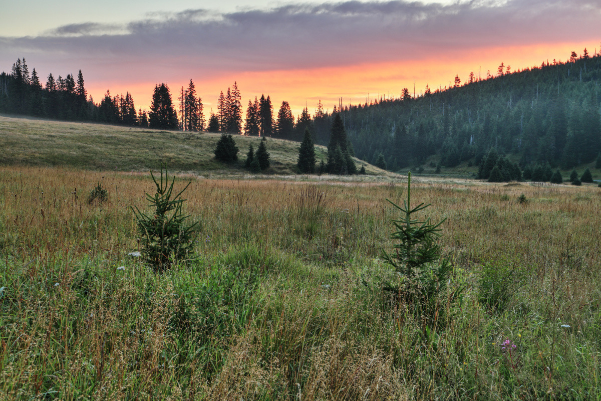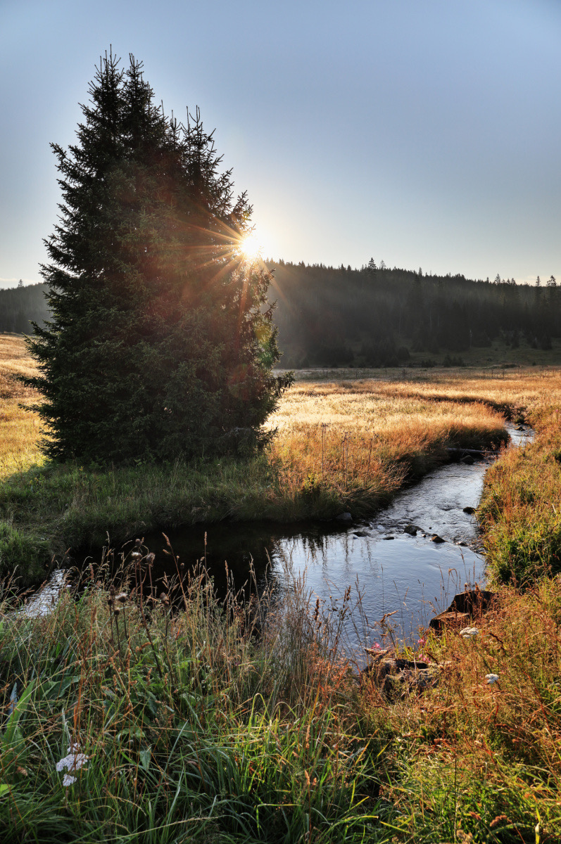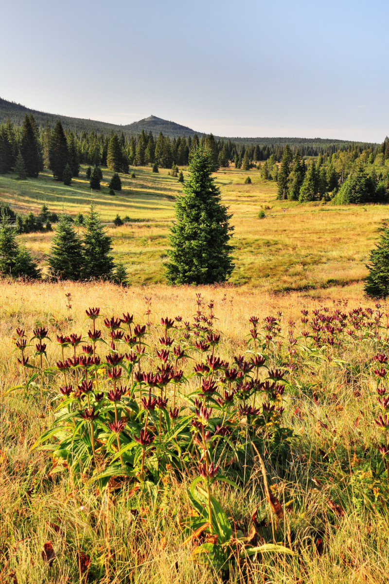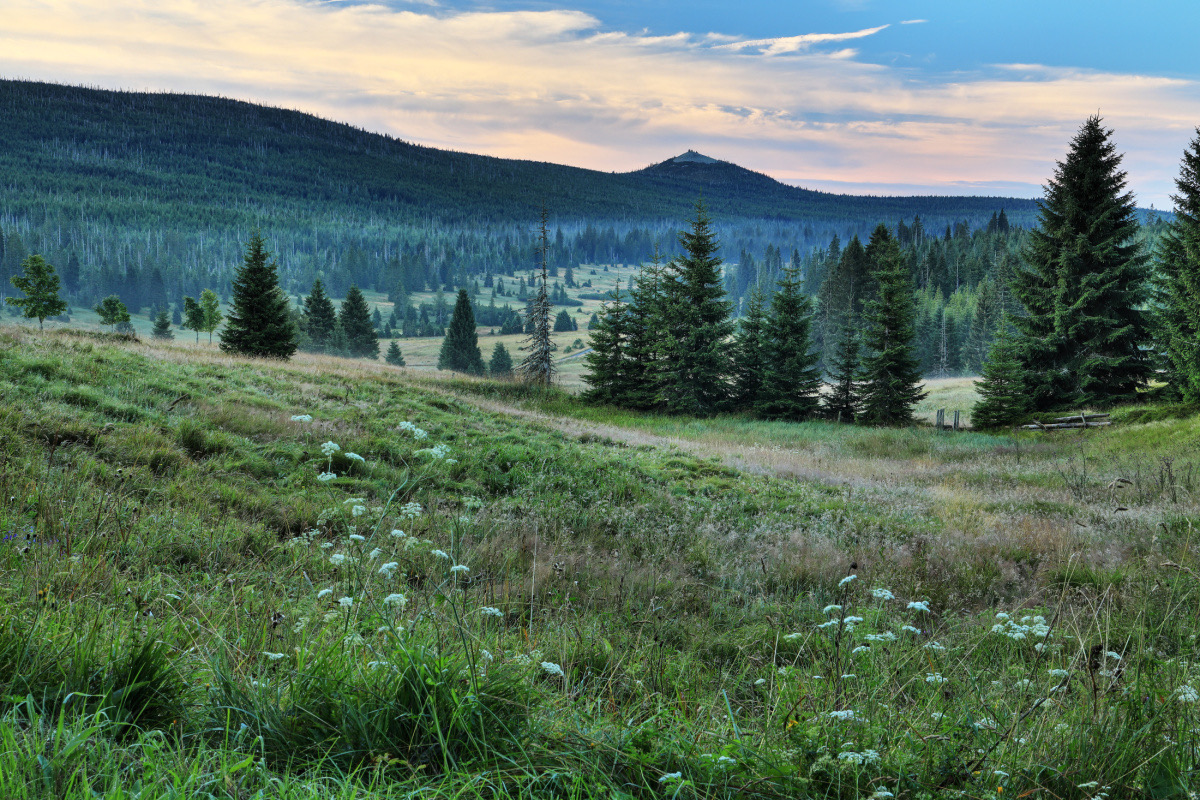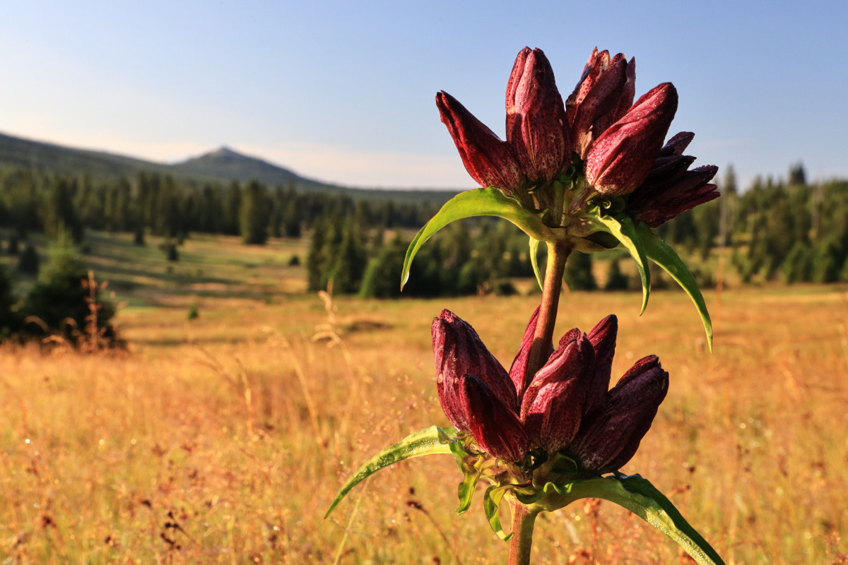 Jel jsem na kole v 5 hodin ráno za šera na můj oblíbený Březník. Dojel jsem tam na svítání a byla to paráda. Postupně se nasvěcoval Luzný a zlatavé trávy v popředí. Také hořce šumavské byly v plném květu. Hodně pavučin a krásné protisvětlo. Dole v údolí bylo asi 5 °C.