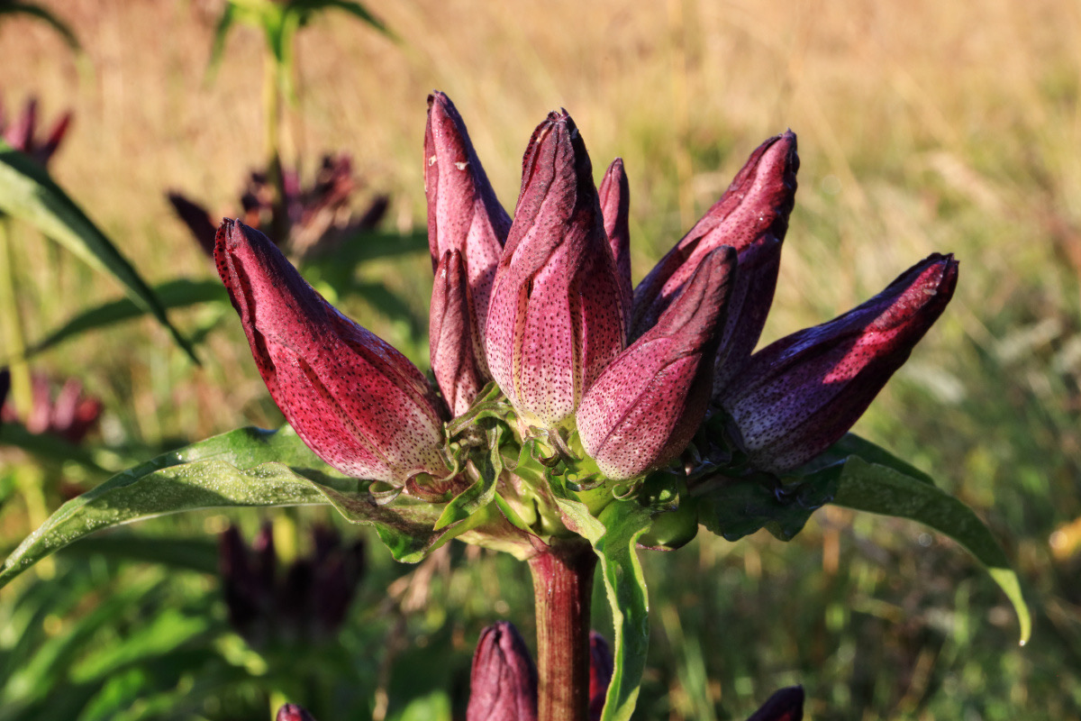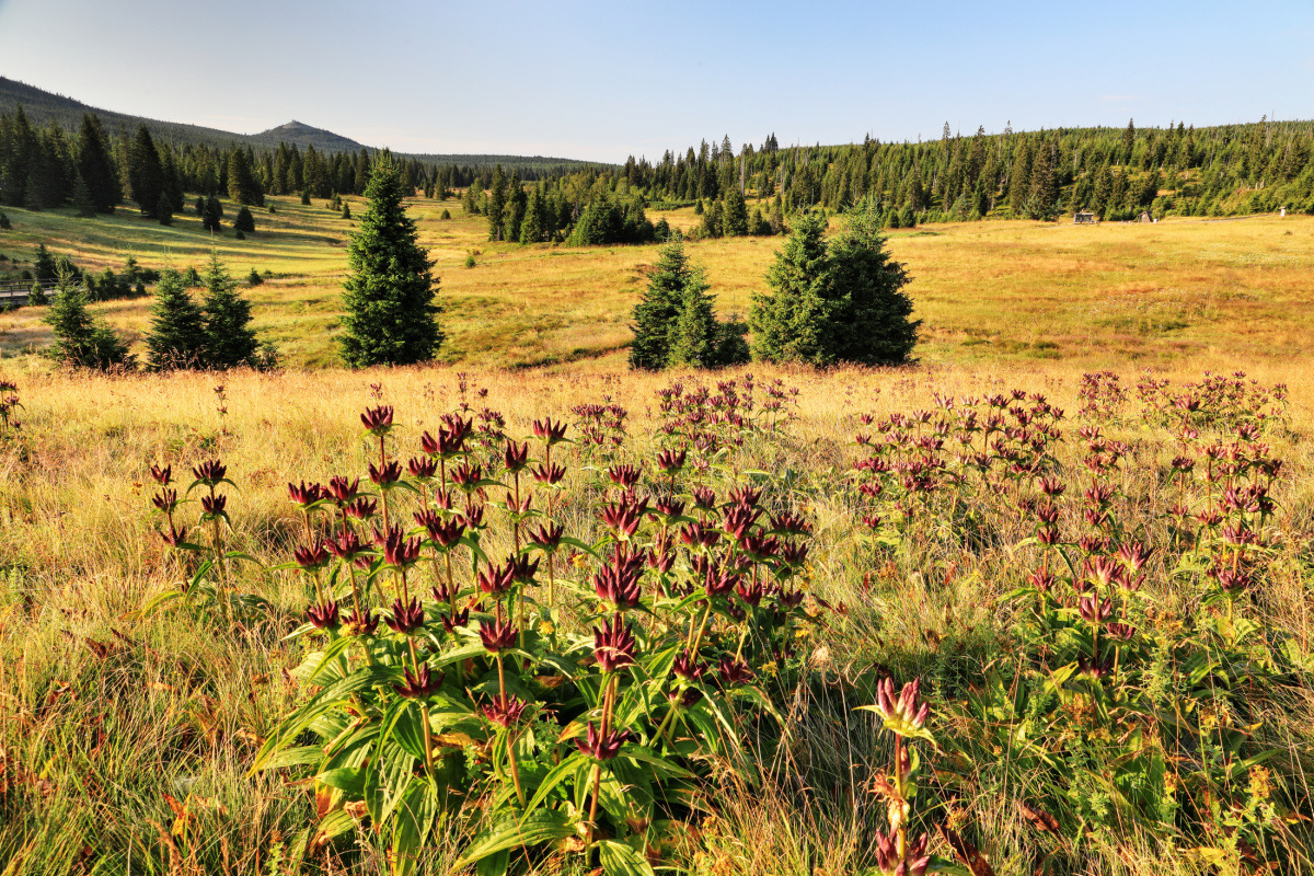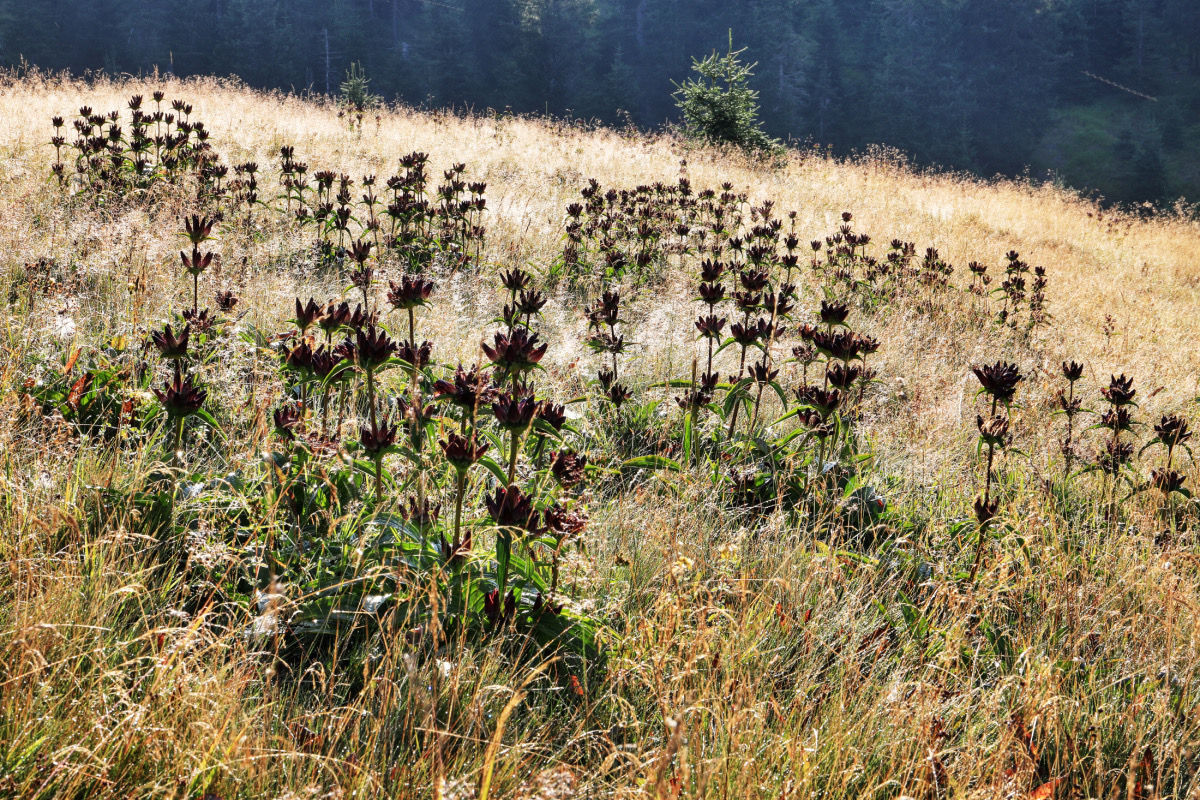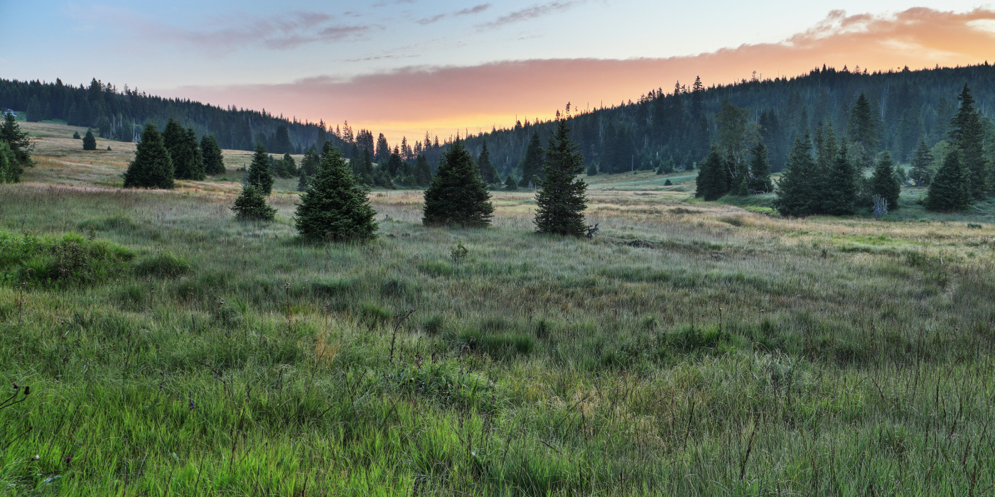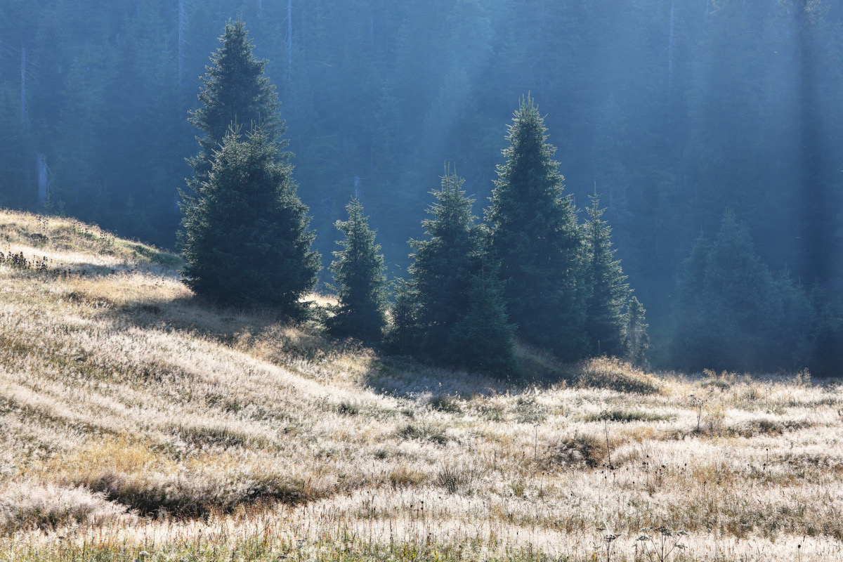 Jel jsem na kole v 5 hodin ráno za šera na můj oblíbený Březník. Dojel jsem tam na svítání a byla to paráda. Postupně se nasvěcoval Luzný a zlatavé trávy v popředí. Také hořce šumavské byly v plném květu. Hodně pavučin a krásné protisvětlo. Dole v údolí bylo asi 5 °C.