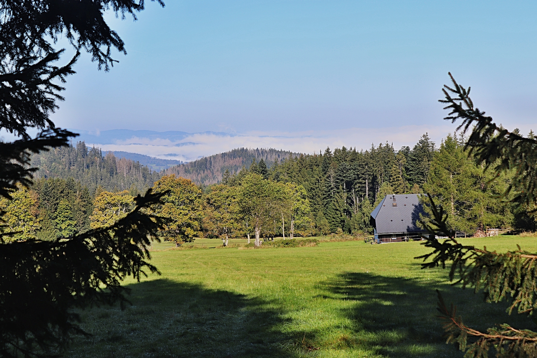 Z cesty nad loukou U Paulusů se otevírá rozhled na vzdálené hory. Modravé kopce se zvedají nad potrhané pásy mlh. Blíží se podzimní rovnodennost, údolí se budou halit do mlžných dek stále častěji. Trávu jako by pokrývalo jíní, ale je to jen rosa, kterou prostoupil zářivý blankyt oblohy. Popojdu kousek dolů a hned stojím ve vodě. Po vydatných deštích je les celý nabobtnalý, po úbočí stékají pramínky, kreslí na cestě v písku mapy. Dívej se z výšky jako pták, slyším tichou radu, a projdi si v duchu všechny řeky, pahorky a laguny. Budeš prvním, kdo tudy kráčí. Dej jim jméno a ta krajina bude tvou zemí zaslíbenou.