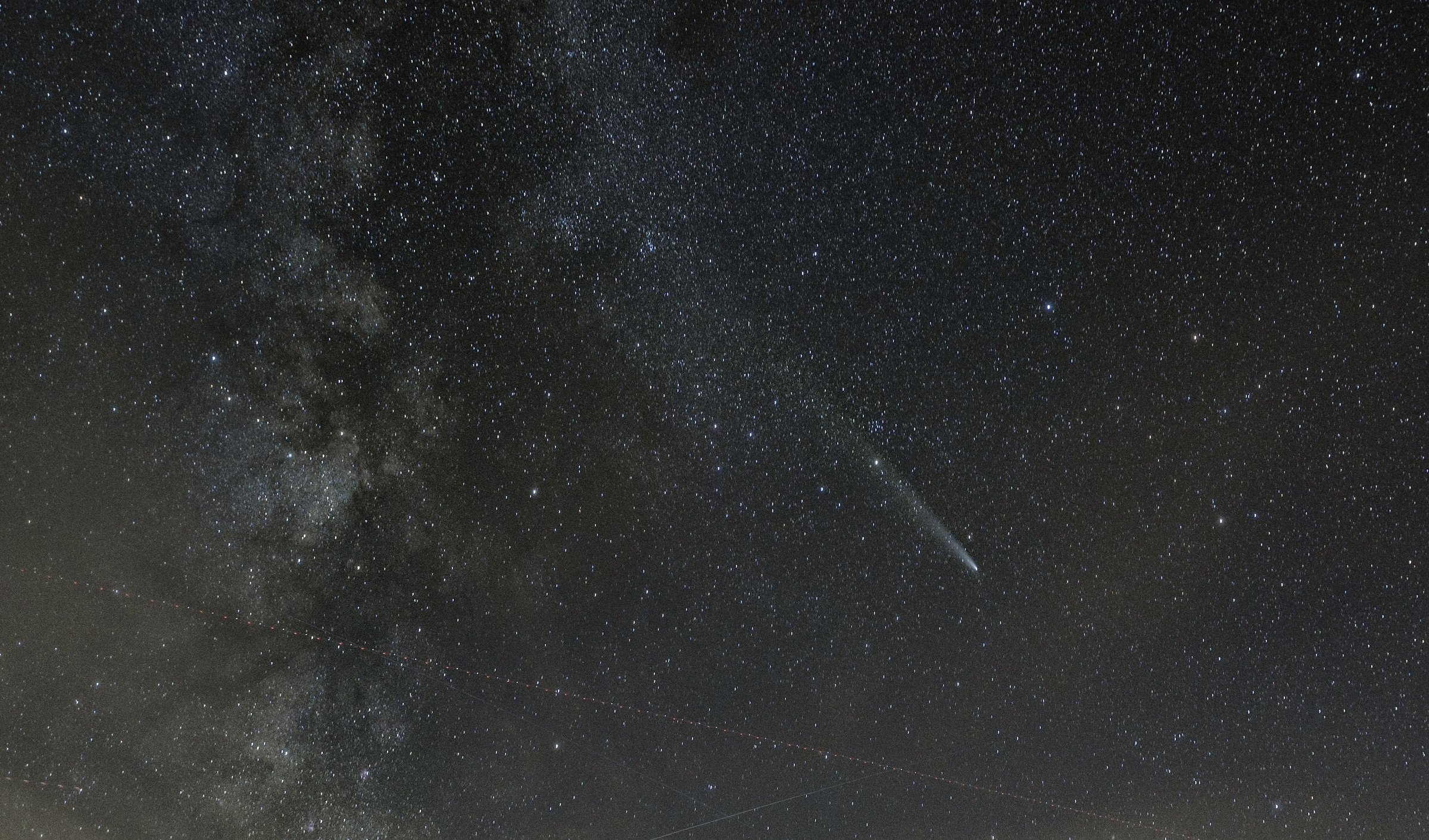 … nebo v celé své kráse pózovala na temném pozadí, vyšperkovaném dalšími hvězdami. Dlužno ovšem dodat, že ulovit stávající kometu za daných podmínek v podobném vyznění jako kdysi Neowise je těžkým úkolem, jehož úspěšnost, podmíněna velkou dávkou štěstí, bez nejmenších pochyb zasluhuje nazvat husarským kouskem.