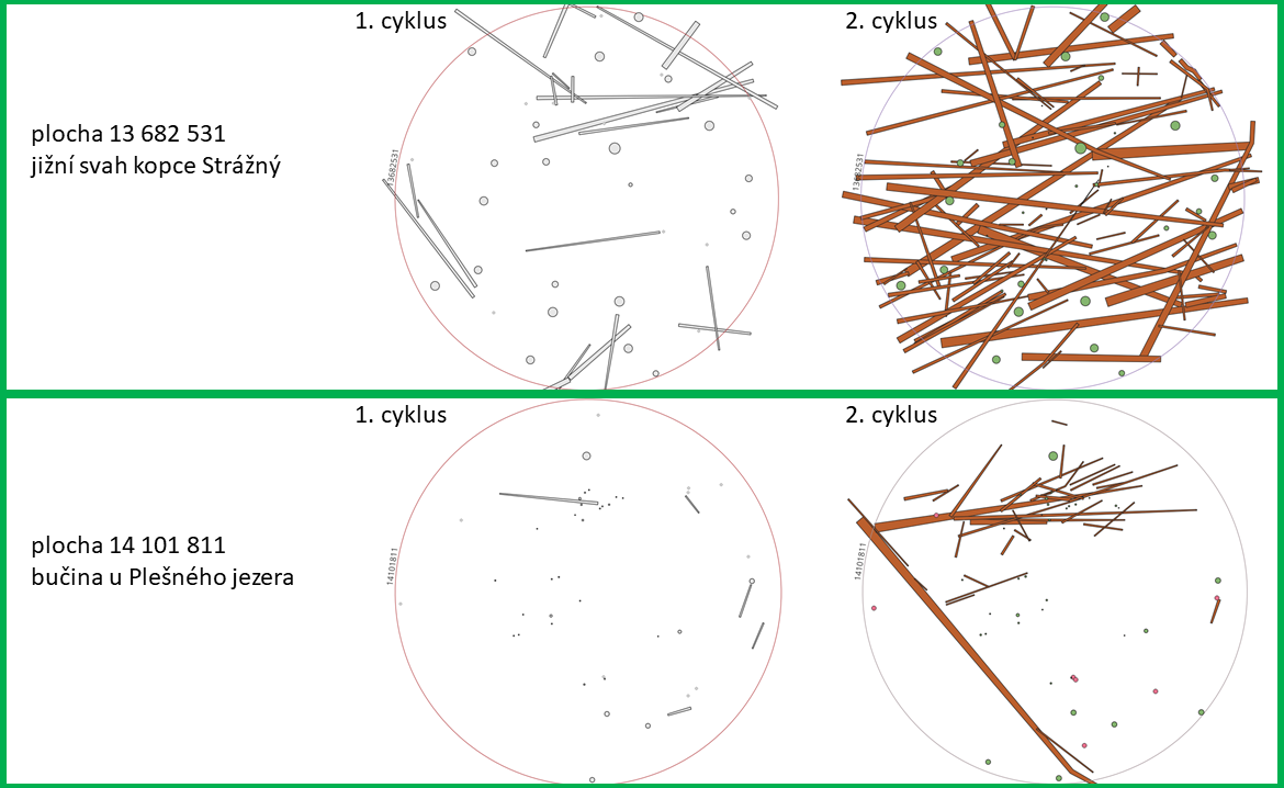 „Zásadnější informace však získáváme nyní, kdy se na monitorační plochy vracíme. Od roku 2019 do současnosti jsme měření zopakovali na 578 plochách a rozdíly oproti prvnímu kolu jsou jasně zřetelné. Jedním z těch nejzásadnějších je významný nárůst množství ležícího tlejícího dřeva. Zatímco v prvním kole monitoringu to bylo průměrně 88 m 3 /ha, v druhém kole to je skoro jednou tolik, tedy 151 m 3 /ha. Tento rozdíl máme podrobně zdokumentovaný na jednotlivých monitoračních plochách, ale je viditelný i pouhým okem. A vlastně ho cítíme i každý den, kdy kvůli množství ležících kmenů je stále těžší nejen plochy změřit, ale i se na ně dostat,“ představuje zásadní informaci Pavla Čížková.
