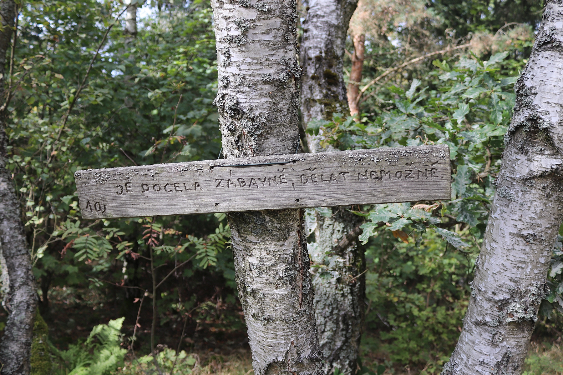 Scházíme pod Hudlickou skálu. Jdu trochu napřed, skrývá se tu pod lípou dřevěná lavička se stolkem. Zapaluju si mentolku, nade mnou ťuká do větve nějaký pták, nevidím ho, pozoruju jen listy chvějící se v tiché karbanické hře. Přichází asi sedmdesátiletá paní, kolem ní pobíhá černý psík, trochu obtloustlá pouliční směs, paní na něj pokřikuje, aby se jí nikam nezatoulal. Ptá se, zda máme s sebou psa, ale Corliss je v autě. Také paní si sem přichází zakouřit.