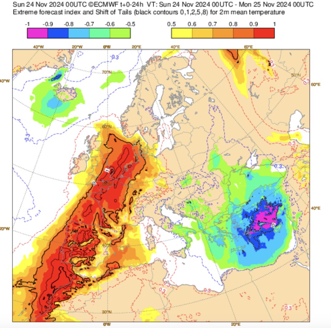 EFI (Index extrémní předpovědi) od ECMWF je prakticky mimo stupnici.