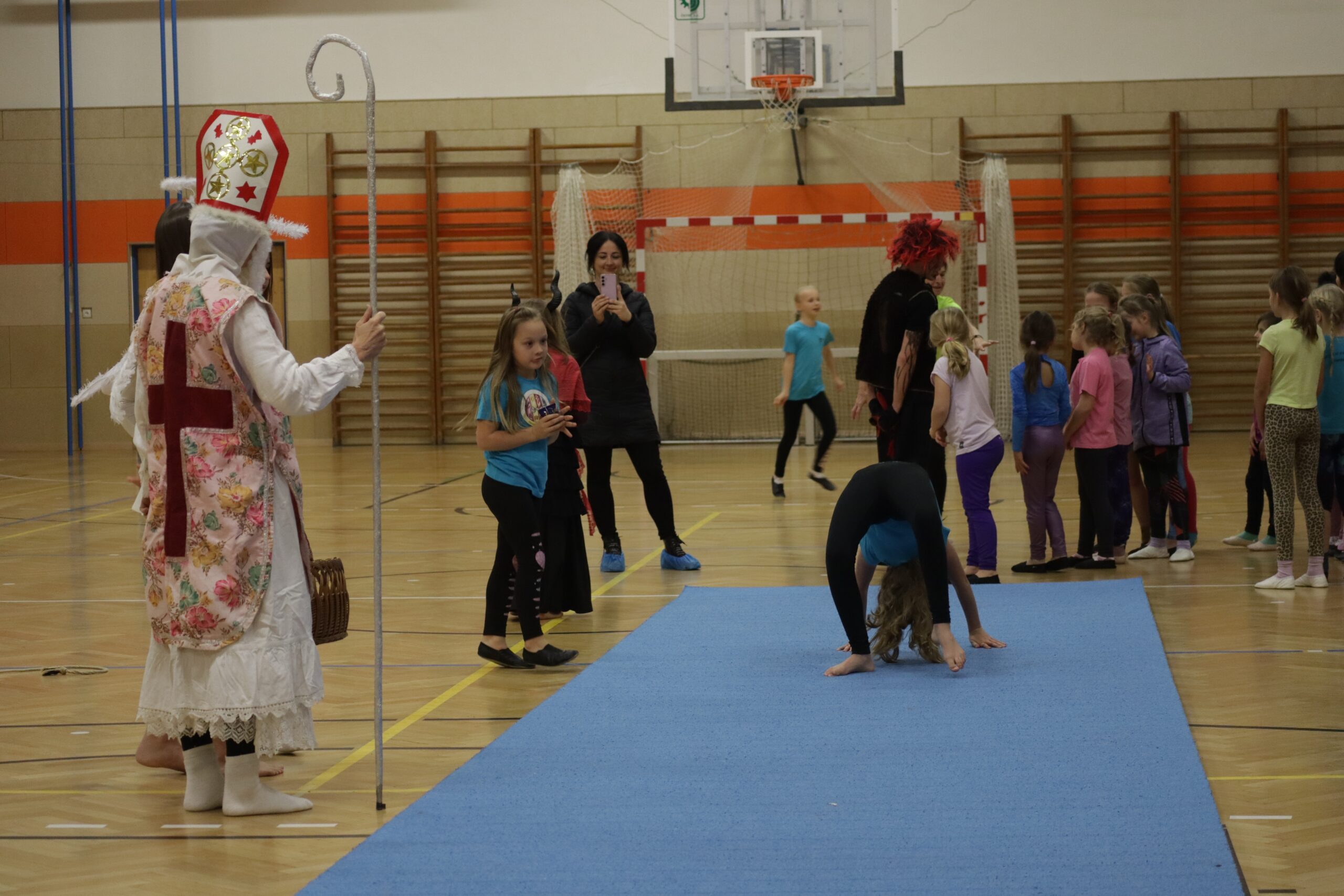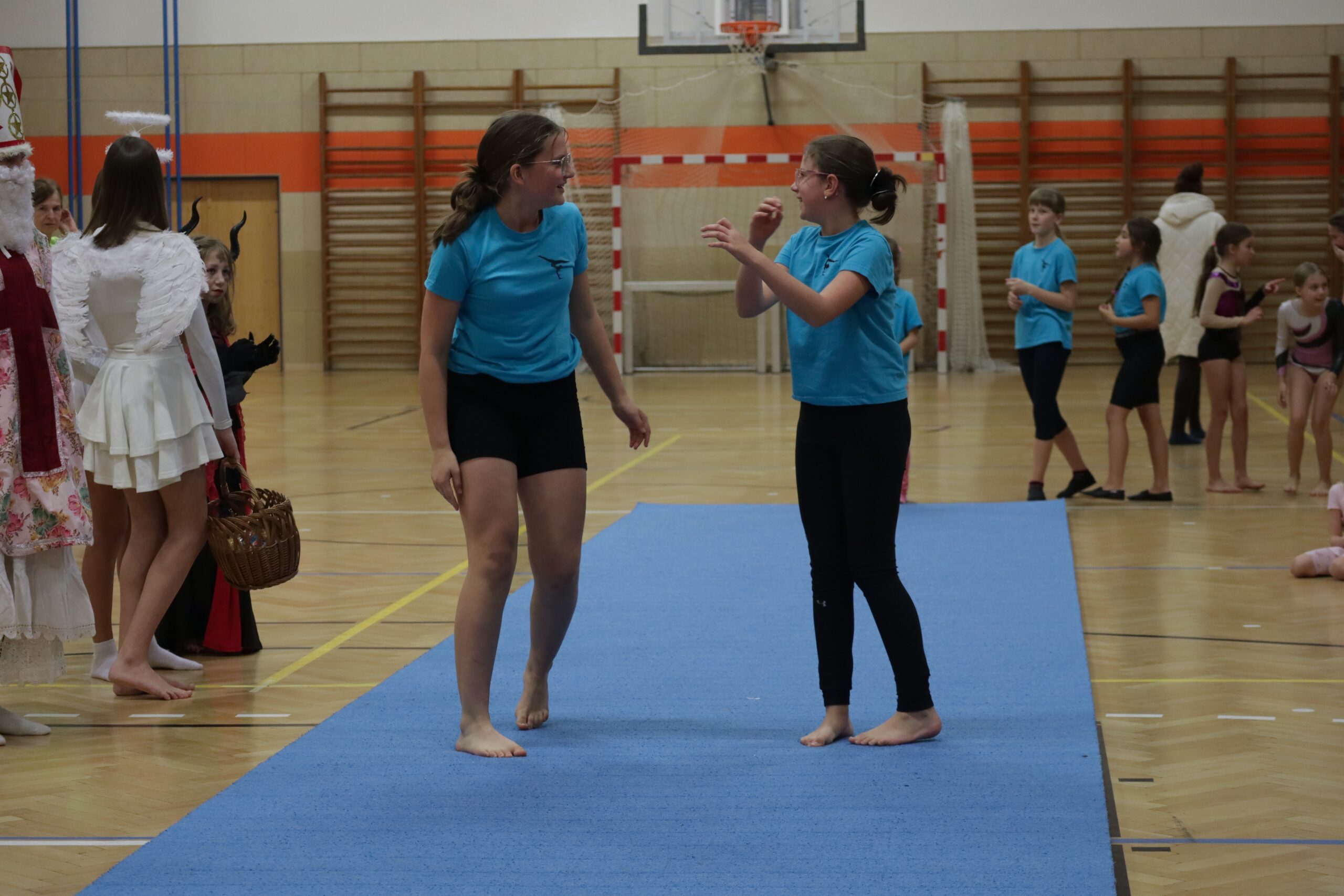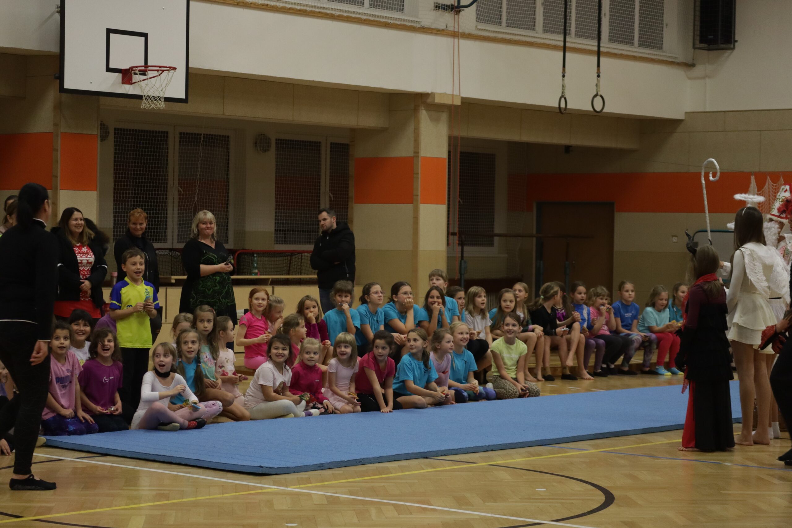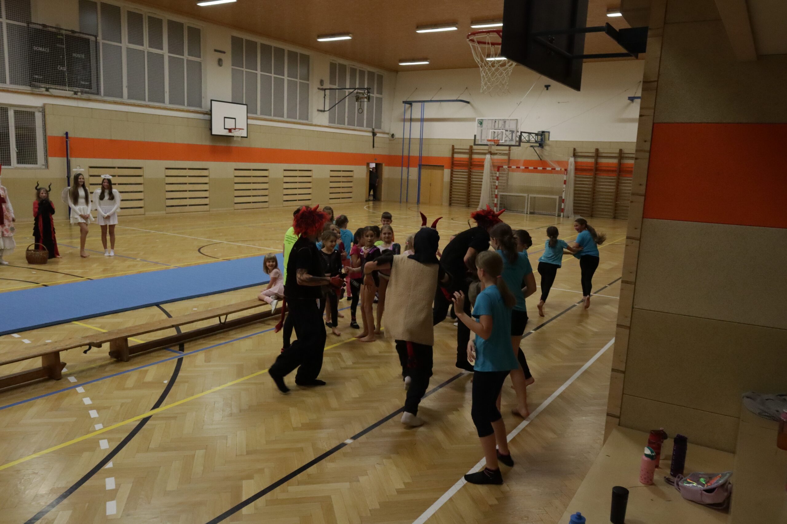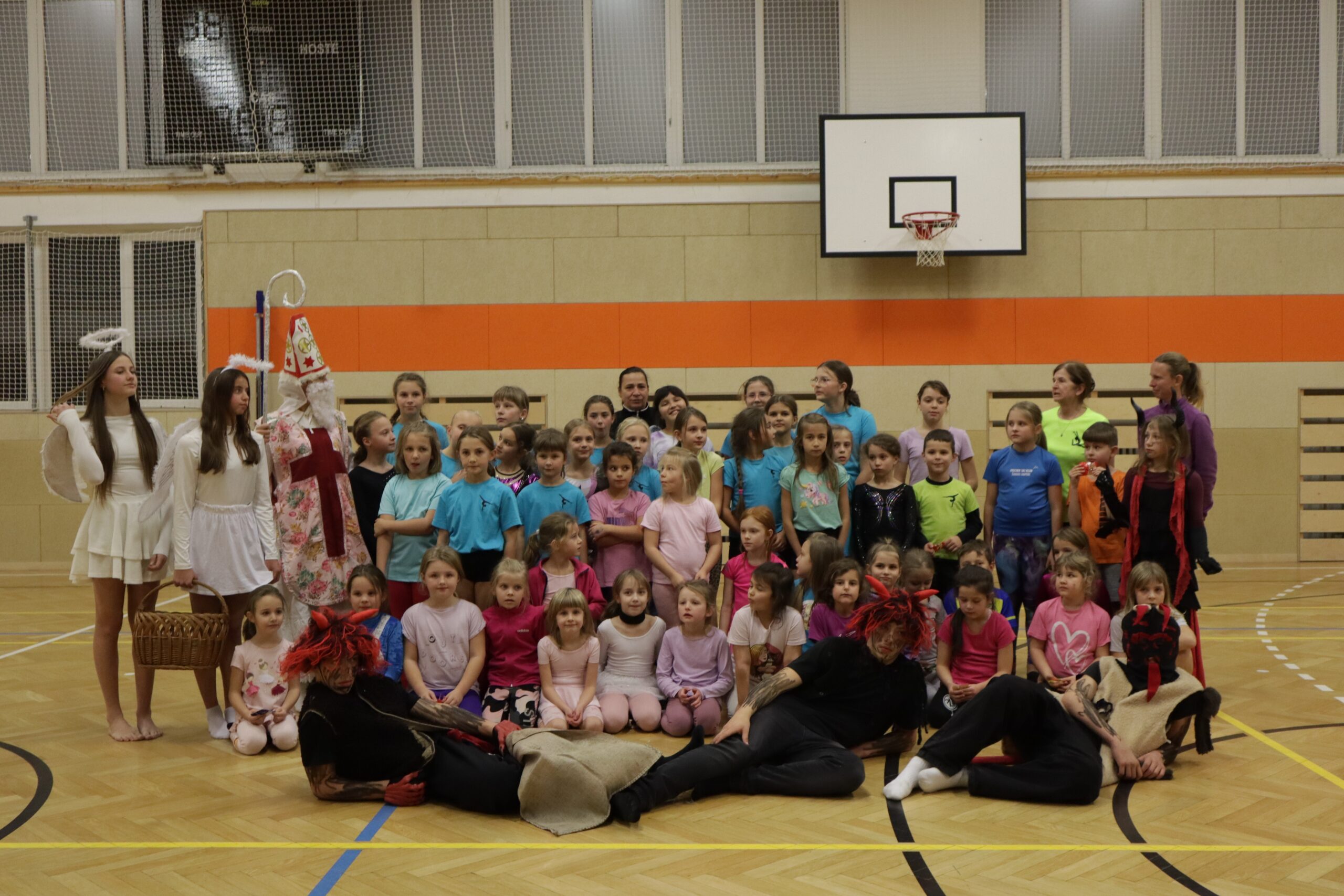 A protože Mikuláš přišel na sportovní trénink, musely kluci i holčičky předvést pár cviků na koberci, aby si zasloužily sladkou odměnu. Cvičení zlákalo i čerty a andílky a tak si také něco z akrobacie vyzkoušeli. Kupodivu jim to docela šlo.