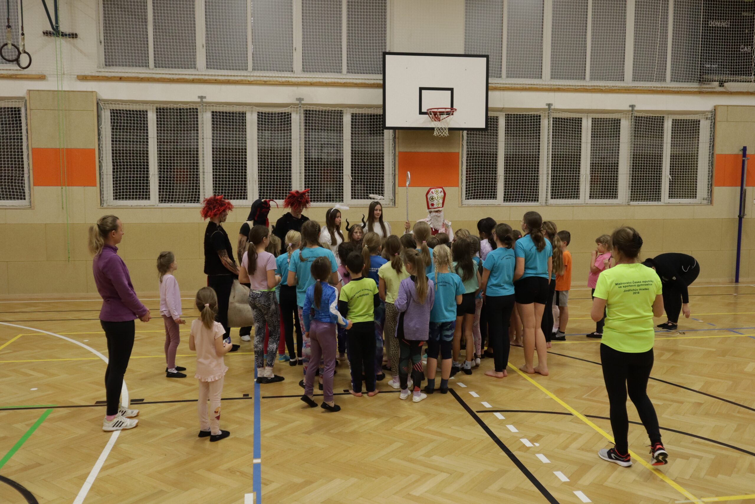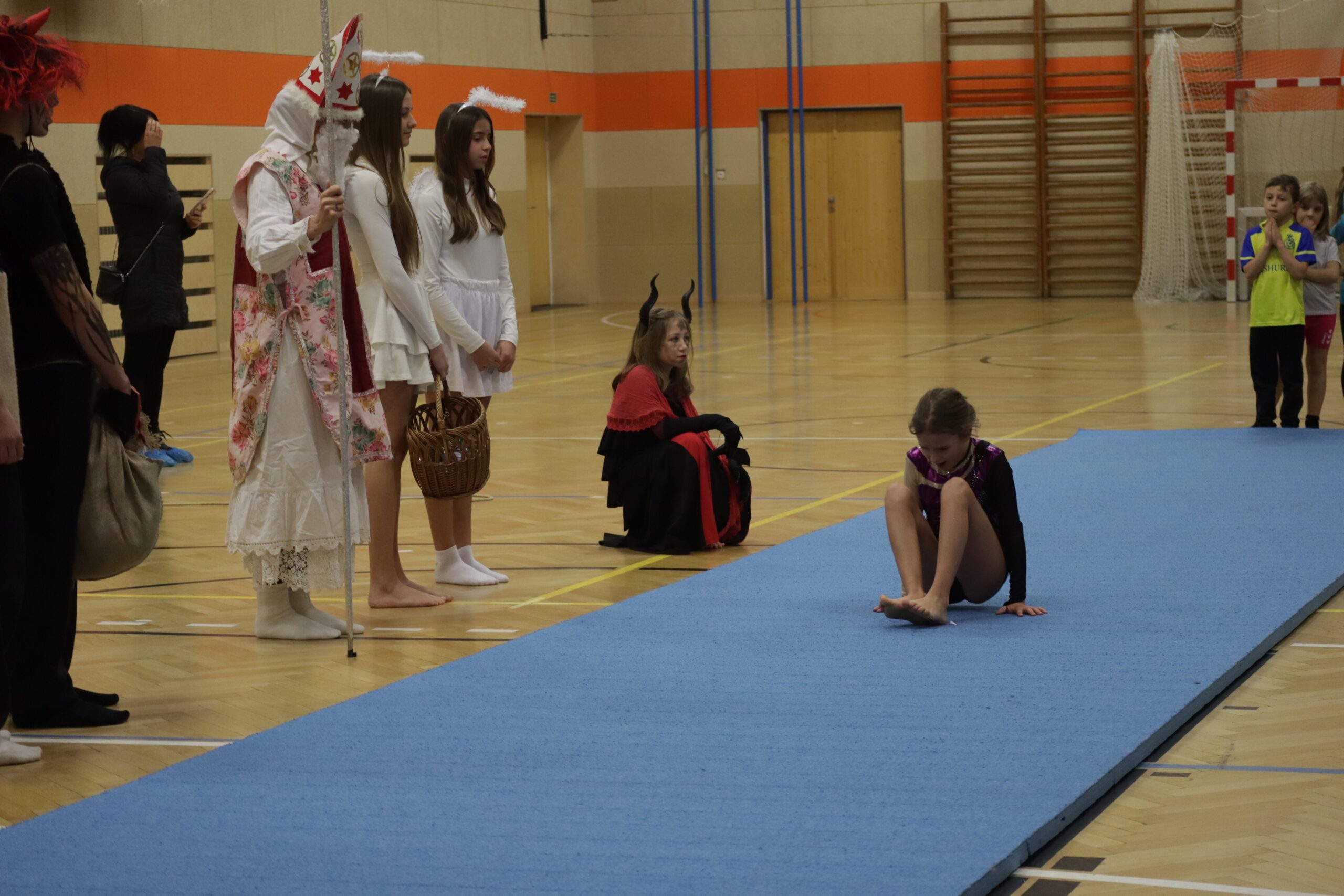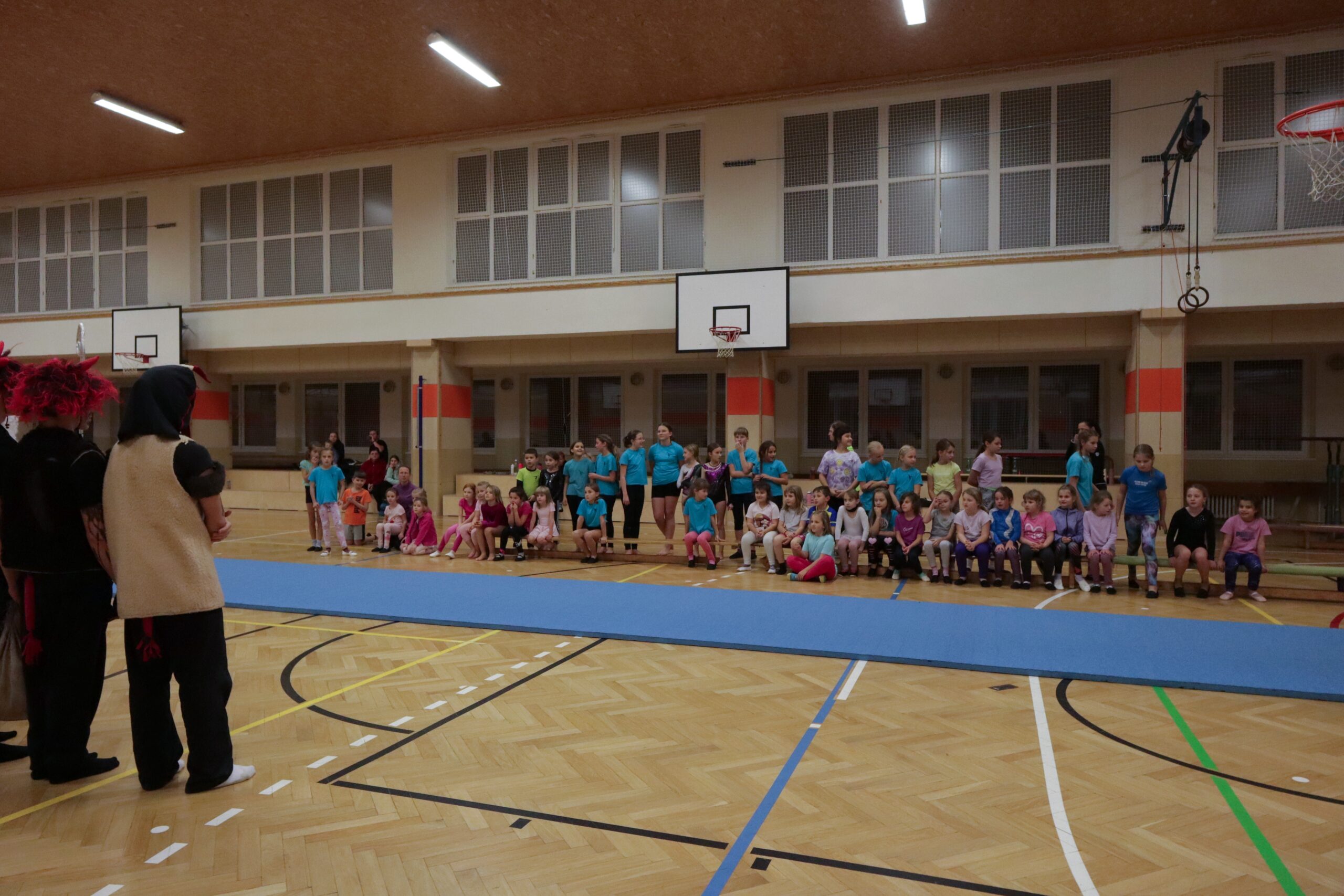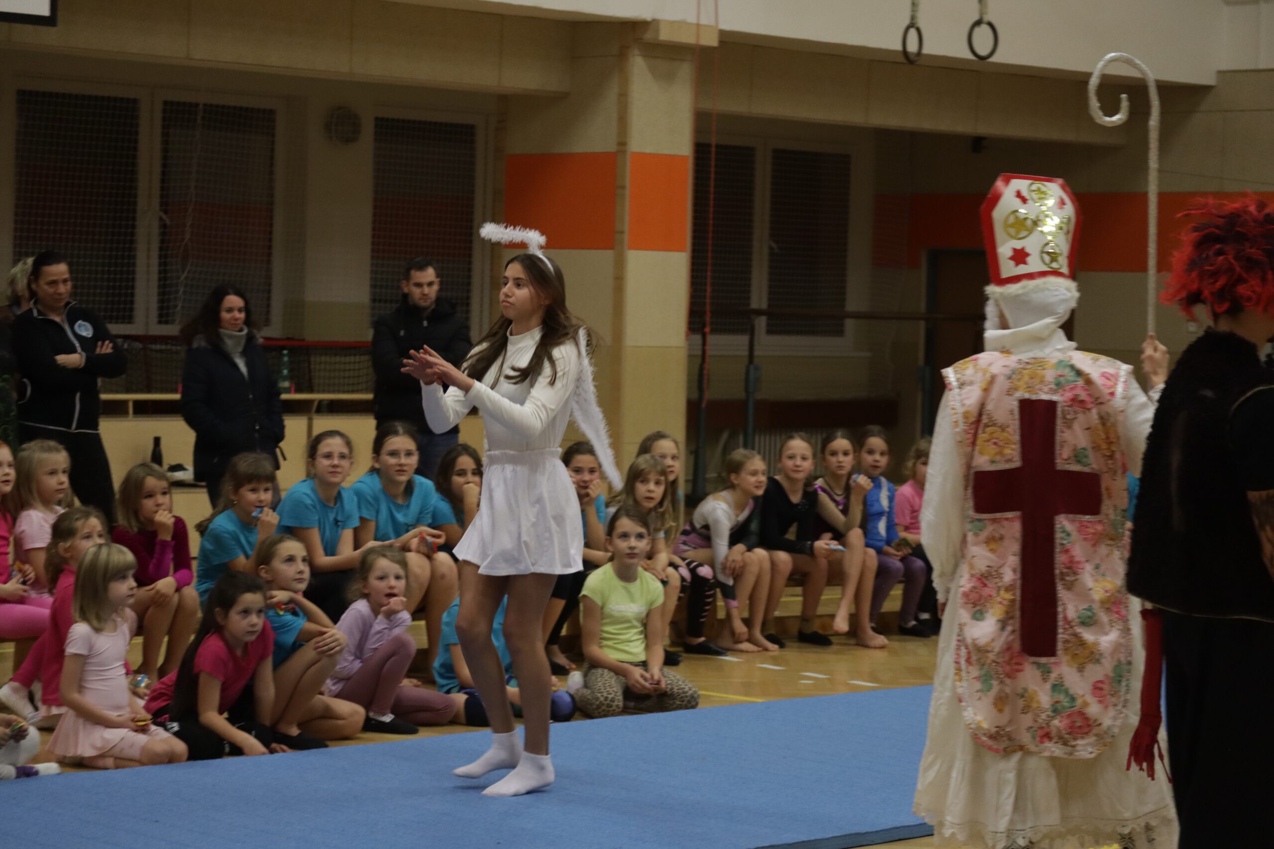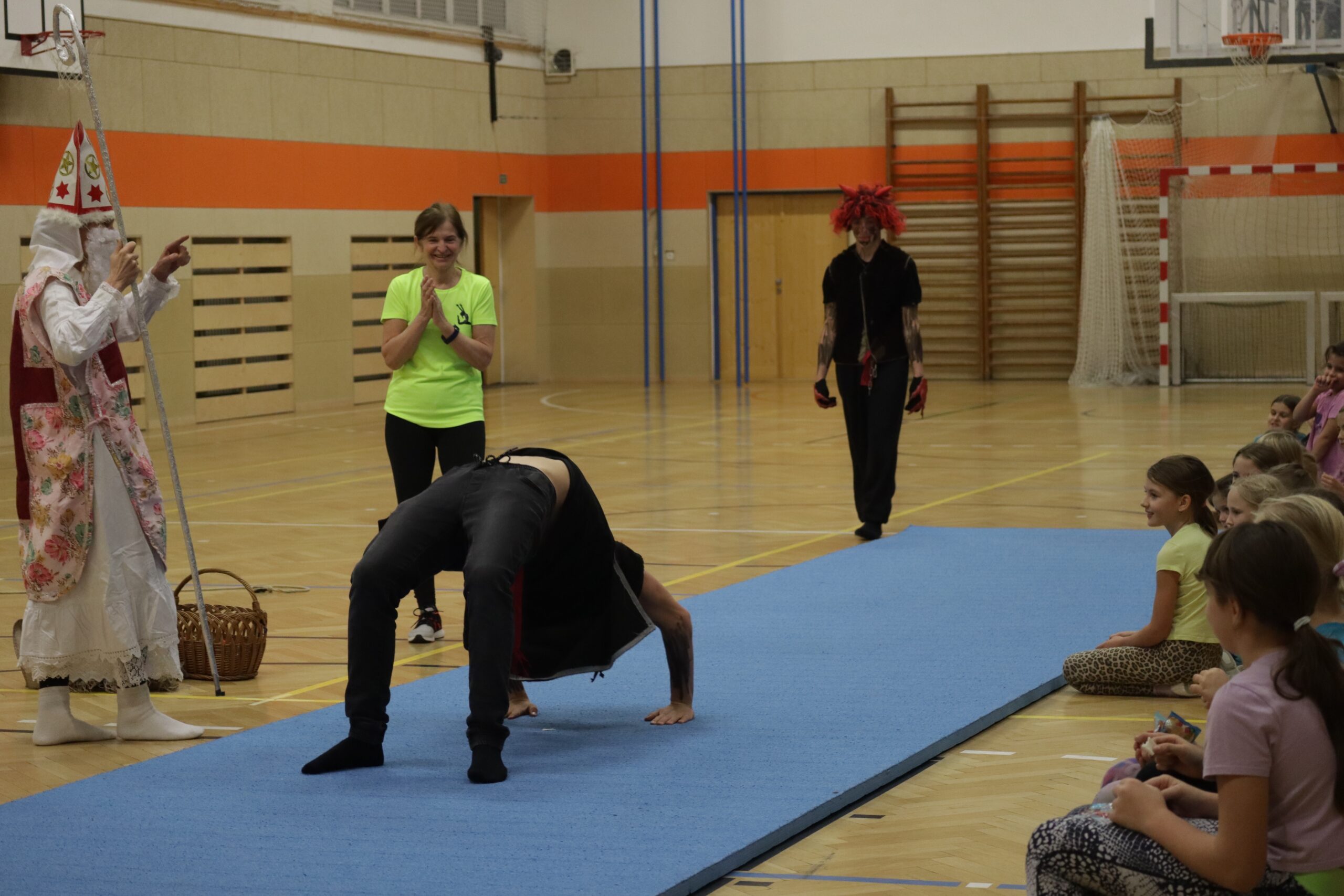 A protože Mikuláš přišel na sportovní trénink, musely kluci i holčičky předvést pár cviků na koberci, aby si zasloužily sladkou odměnu. Cvičení zlákalo i čerty a andílky a tak si také něco z akrobacie vyzkoušeli. Kupodivu jim to docela šlo.