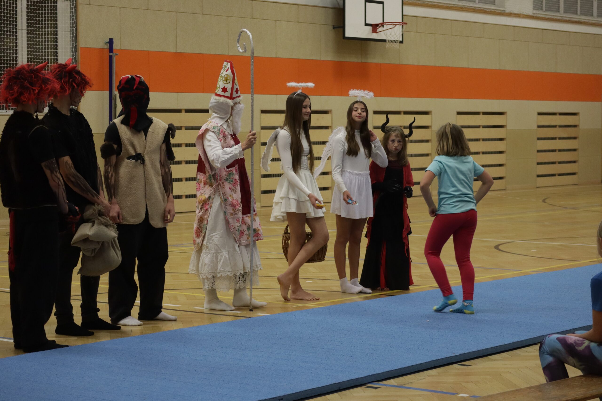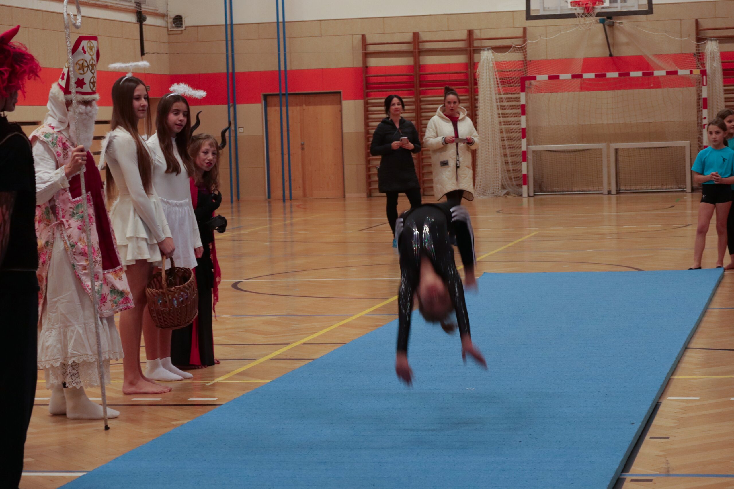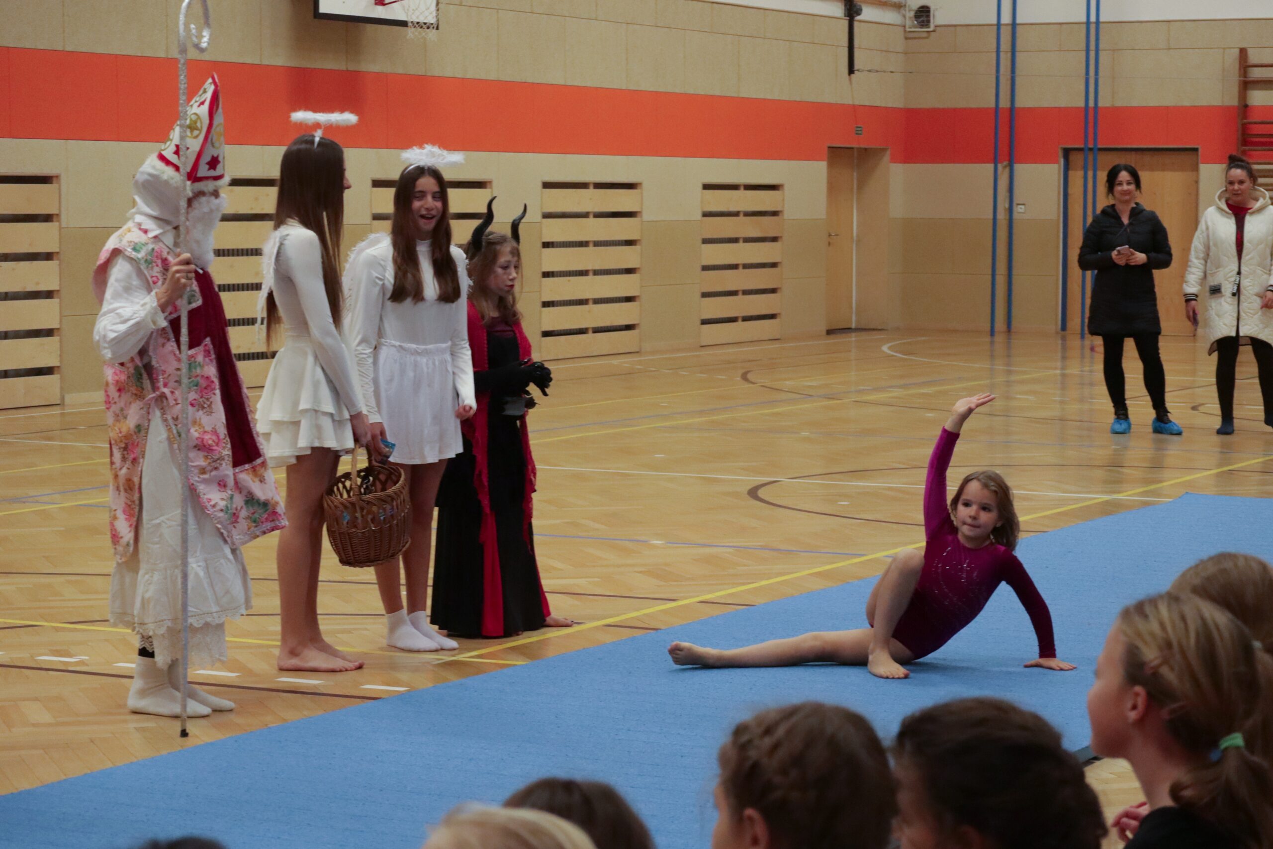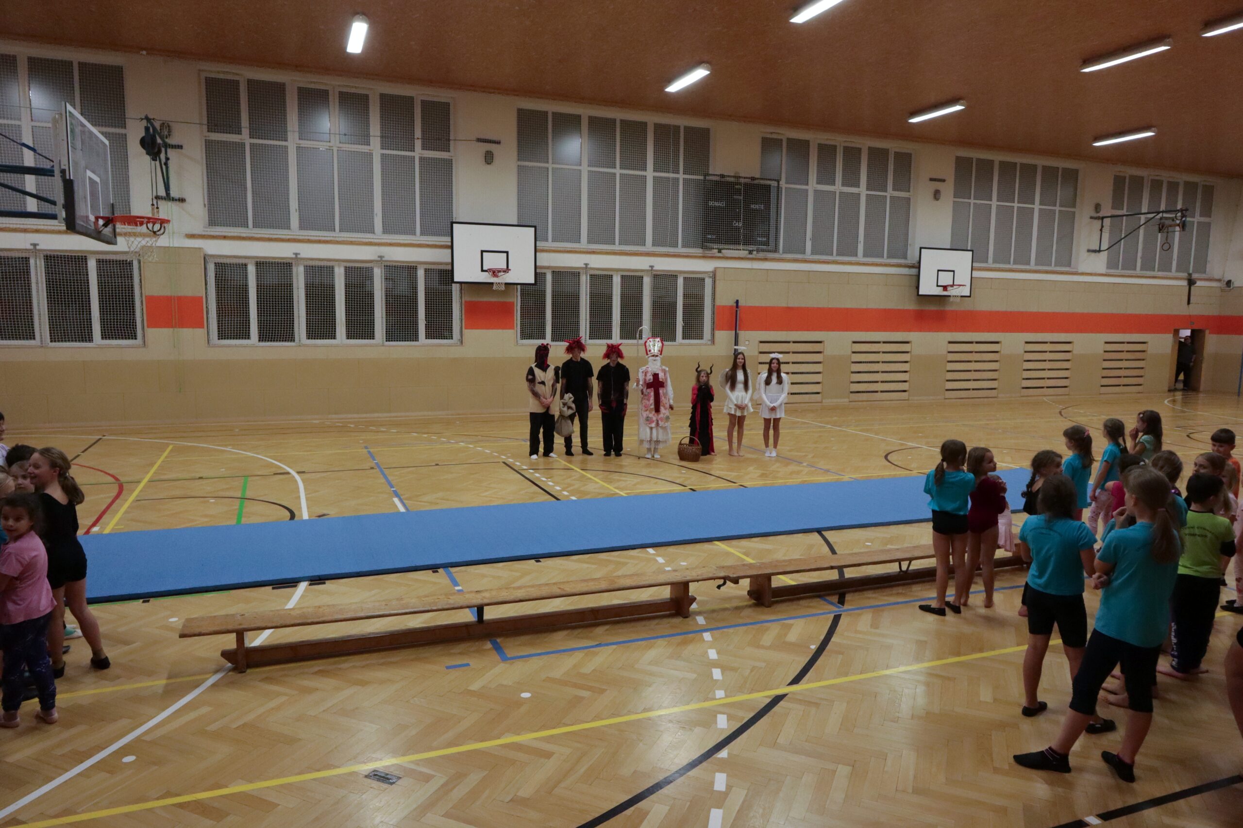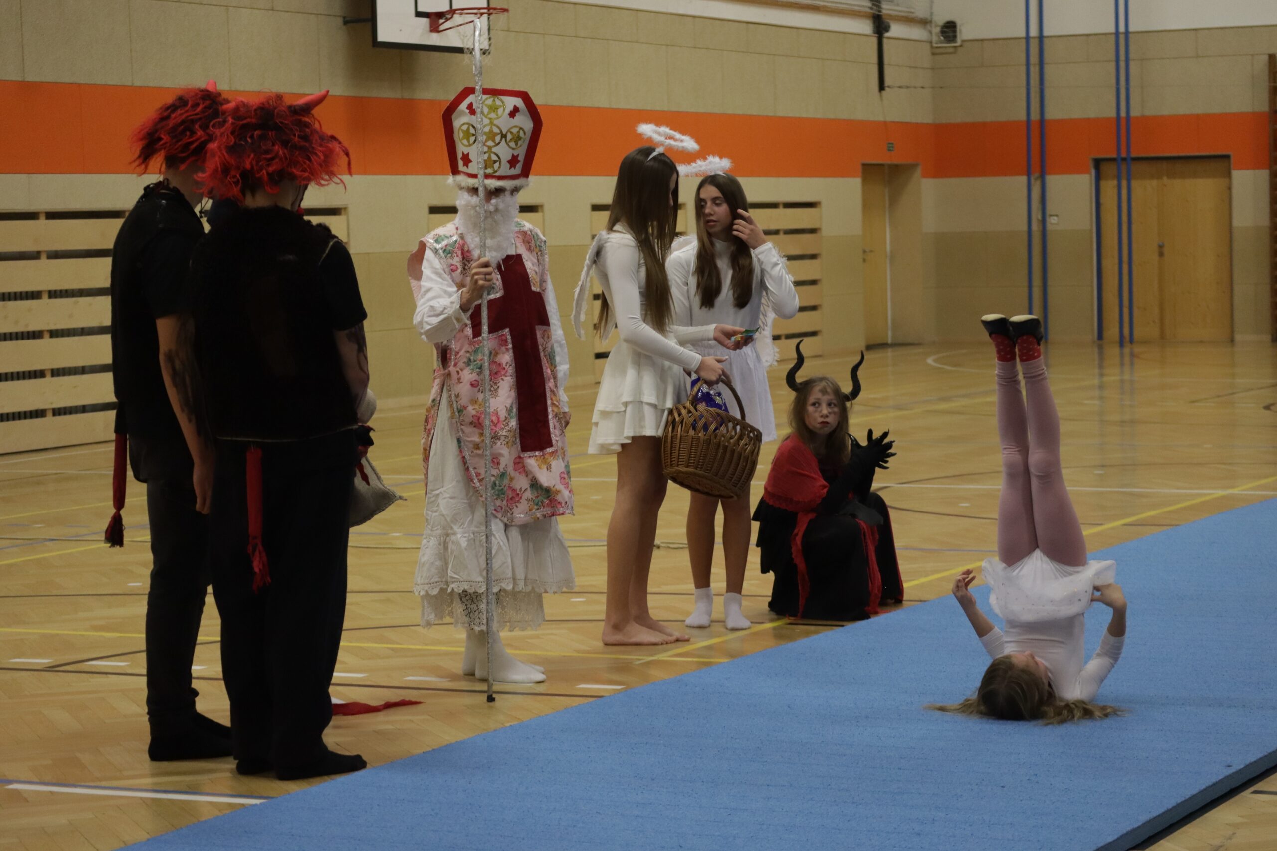 A protože Mikuláš přišel na sportovní trénink, musely kluci i holčičky předvést pár cviků na koberci, aby si zasloužily sladkou odměnu. Cvičení zlákalo i čerty a andílky a tak si také něco z akrobacie vyzkoušeli. Kupodivu jim to docela šlo.