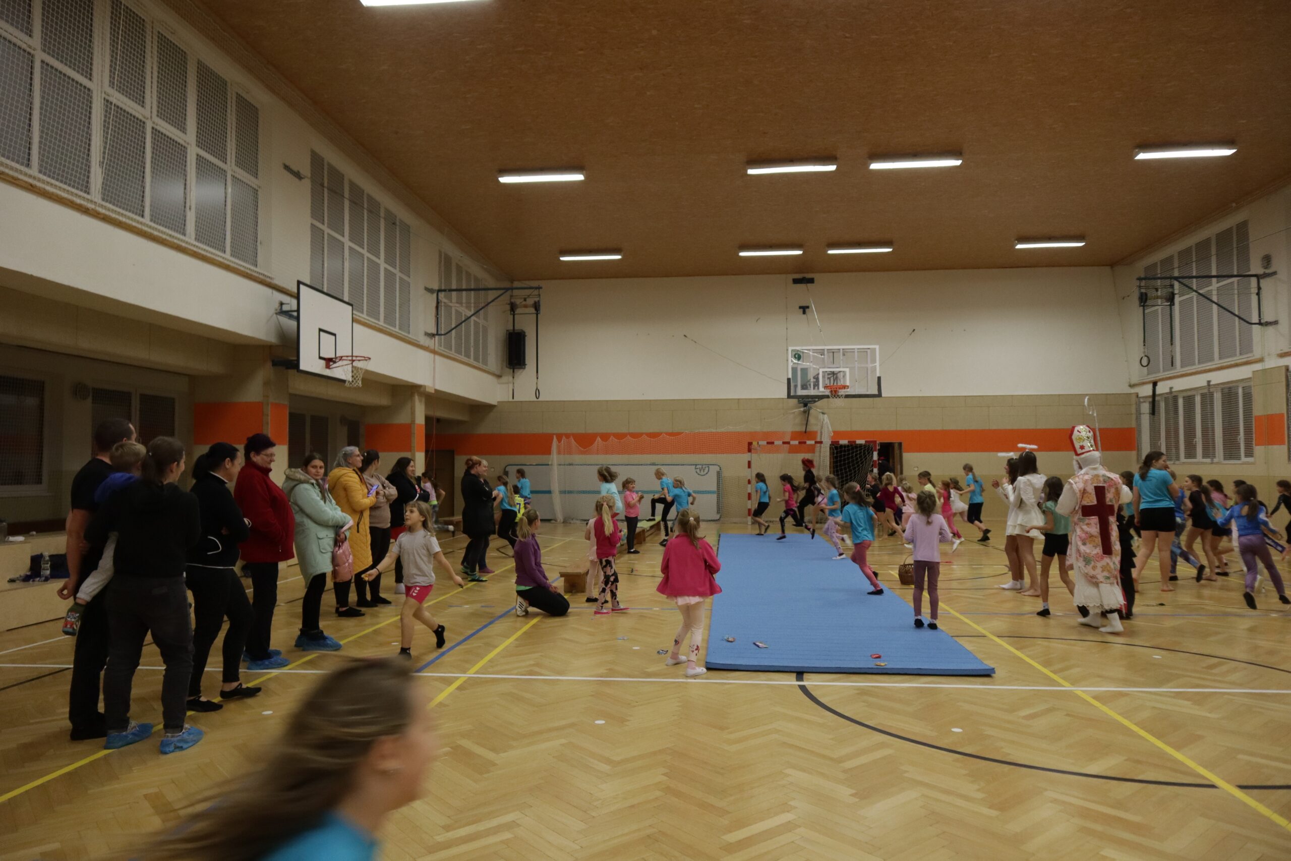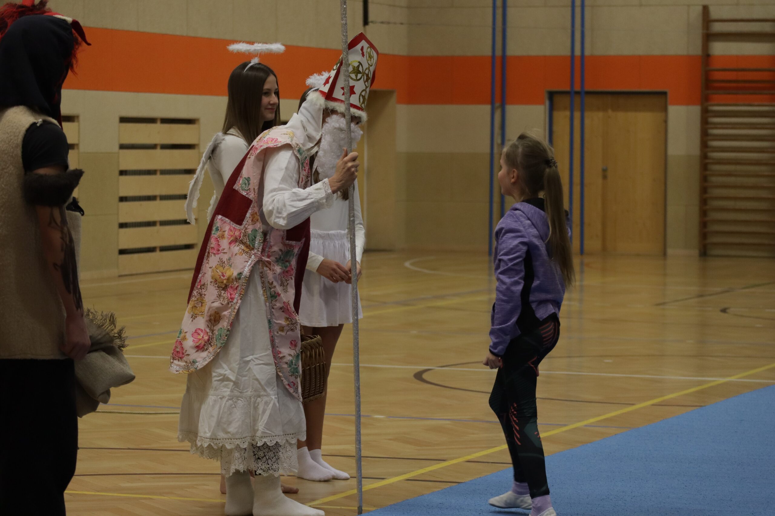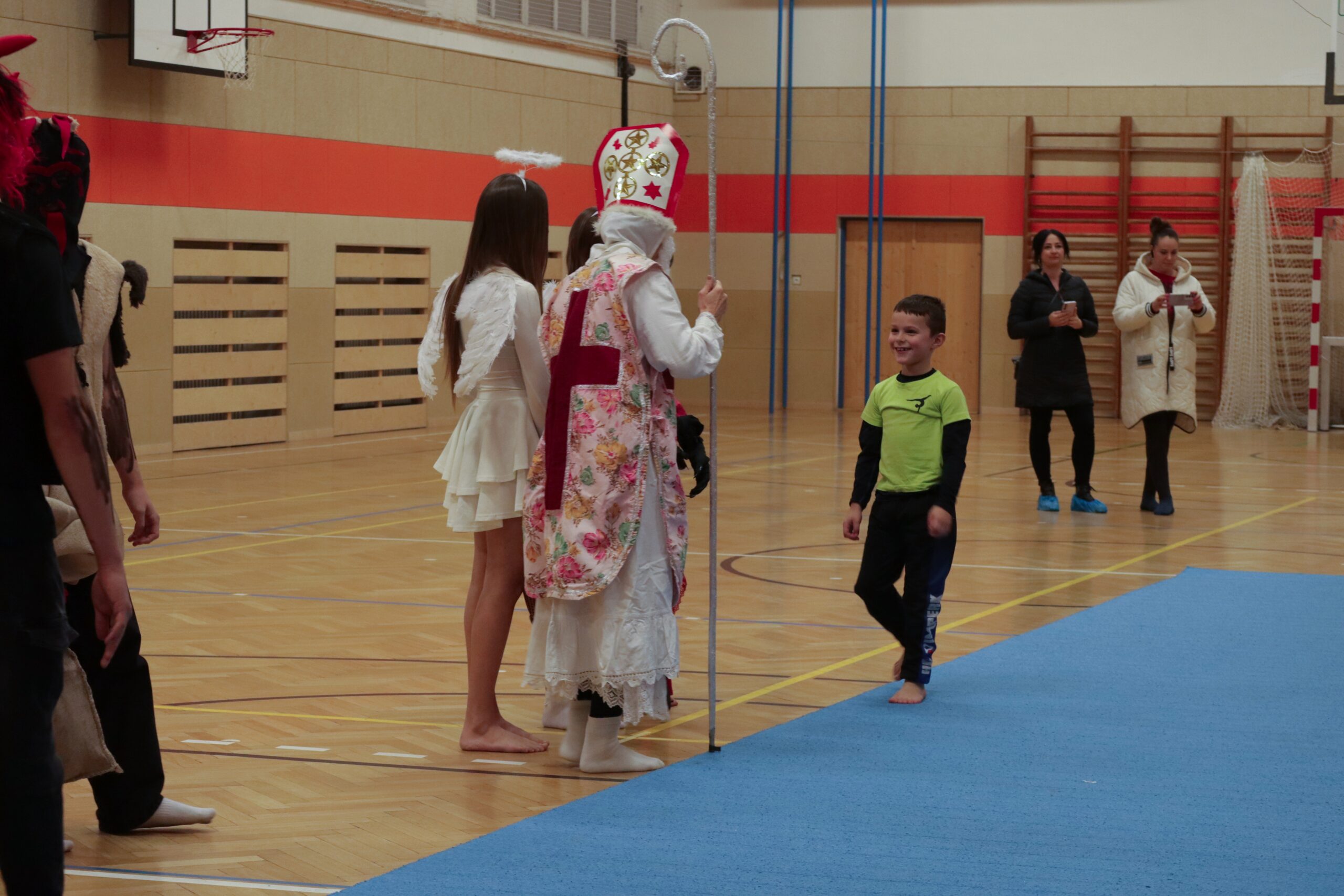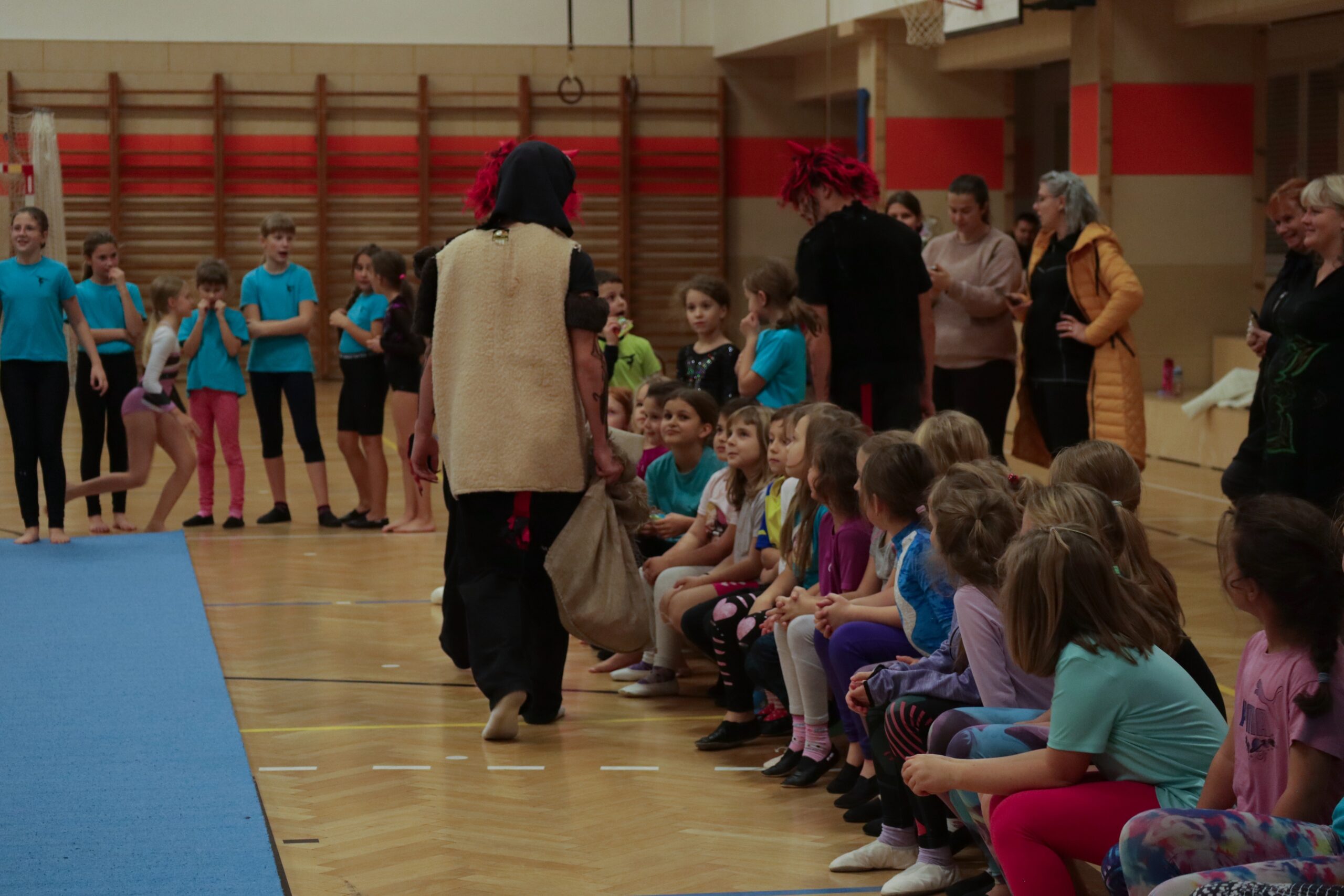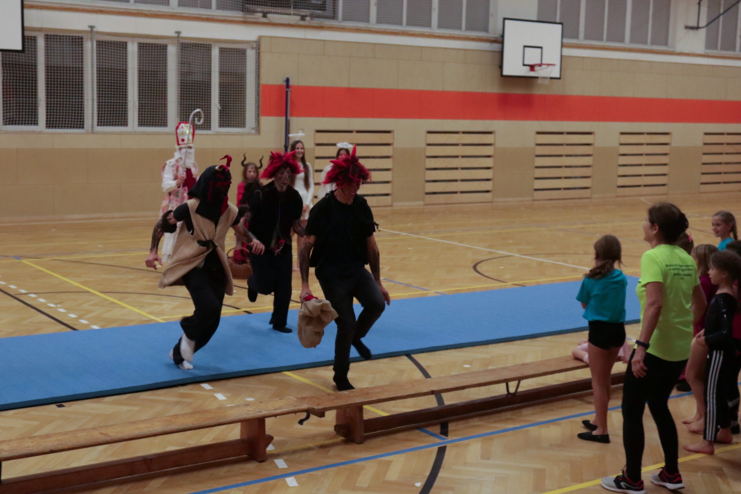 A protože Mikuláš přišel na sportovní trénink, musely kluci i holčičky předvést pár cviků na koberci, aby si zasloužily sladkou odměnu. Cvičení zlákalo i čerty a andílky a tak si také něco z akrobacie vyzkoušeli. Kupodivu jim to docela šlo.