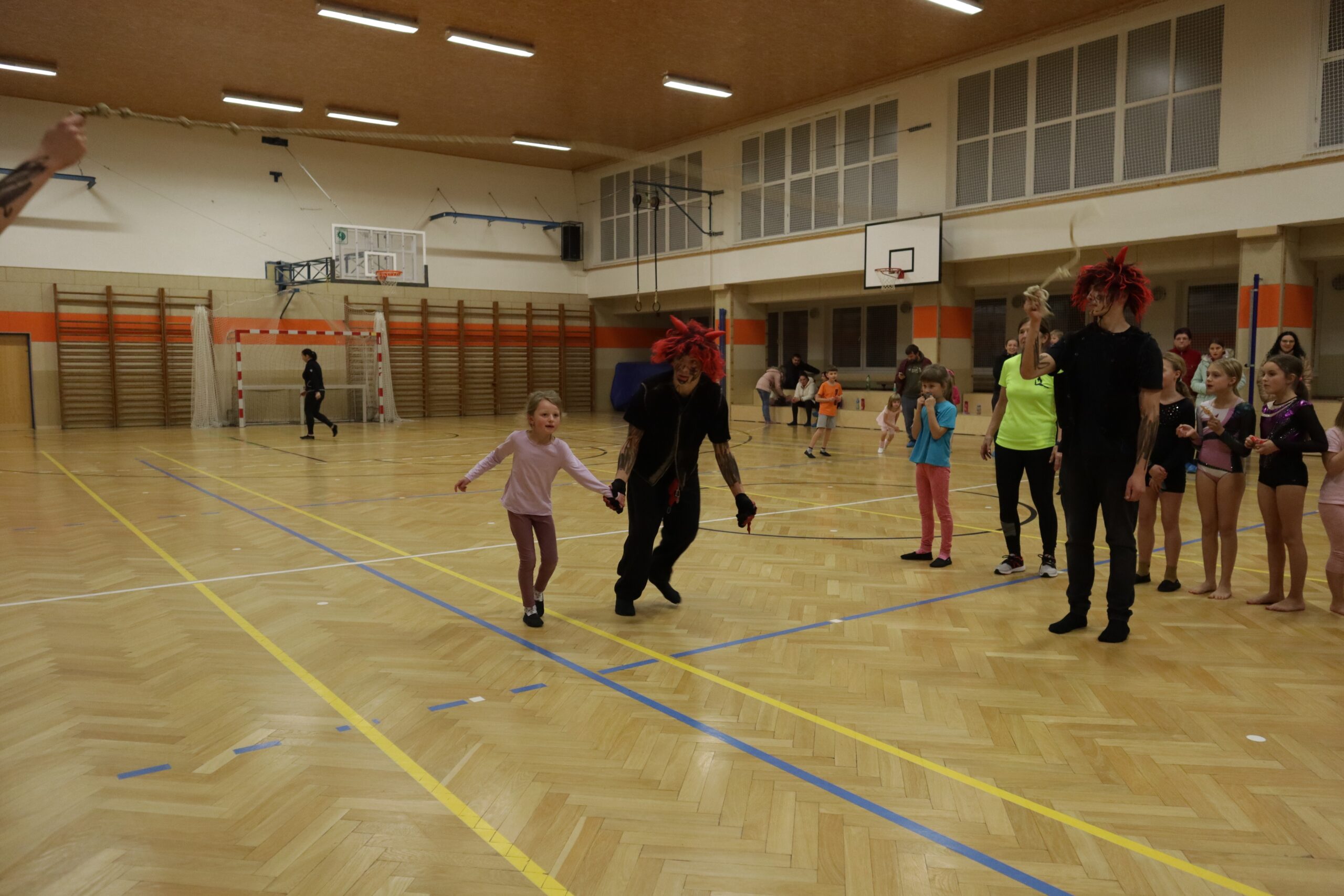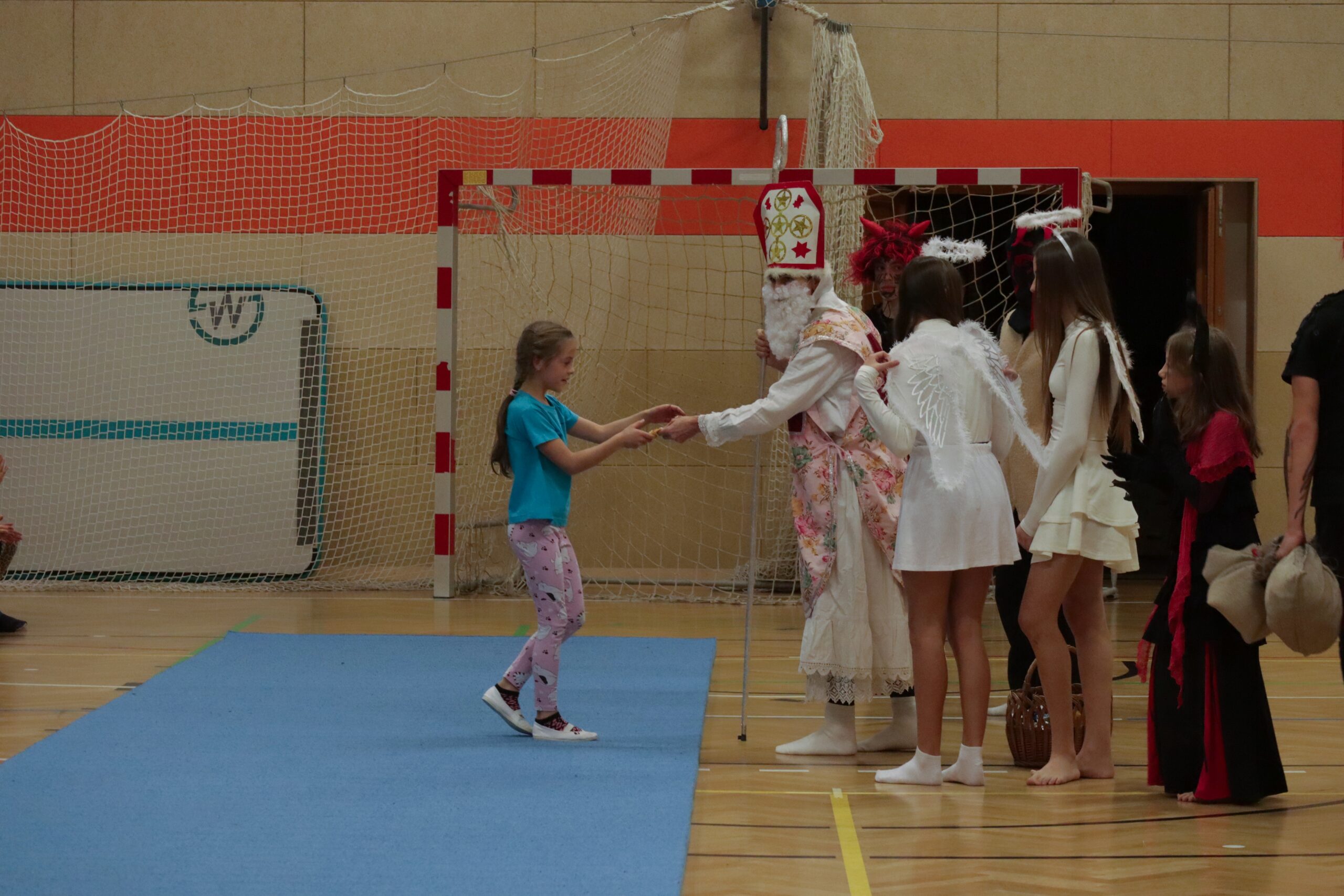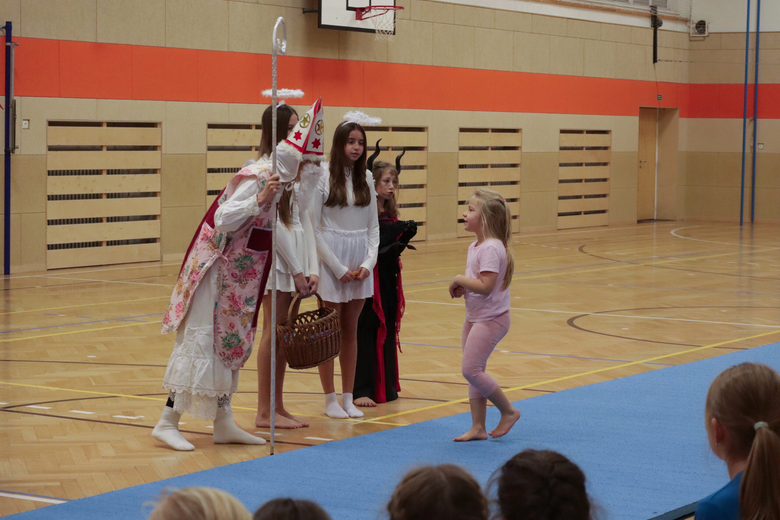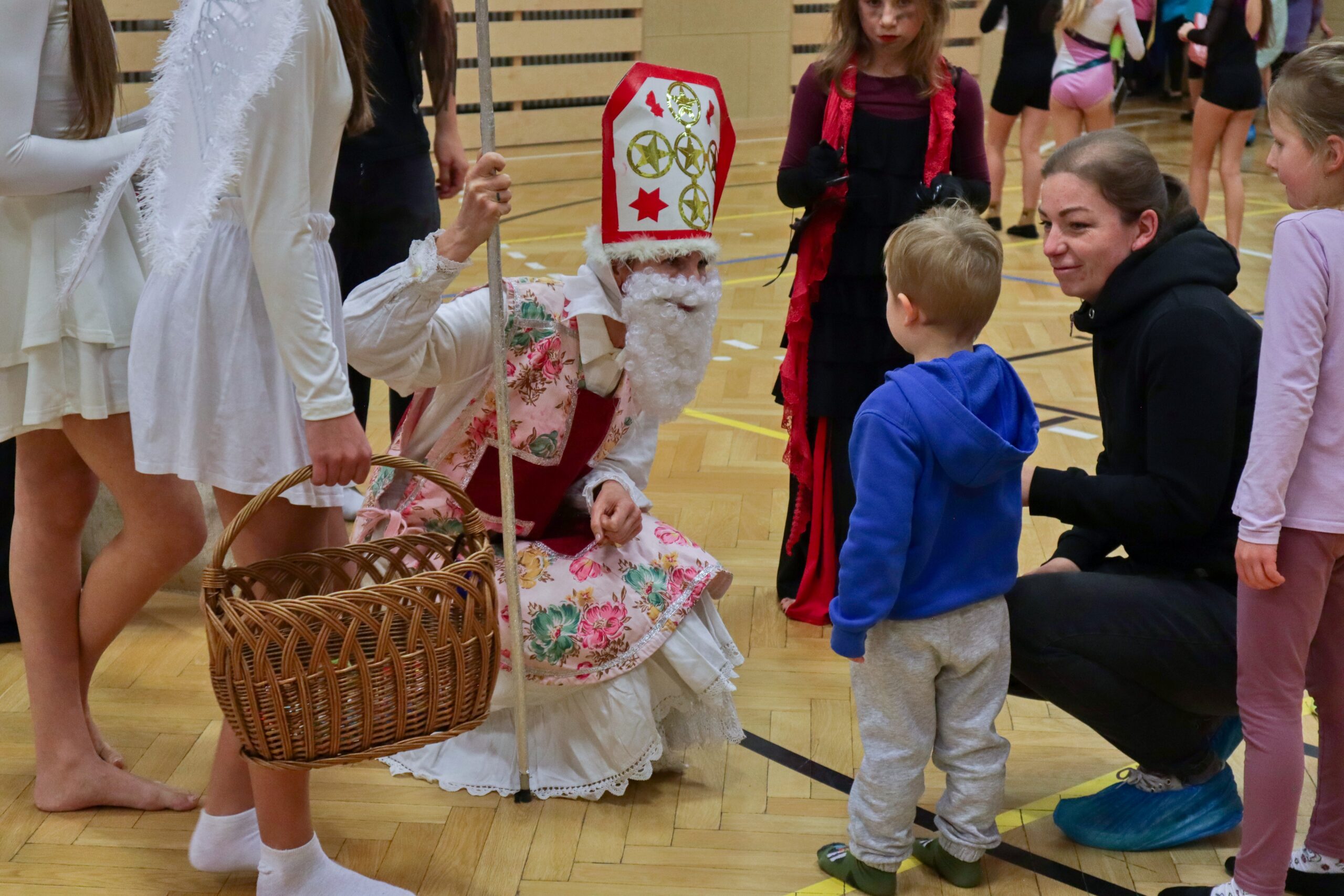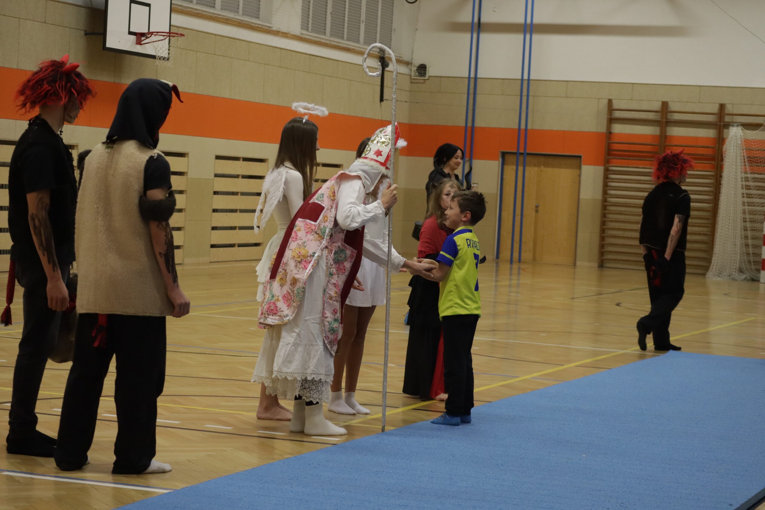 A protože Mikuláš přišel na sportovní trénink, musely kluci i holčičky předvést pár cviků na koberci, aby si zasloužily sladkou odměnu. Cvičení zlákalo i čerty a andílky a tak si také něco z akrobacie vyzkoušeli. Kupodivu jim to docela šlo.