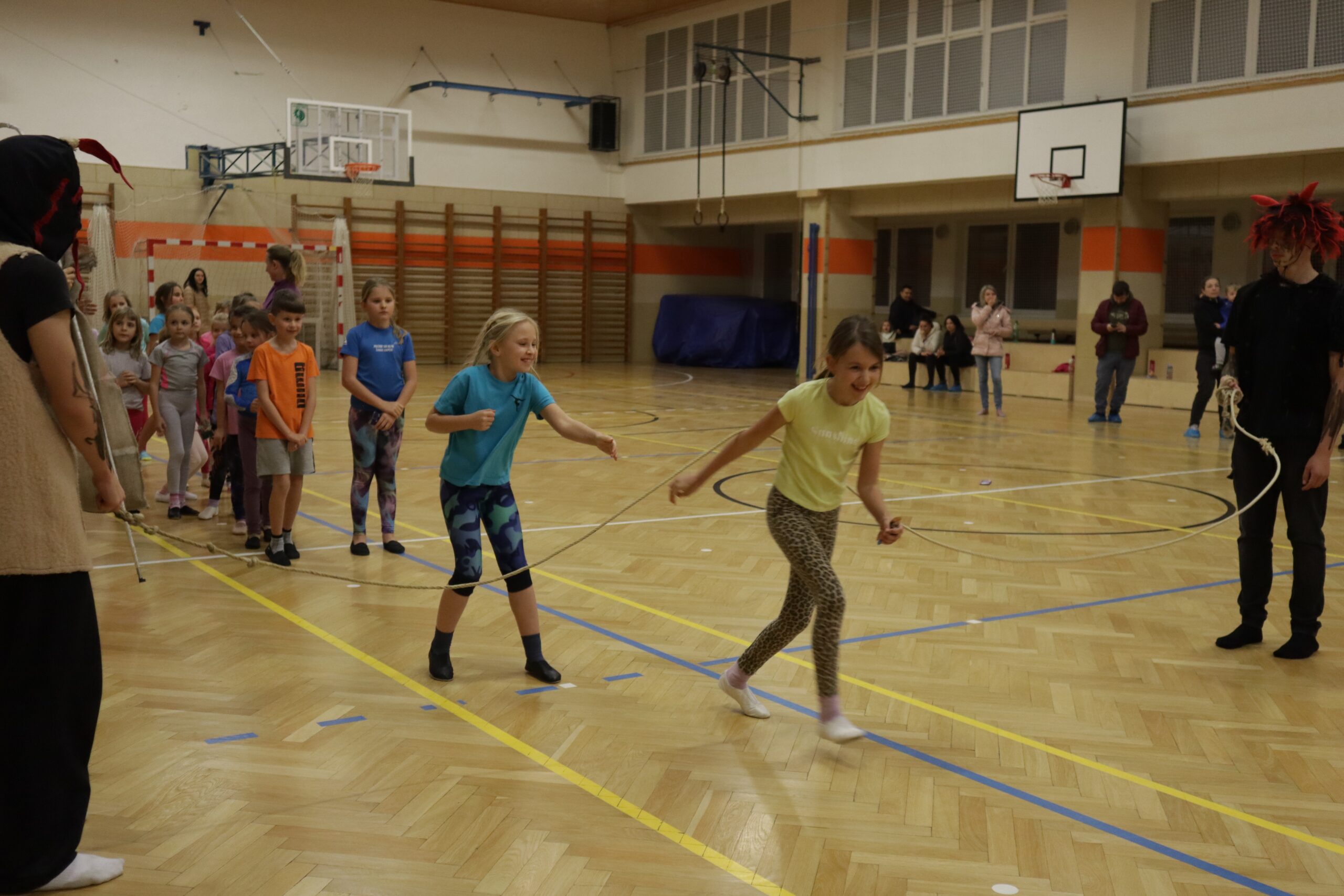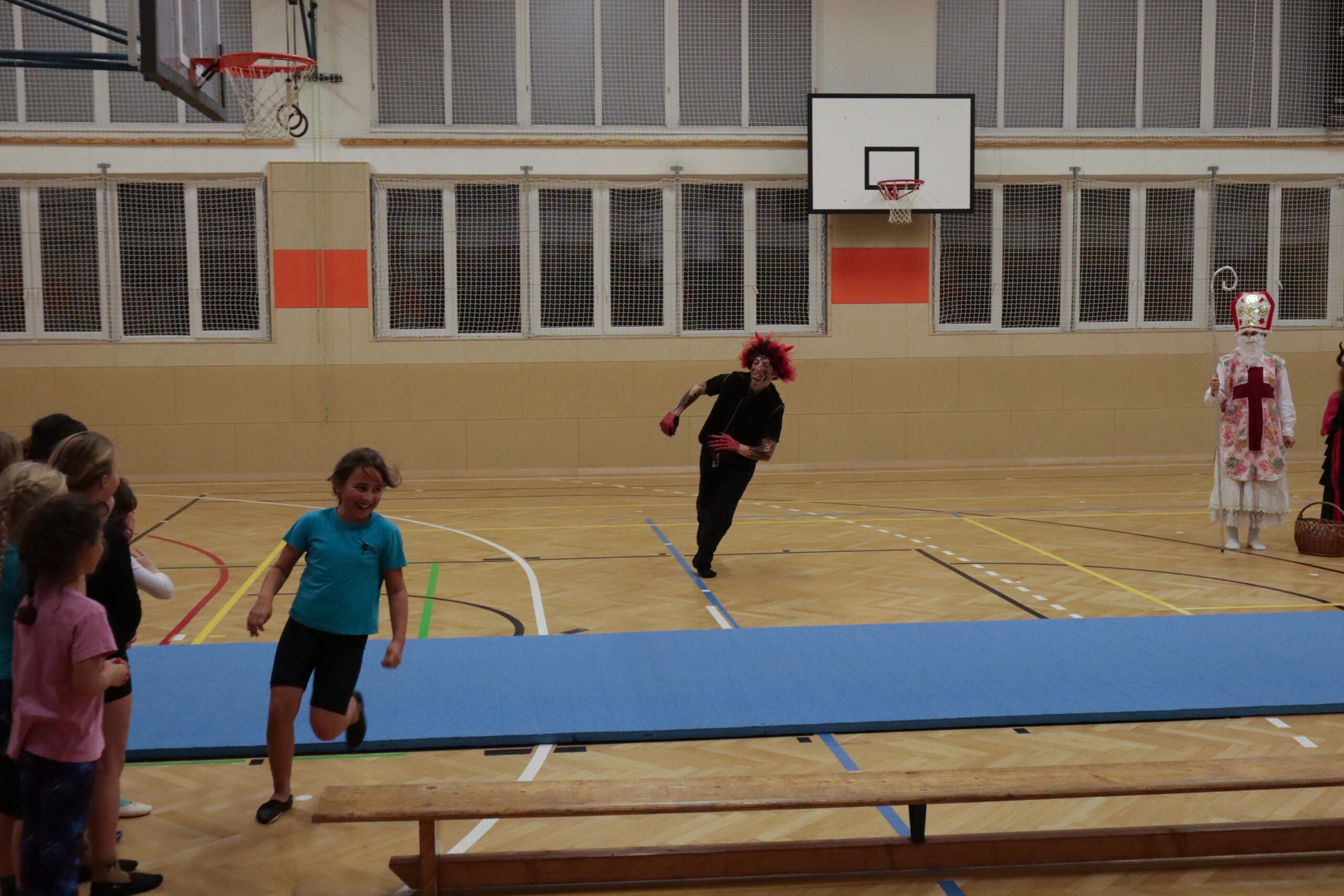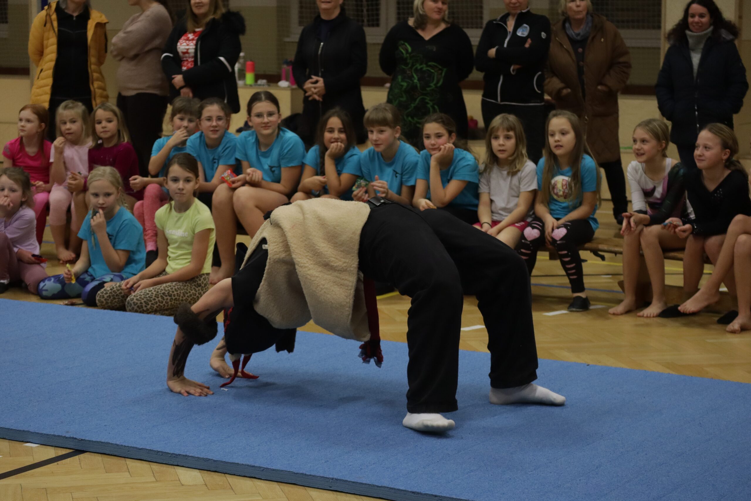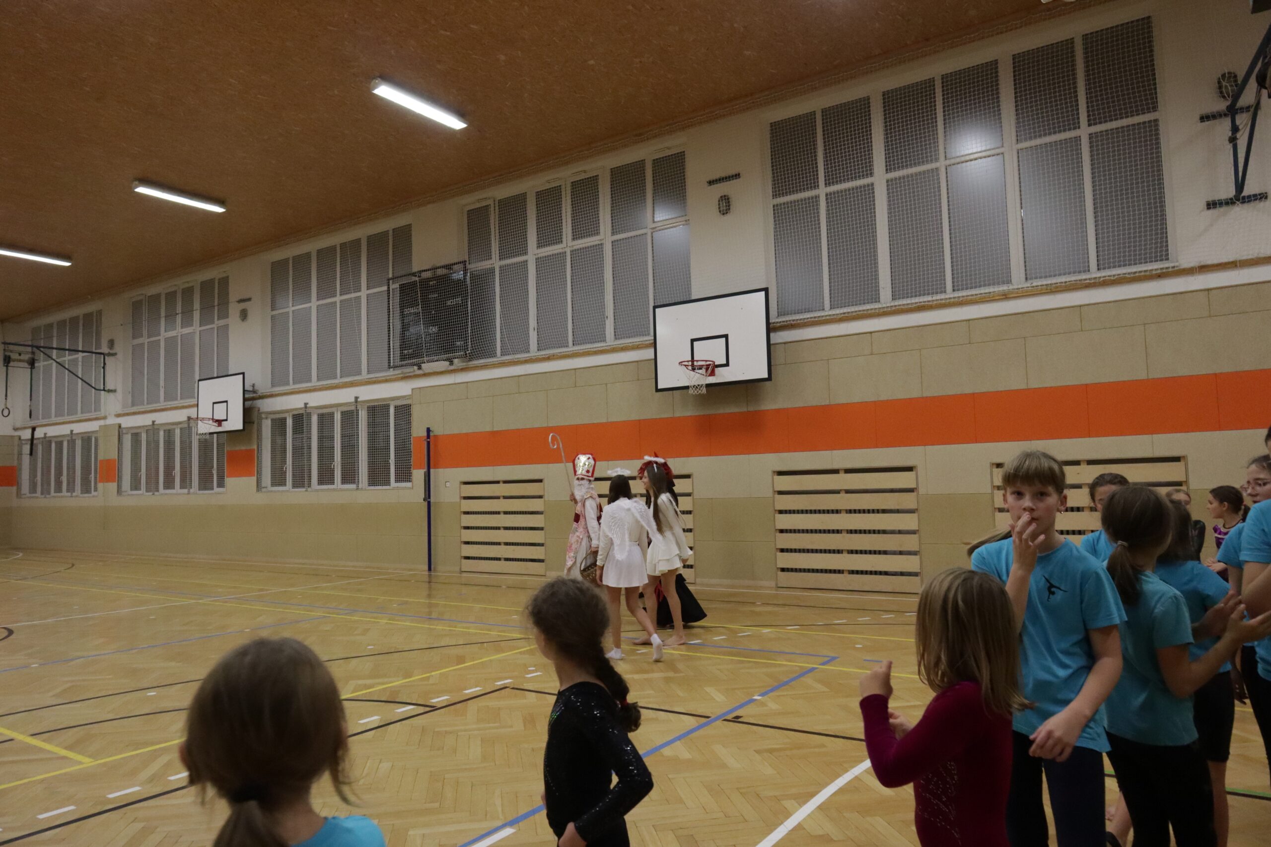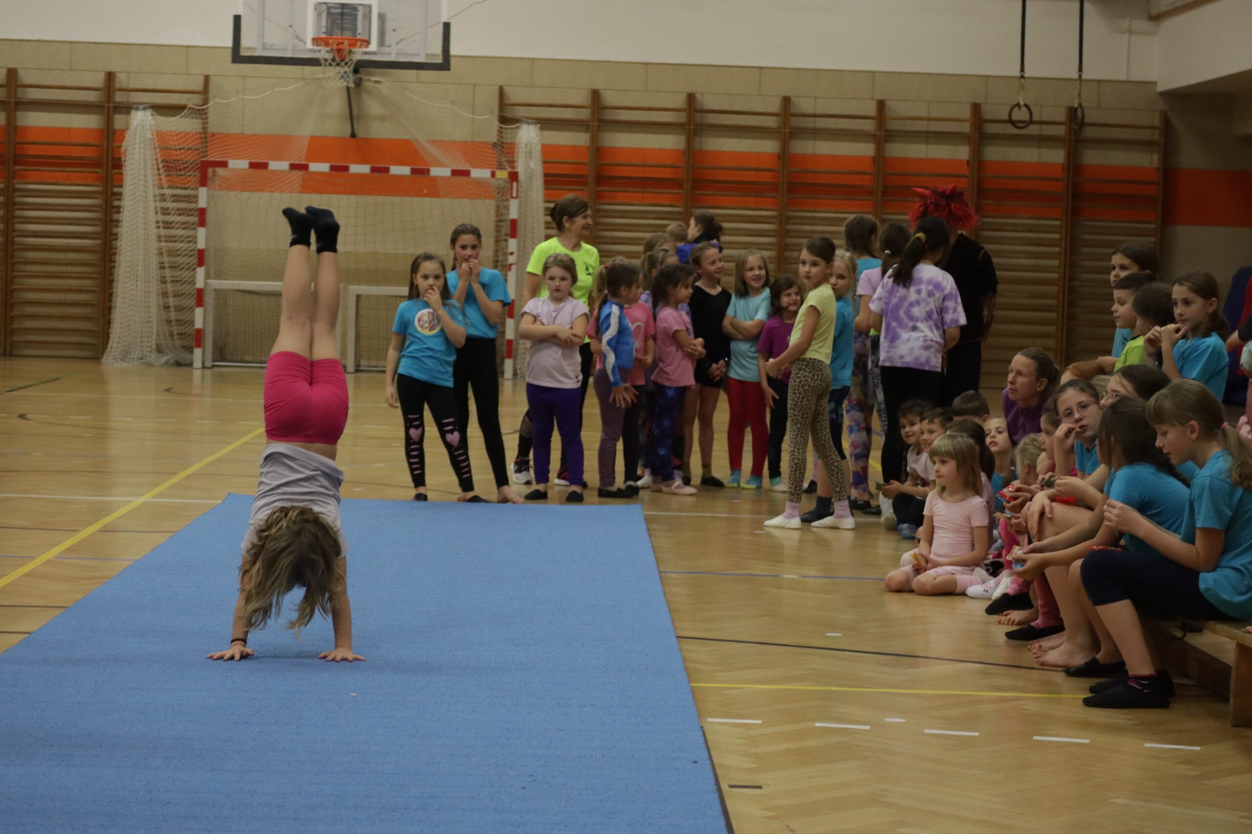 A protože Mikuláš přišel na sportovní trénink, musely kluci i holčičky předvést pár cviků na koberci, aby si zasloužily sladkou odměnu. Cvičení zlákalo i čerty a andílky a tak si také něco z akrobacie vyzkoušeli. Kupodivu jim to docela šlo.