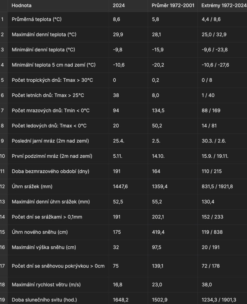 Roční bilance meteorologické stanice ve Waldhäuser pod Luzným je zde. S průměrnou teplotou 8,6 stupně Celsia v roce 2024 zaznamenala nejteplejší rok od začátku měření, tedy od roku 1972.
