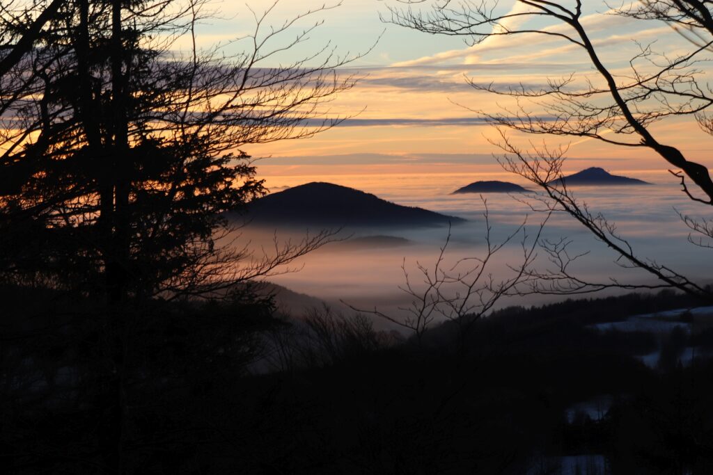Za další dva dny jsme odjeli daleko na sever. Po prohýřené noci mě Klubíčko dovezla pod horu Luž. Spěchám v pološeru vzhůru, jako bych byl zase mladý, vím, že předhoním i slunce, které se zatím ukrývá za horami. Vrcholek je pokryt ledovou kápí, po cestě se nedá jít, musím přímo lesem po kamení, kořenech, klaccích a listí. A všude v údolí leží mraky, z nichž vystupuje Ralsko, dvojhrb Bezdězu, dále k jihu Klíč a ještě dále Sedlo a Milešovka. Na všech těch horách jsme už spolu stáli. A teď tu vystupují z mořské hlubiny noci, ztišené, zčernalé majáky. Lze dohlédnout z vrcholu na vrchol.