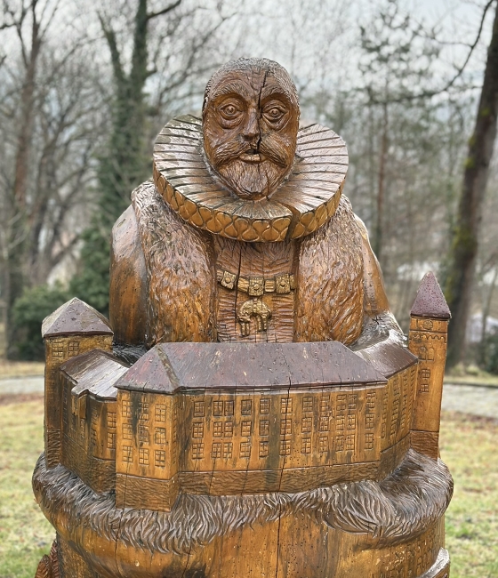 Už i tento dřevěný pan Vilém z Rožmberka něco ve Vimperku pamatuje.