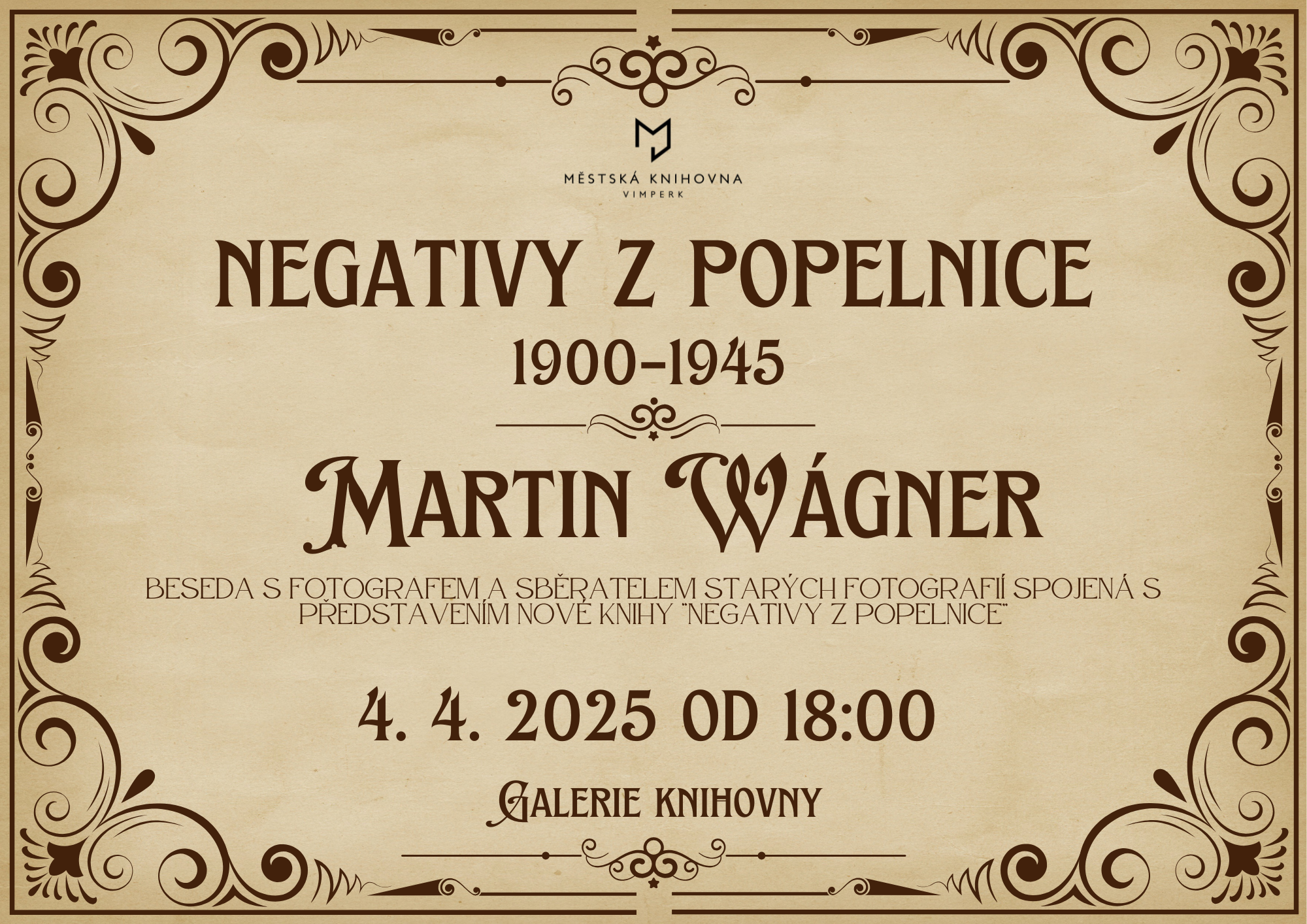 Městská knihovna Vimperk Vás zve v pátek 4. dubna od 18:00 na besedu fotografa a sběratele Martina Wágnera „Negativy z popelnice: 1900–1945“. Beseda doprovodí stejnojmennou výstavu, která bude v galerii knihovny vystavena po celý duben. Chcete-li si poslechnout, jak vznikl nápad sbírat a vyvolávat staré a zapomenuté negativy, pátrat po osudech míst a aktérů na fotkách zvěčněných a rekonstruovat na nich „malé dějiny“ 20. století, určitě si nenechte besedu spojenou s představením nově vydané knihy ujít.
