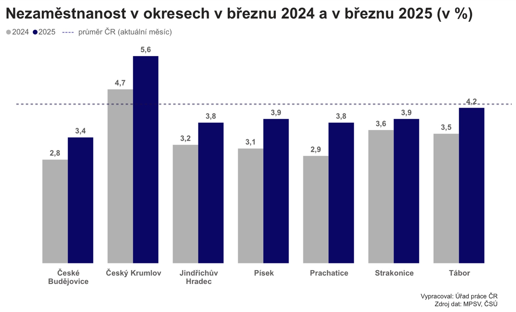 Podíl nezaměstnaných ke konci března poklesl v Jihočeském kraji na 3,9%. V meziročním srovnání byl počet uchazečů o práci nižší o 2 509 osob. Ke konci března se zvýšil i počet poptávaných míst zaměstnavateli na jihu Čech o téměř 180 pozic. ÚP nabízel celkem 5 017 volných pracovních míst.