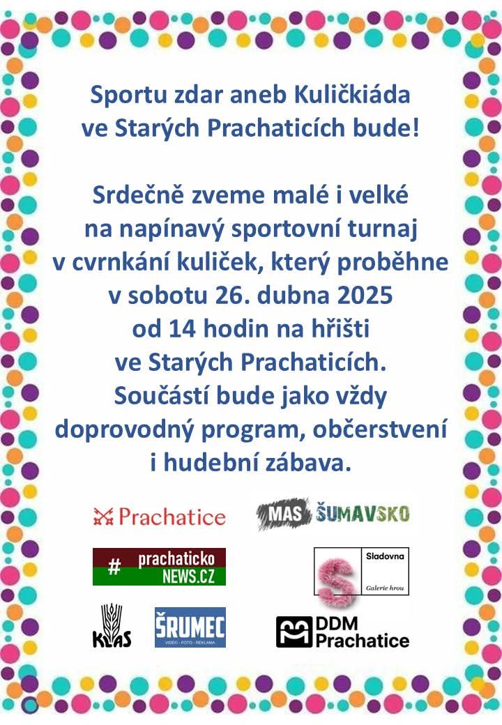 Přijďte si užít odpoledne plné zábavy a soutěžení! Zveme vás na jarní turnaj ve cvrnkání kuliček, který se koná v sobotu 26. dubna od 14 hodin na hřišti ve Starých Prachaticích.