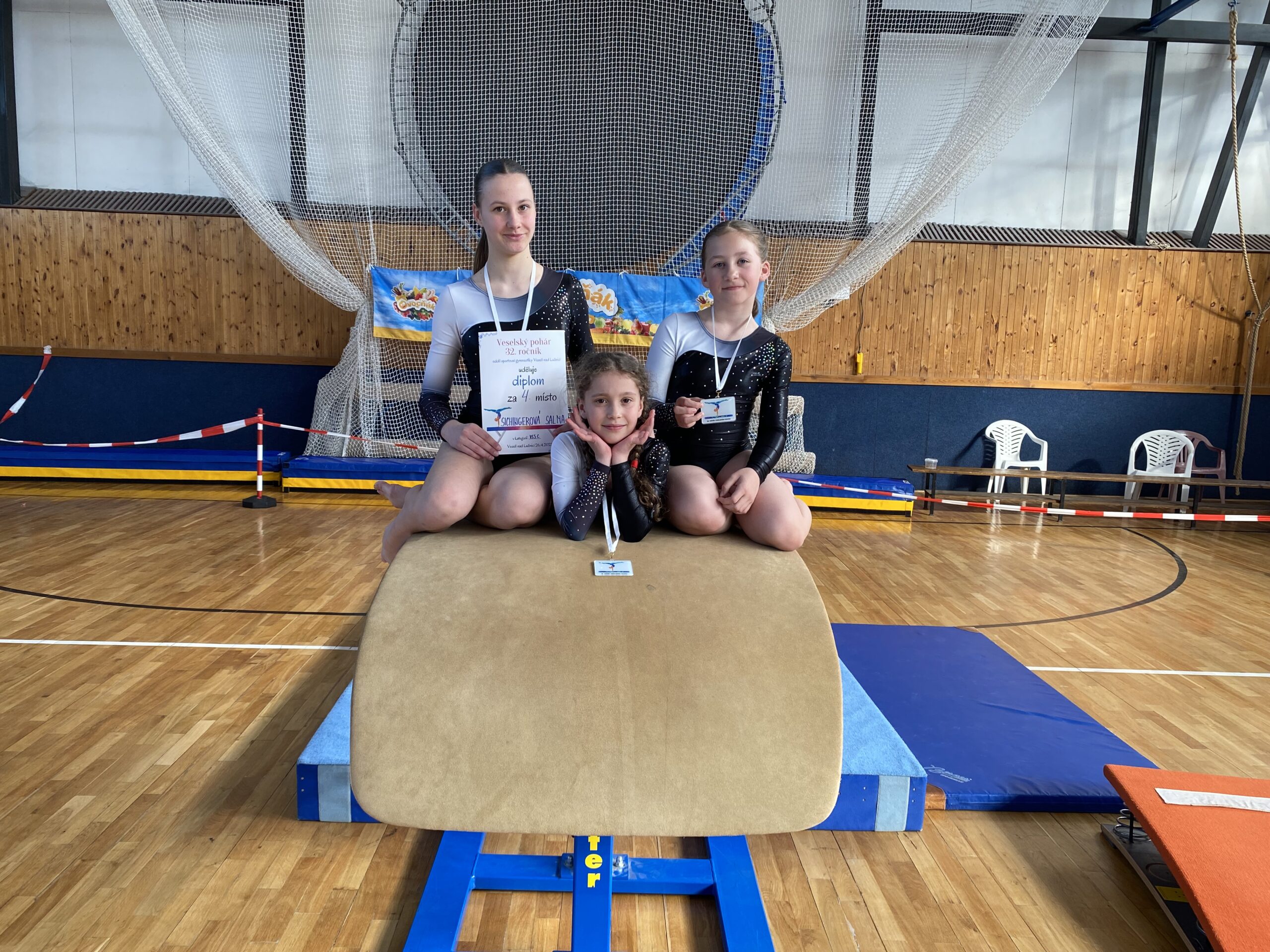 V sobotu 26.4.2025 jsme v sestavě Anetka Randáková (VS0A), Anetka Nevaeva (VS3C), Martinka Bělíková (VS4C) a Salma Sichingerová (VS5C) vyrazily do Veselí nad Lužnicí. Opět jsme v kategorii VS0A měly nováčka. Tentokráte Anetka Randáková závodila poprvé a výborně se jí povedl přeskok a bradla, bohužel na kladině a na prostných našly rozhodčí spoustu chyb, a tak celkové umístění bylo až na 24. příčce. Anetka Nevaeva skočila přeskok ještě lépe než minule a konečně má na svém kontě první známku nad 10 bodů, což byl její cíl. Naopak na kladině zaváhala a pád ji připravil o cenné body. Konečné 15. pořadí ji však přesto potěšilo. Pro Martinku Bělíkovou a Salmu Sichingerovou to byl pro letošek také první závod. Martinka vylepšila svůj přeskok a zacvičila velice pěkně i na kladině. Měla obrovskou radost, že kladinu zvládla bez pádu a výsledné 12. místo stojí za gratulaci. Salma zacvičila hezky a sebejistě na všech nářadích, avšak body jsme při závodu nestihly počítat. To největší překvapení pro nás všechny přišlo při vyhlašování poslední kategorie VS5C. Salma totiž obsadila krásné 4.místo a přivezla si domů diplom a hodnotné dárky. Ještě jednou Salmě a všem děvčatům k úspěchu gratuluji a věřím, že příště se umístíme zase o kousek lépe.