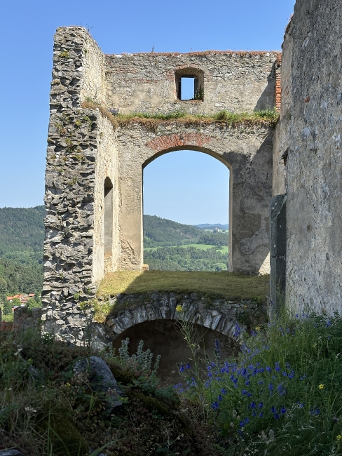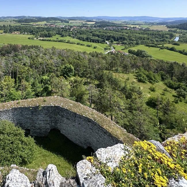 Za ideální dohlednosti je možno z Boubína spatřit cca 35 km vzdušnou čarou vzdálenou zříceninu hradu Rabí. Tentokrát se ovšem ve fotokronice nabízí pohled výrazně bližší, totiž ze židovského hřbitova města Rabí, …
