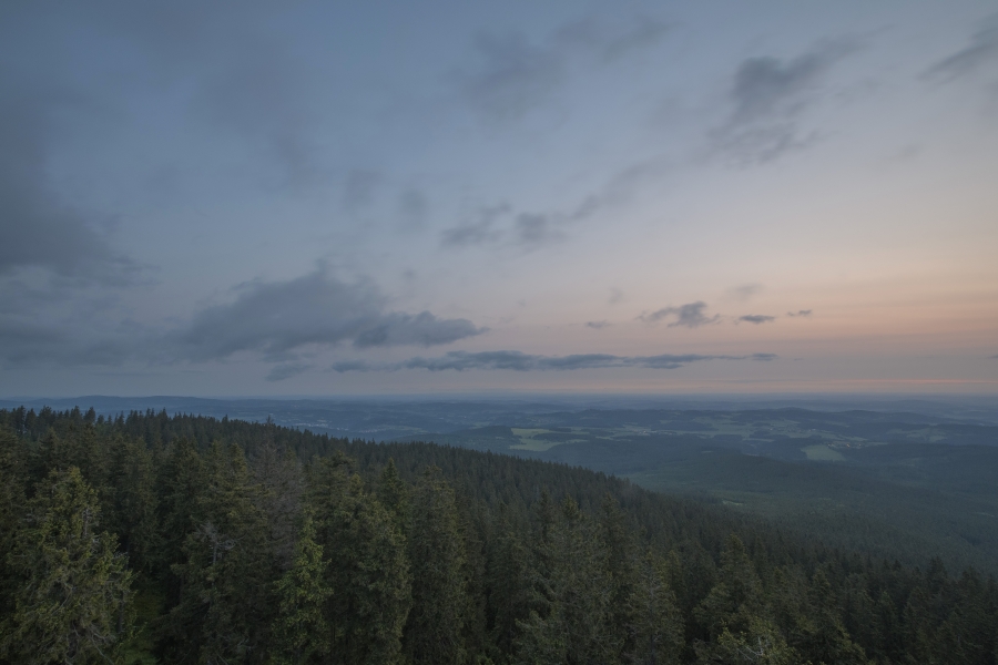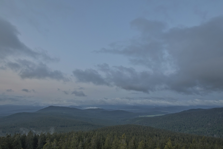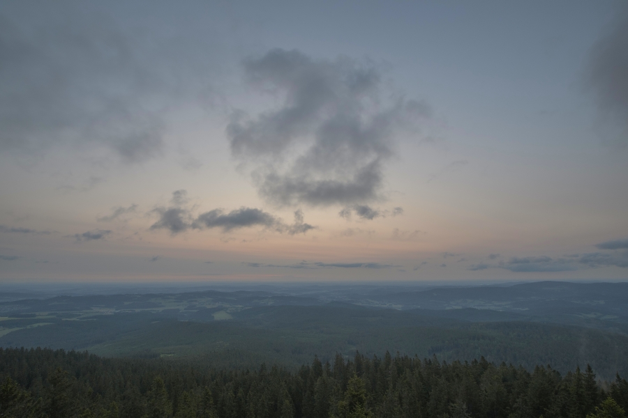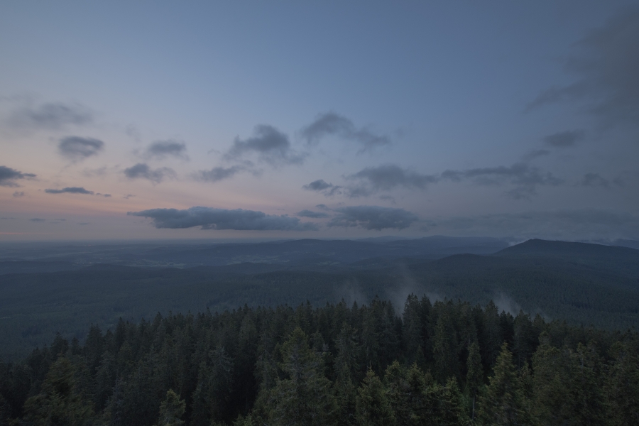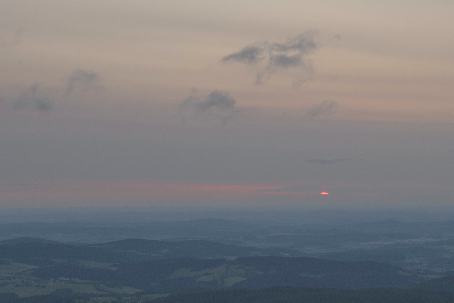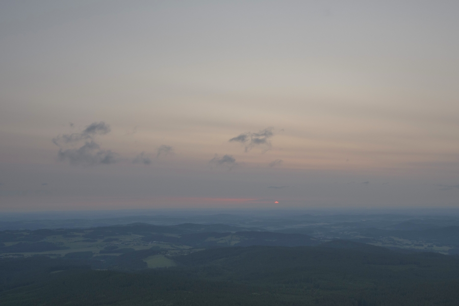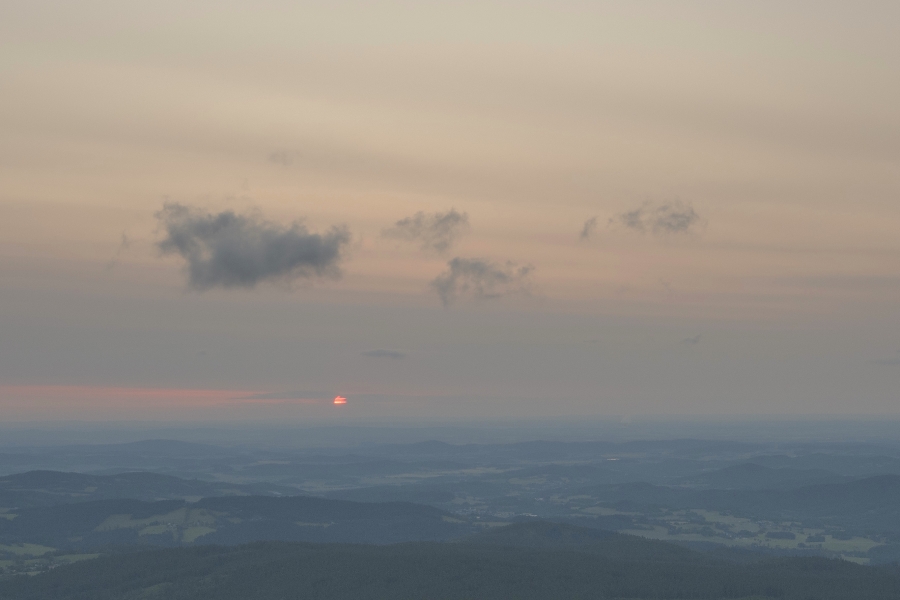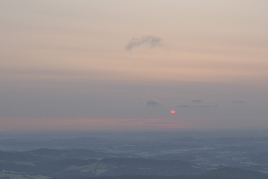 Časně ranní obloha první červnové soboty (krátce před třemi čtvrti na pět) byla zatažená, takže neslibovala viditelný sluneční východ, ale pohledem z níže položených partií se nezdálo, že by se nutně musela připlazit i mlha … teprve boubínský vrchol přišel s jinou vizí.
