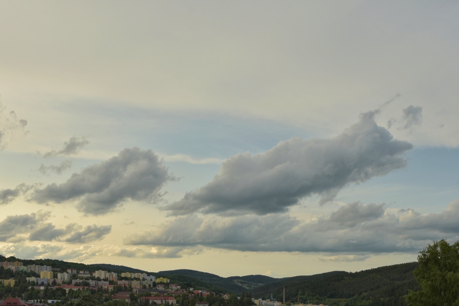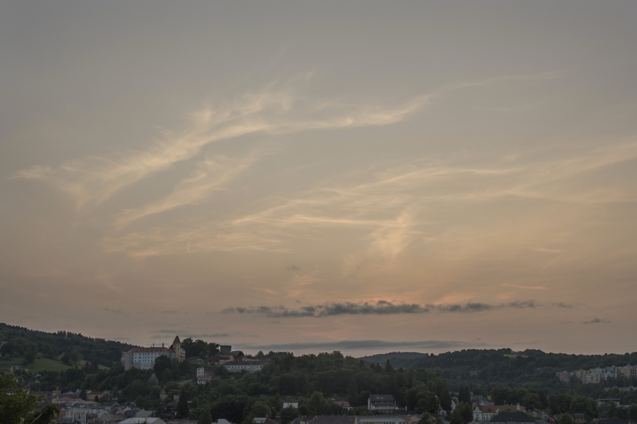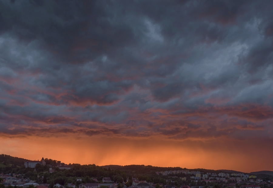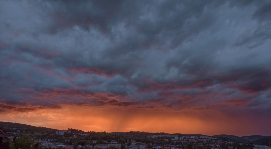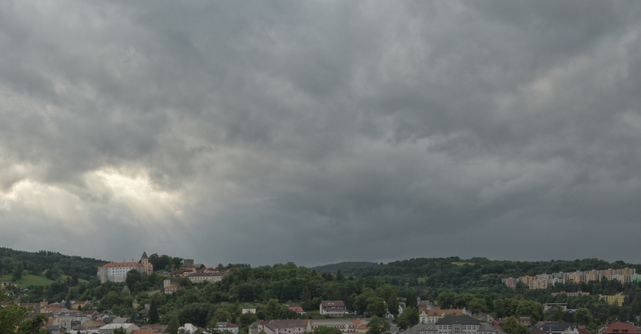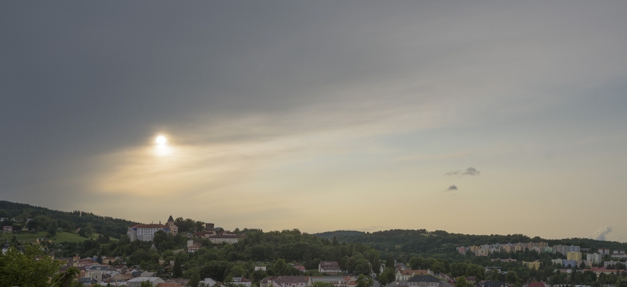 Konečně opět nad Vimperkem k vidění cosi bouřkového, třebaže v epicentru protažené, původem mnichovské supercely se ocitly sousední končiny a naše město pouze paběrkovalo po okrajích … ale zcela určitě efektně. S ohledem na stále přetrvávající zhovadilý vynález jménem letní čas mají současné dny ještě před půl desátou večer charakter soumraku, takže je ještě poměrně slušně vidět. Hodiny ukazovaly 21.21, když se nad zámkem začaly množit poměrně hojné blýskavice, občas okořeněné i zřetelnými blesky, avšak zcela bez doprovodu slyšitelného hřmění. Bylo tedy zřejmé, že v centru jistě nanejvýš zajímavého dění se odhadem octlo nejspíš vzdálené Klatovsko.