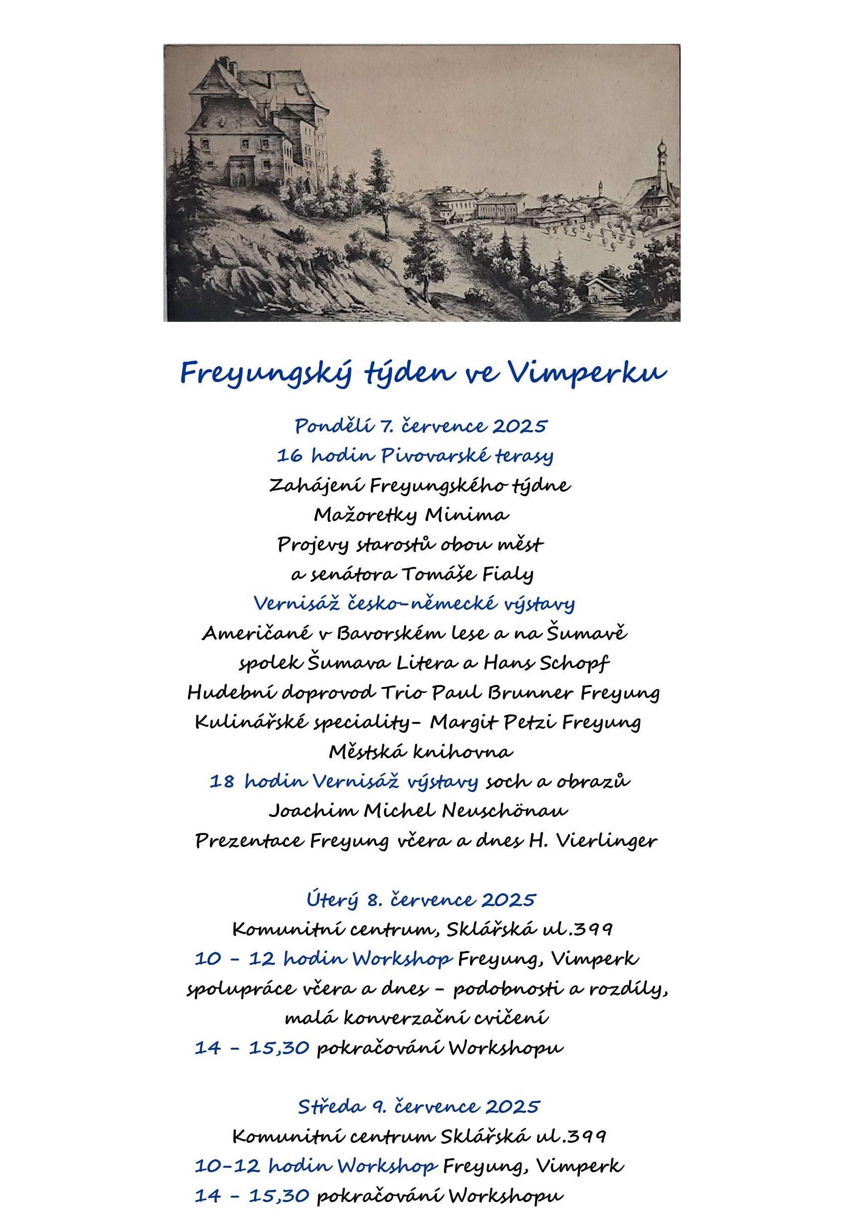 Freyungský týden ve Vimperku, konající se od 7. do 11. července 2025, nabídne pestrý program plný kulturních, společenských a vzdělávacích akcí zaměřených na česko-německou spolupráci. Návštěvníci se mohou těšit na vernisáže výstav, workshopy, koncerty, přednášky i společné prohlídky města a zámku.
