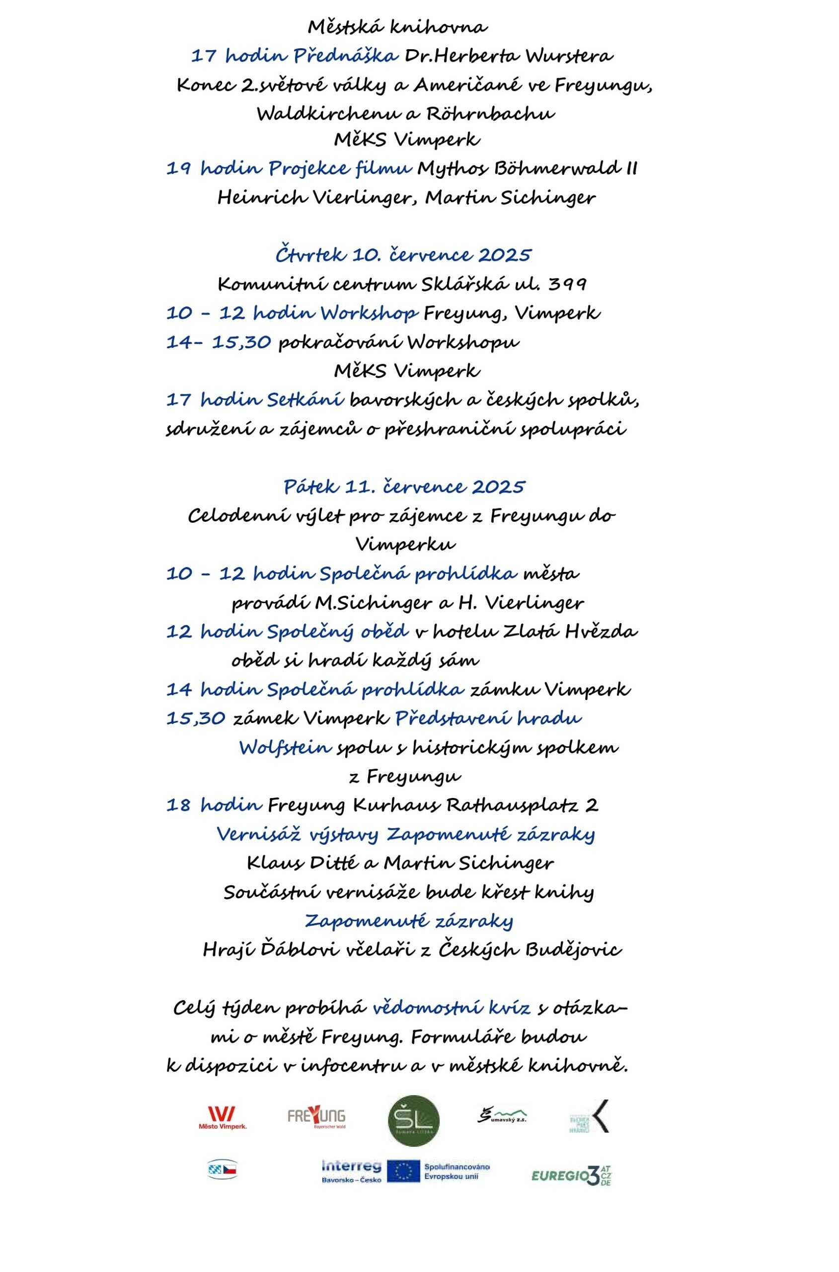 Celý týden bude akci doprovázet vědomostní kvíz o městě Freyung. Akce se koná za podpory města Vimperk, města Freyung a dalších partnerů z obou stran hranice.