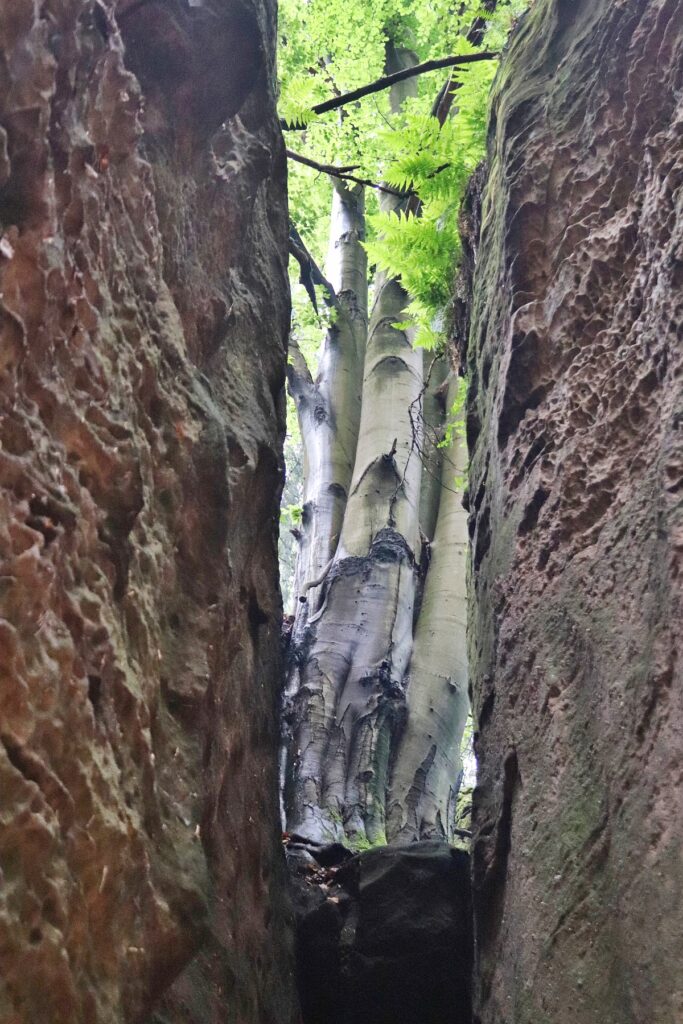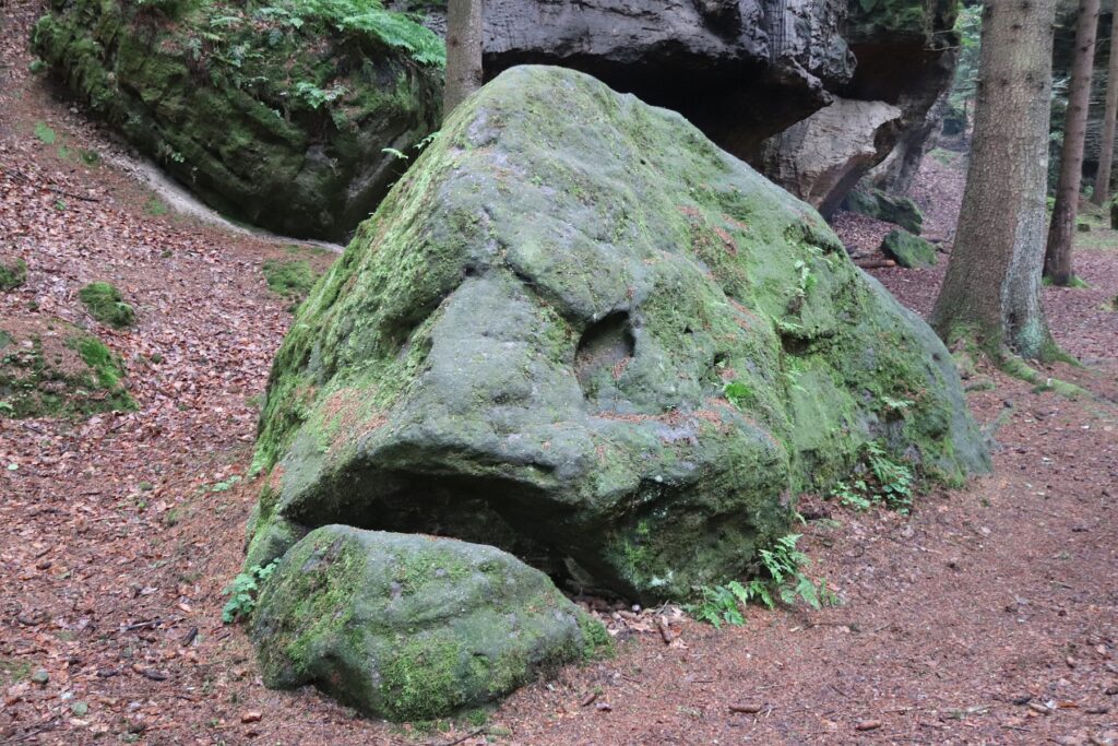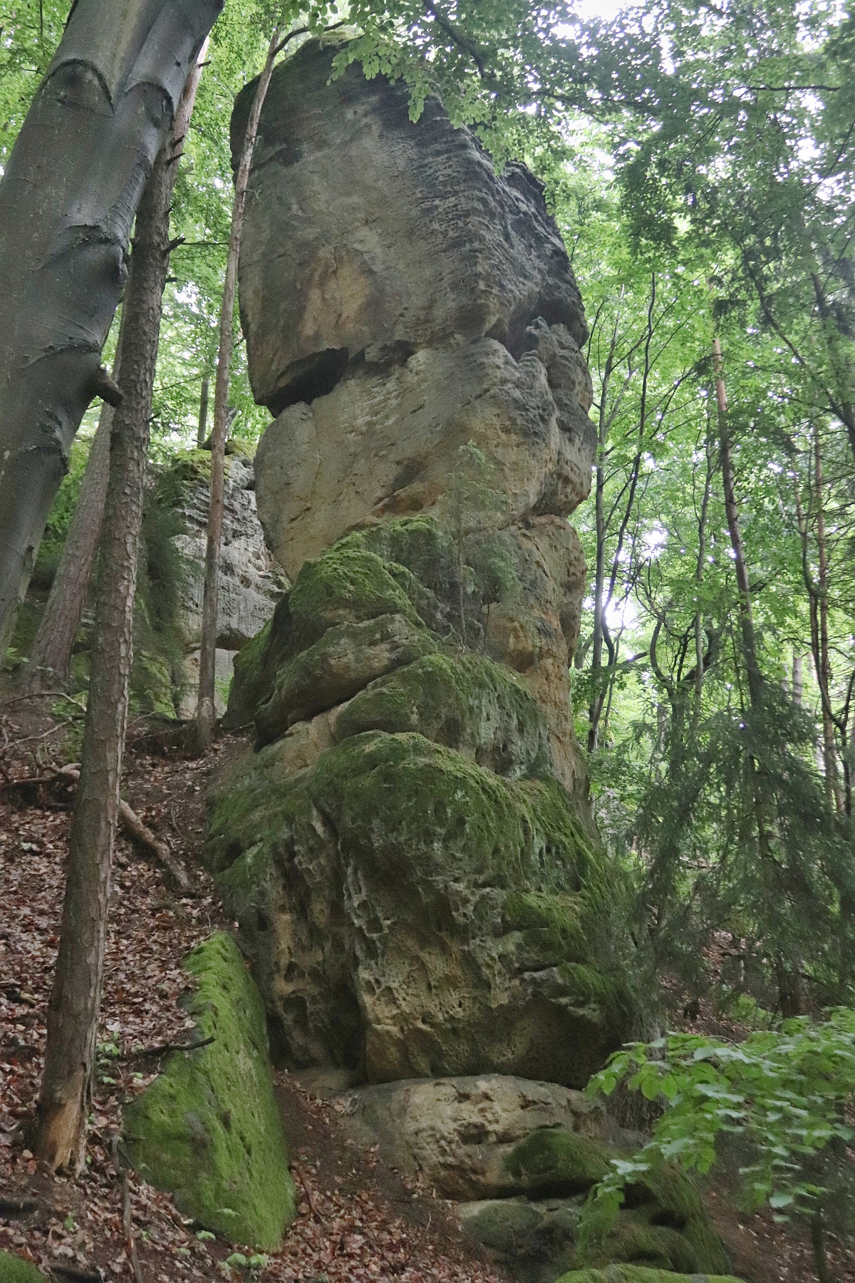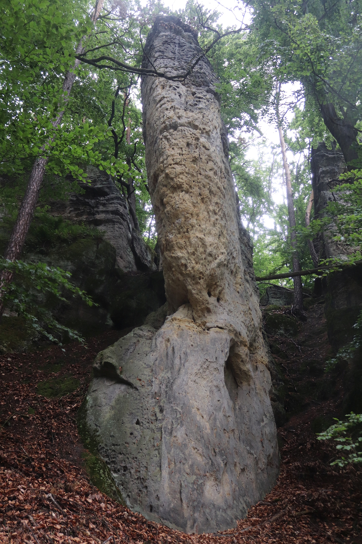 Touláme se Kokořínskem. Scházíme ze Střezijovic po žluté k věnci skal. Cesta traverzuje svah okolo pískovcových stěn, sloupů a bloků. Pod korunami buků se stmívá, to bouřkové mraky houstnou a brzy se rozšumí liják. Ozývají se hromy. Zprvu jsme v suchu, ale střecha lesa není dokonalá, krůpěje sklouzávají z listu na list a padají na nás. A pak les končí a na pasece jsme brzy promáčení skrz naskrz. U Bouřkové věže cestu raději opouštíme a scházíme hustou trávou do údolí. Rozbahněnou cestou se vracíme zpět ke Střezijovicím.