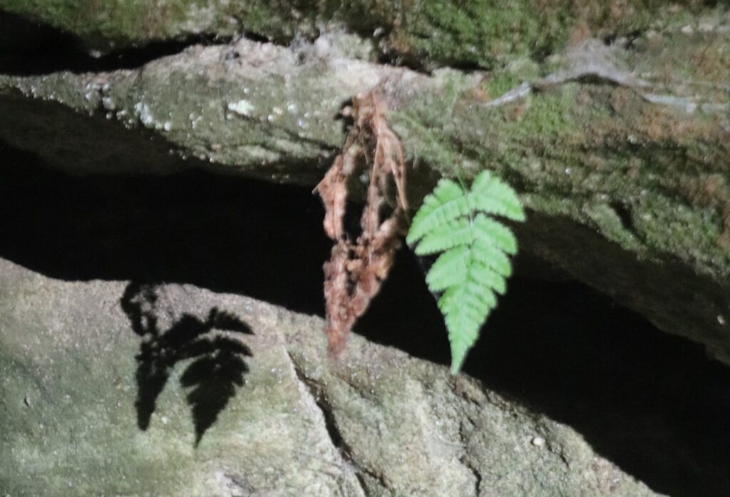 Svítání prosakuje do údolí už po třetí hodině. Krůpěje zvolna utichají, jejich cupitavý spěch uléhá u kořenů smrků. Mezi ptačími hlasy vyniká ten střízlíka. V ohništi žhnou ještě žhavé uhlíky, je snadné rozdělat oheň. Slunce proniká do údolí jen plaše, tu a tam ve sporých skvrnách, nahoře silněji hoří v kmenech borovic. Fotím stín kapradiny na skále. Vida, náš kemp hlídá kamenná piraňa. Vaříme si kávu. Patří to k obřadu spánků pod širou oblohou, jak mě poučuje Klubíčko. Uklízíme tábořiště a vracíme se k autu zaparkovanému u Střezijovic.